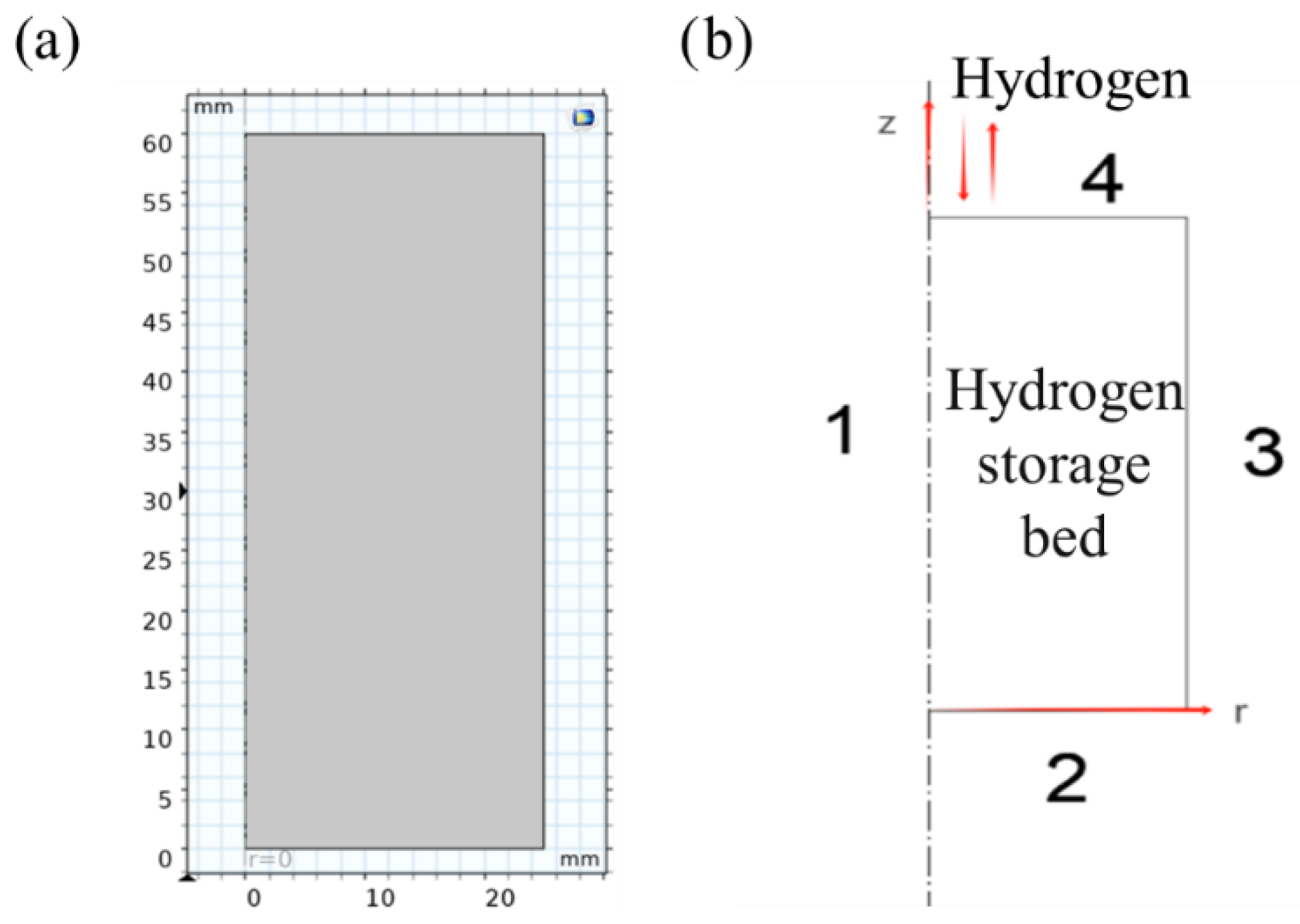 The hydrogen storage container established in this study is cylindrical. To investigate the influence of various parameters on hydrogen adsorption/desorption of the container, visually illustrate the impact of parameters on the hydrogen adsorption/desorption rate, and accelerate the calculation speed, the three-dimensional cylinder is simplified into a two-dimensional axisymmetric model, as shown in