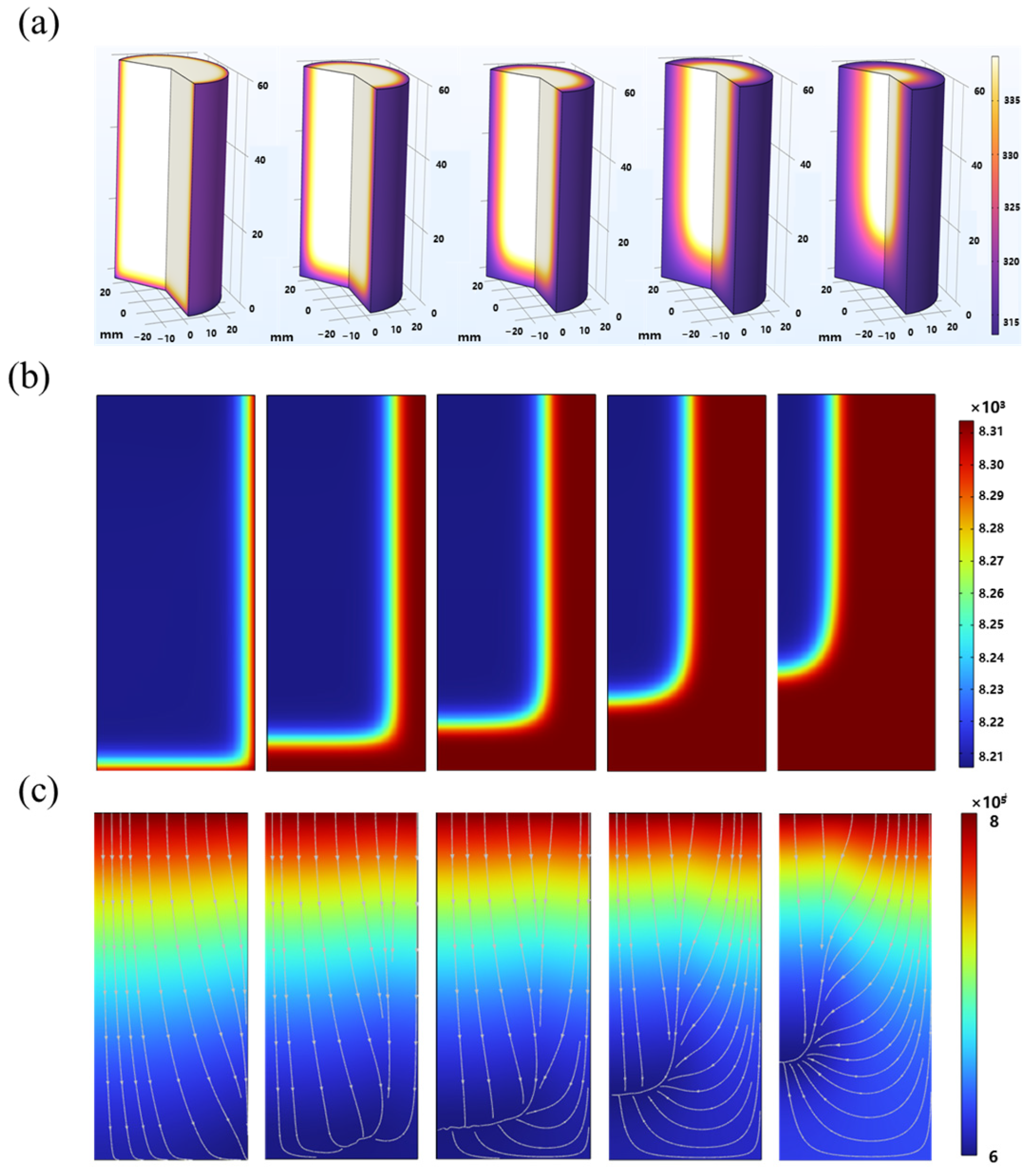(a) Temperature change inside the container (°C), (b) density change in the tank body (kg/m3), (c) flow change of hydrogen pressure (Pa).