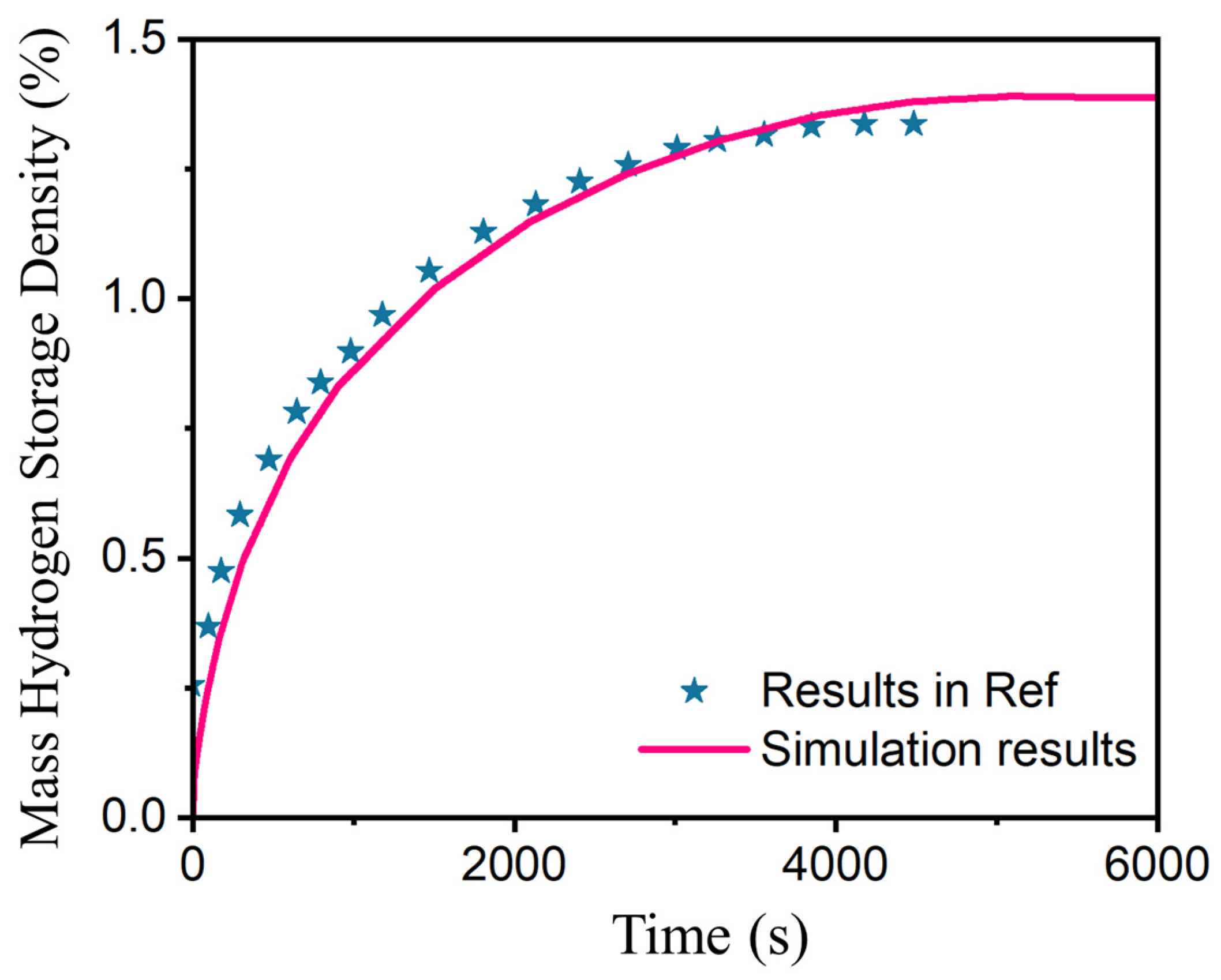 During the hydrogen adsorption/desorption process in the hydrogen storage tank, a parameter of mass hydrogen storage density (wt%) is introduced to characterize the hydrogen adsorption amount. The equation for wt% is shown in Equation (14):