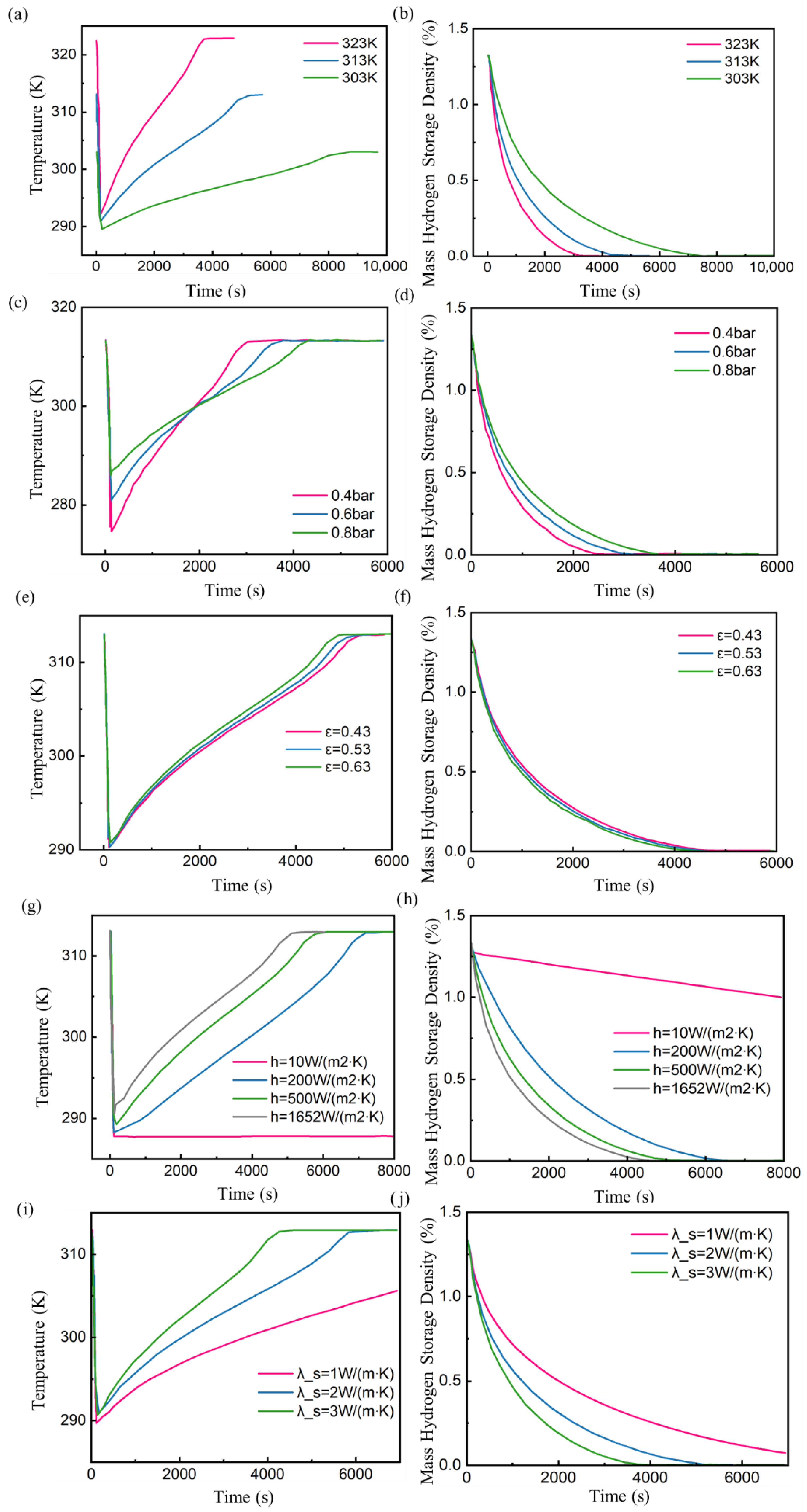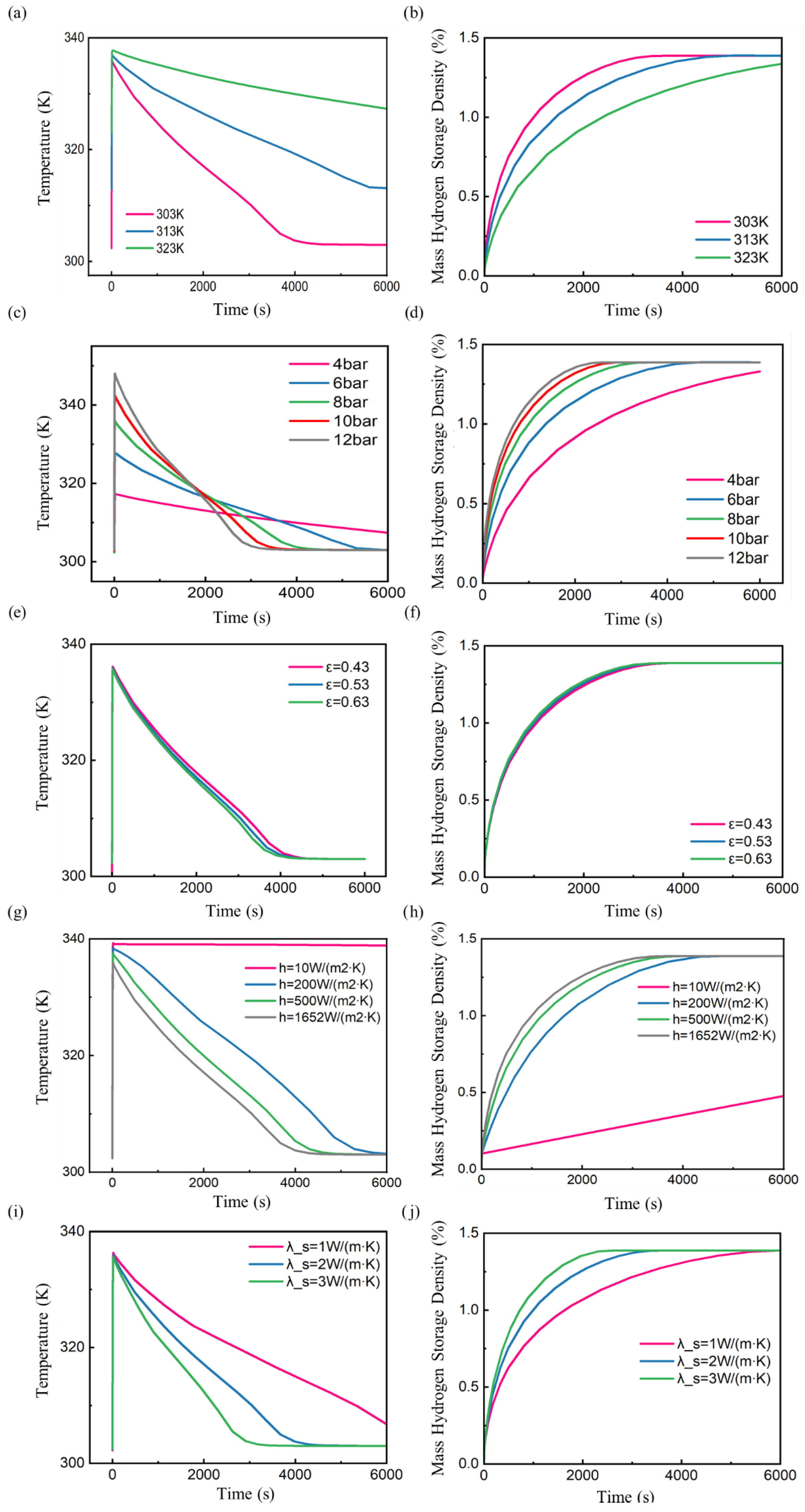 (a) Temperature variation and (b) variation in mass hydrogen storage density at different initial temperatures; (c) temperature variation and (d) variation in mass hydrogen storage density under different pressures; (e) temperature variation and (f) variation in mass hydrogen storage density at different porosities; (g) temperature variation and (h) variation in mass hydrogen storage density under different convective heat transfer coefficients; (i) temperature variation and (j) variation in mass hydrogen storage density for different alloy thermal conductivities.