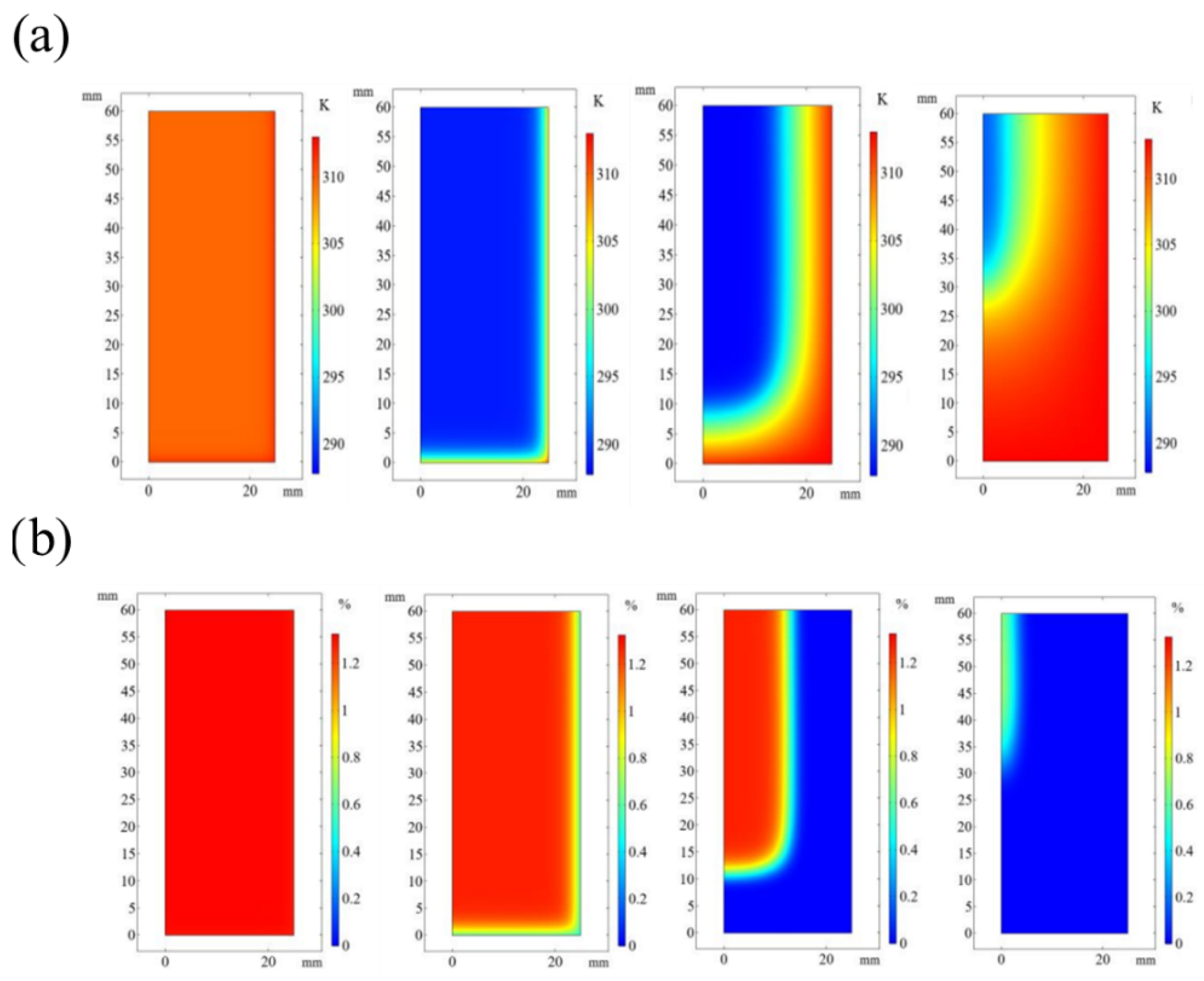 (a) Temperature contour changes during hydrogen desorption, (b) variation of hydrogen storage capacity during hydrogen desorption (from left to right: 20 s, 200 s, 2000 s, 4000 s).