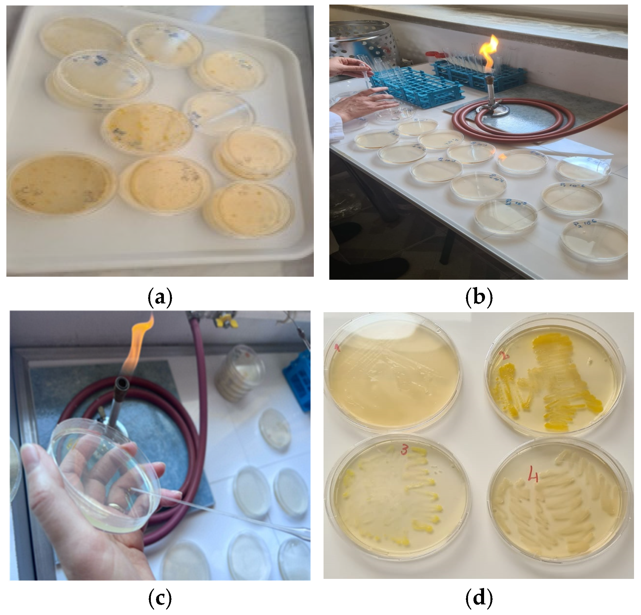 2.2. Quantitative Determination of Poultry Wastewater Microbiota and Isolation in Pure Culture of B1–B4 Bacterial Strains
