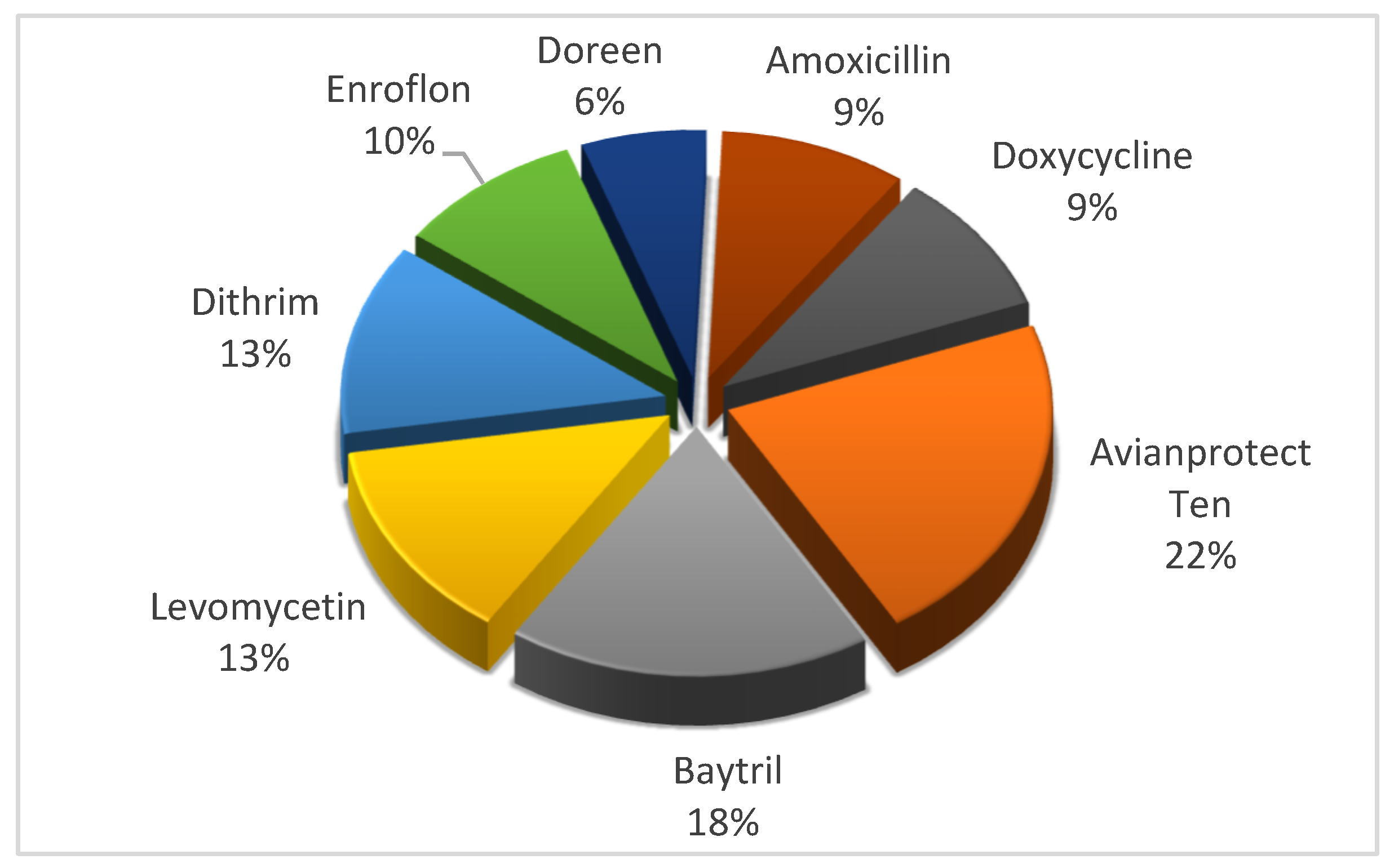 Analysis of the responses revealed that antibiotics are most frequently used both for disease treatment and prevention during chick rearing. Among the products available on the market at the time of the survey, the most commonly used were as follows: Avianprotect Ten 22% (Romvac Company S.A., Ilfov, Romania), Baytril 18% (Bayer, Berlin, Germany), Levomycetin 13% (Gonane Pharma, Ahmedabad, India), Dithrim 13% (ZAO-NitaFarrn, Saratov, Russia), Enroflon 10% (VIC Group, Moscow, Russia), Doreen 6% (Janssen Pharmaceutica, Beerse, Belgium), Amoxicillin 9% (S.C. Antibiotice S.A., Iasi, Romania), and Doxycycline 9% (S.C. Antibiotice S.A., Iasi, Romania). These findings indicate that the Romanian market offers a wide range of international products from which respondents make their choices.