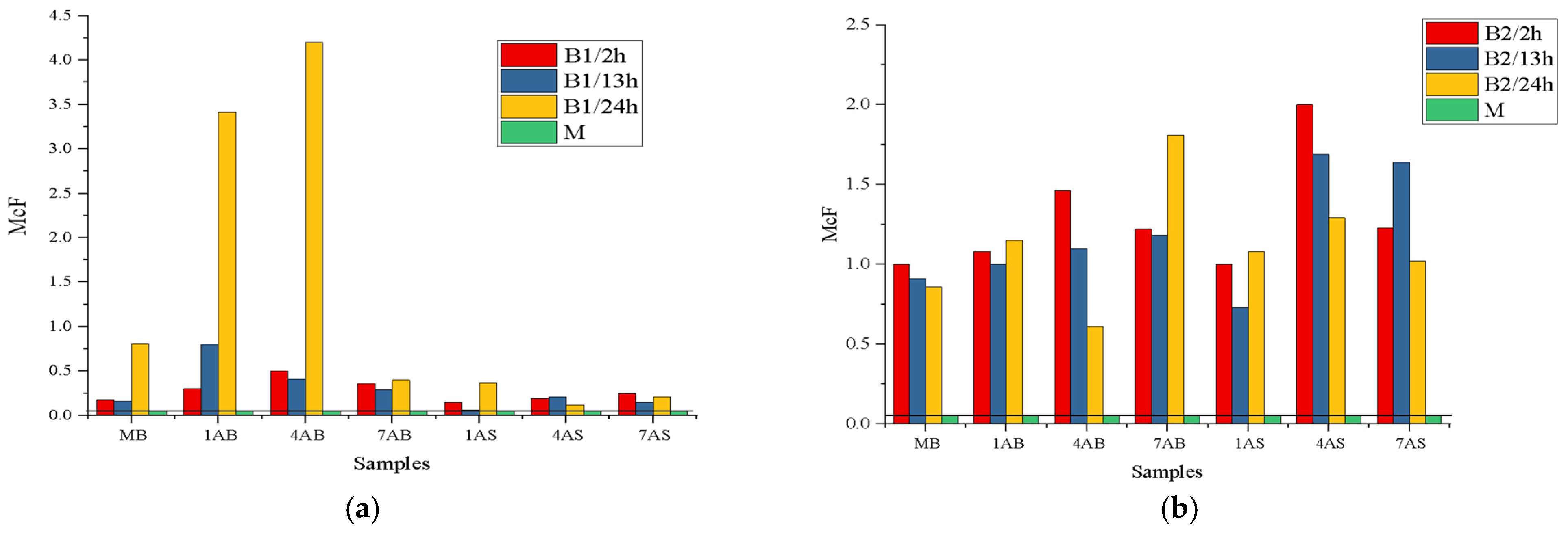The quantitative consistency of B1–B4 bacterial strains after exposure to AB or AS substances is presented in