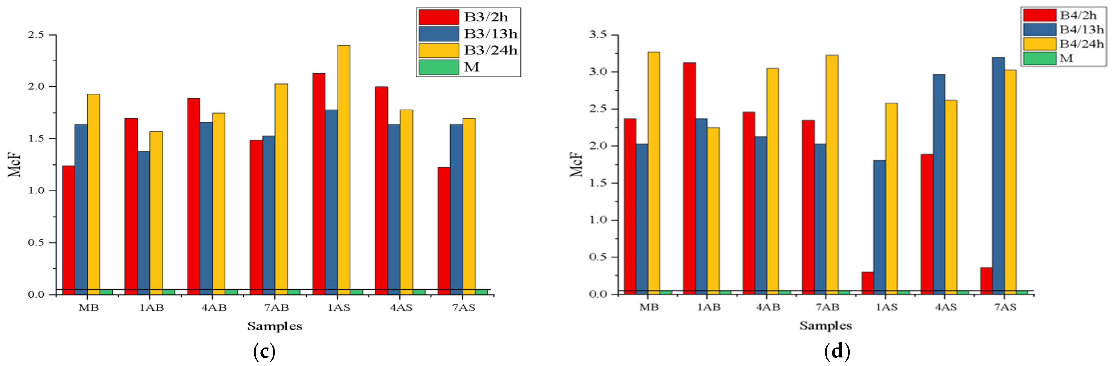 Figure 6 reflect the combined influence of the concentration of antimicrobial substances and the duration of their action on bacterial strains isolated in pure culture (B1–B4).