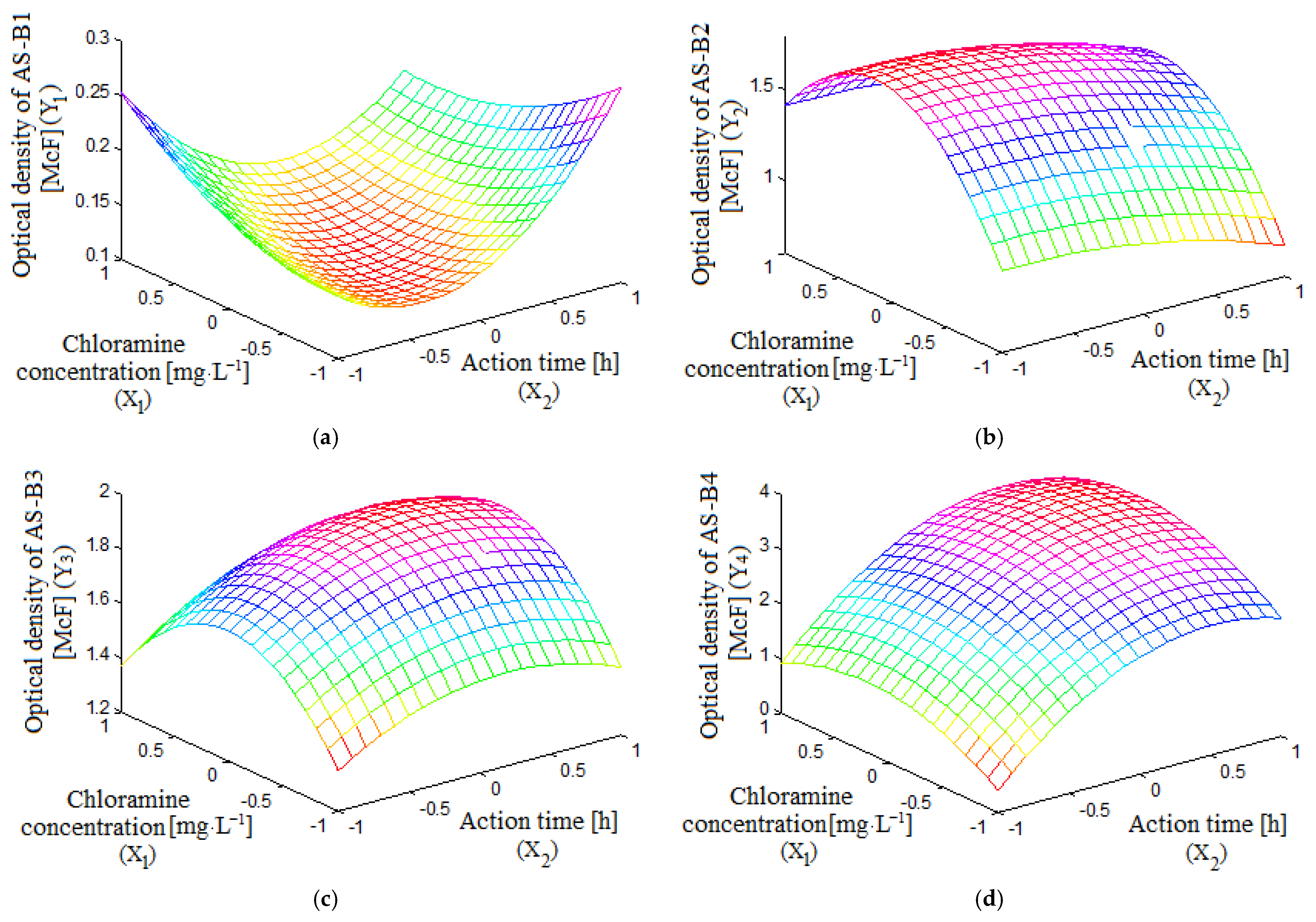 Overall, chloramine-based models (AS-B1 to AS-B4) generally exhibited positive main effects and, in most cases, favorable interactions, leading to response surfaces characterized by maxima or minima depending on the quadratic term signs. Antibiotic-based models showed greater variability, including saddle-shaped surfaces for AB-B1 and AB-B3 due to opposite quadratic signs, highlighting the complexity of factor interactions in these systems. These findings align with previous studies employing RSM for microbial process optimization, where curvature and interaction effects were essential for identifying true optima rather than relying on experimental maxima. Furthermore, the variability observed in antibiotic-based models, including saddle-shaped surfaces for AB-B1 and AB-B3, reflects the complexity of antimicrobial interactions, which is consistent with reports on non-linear dose–response relationships in microbial systems [