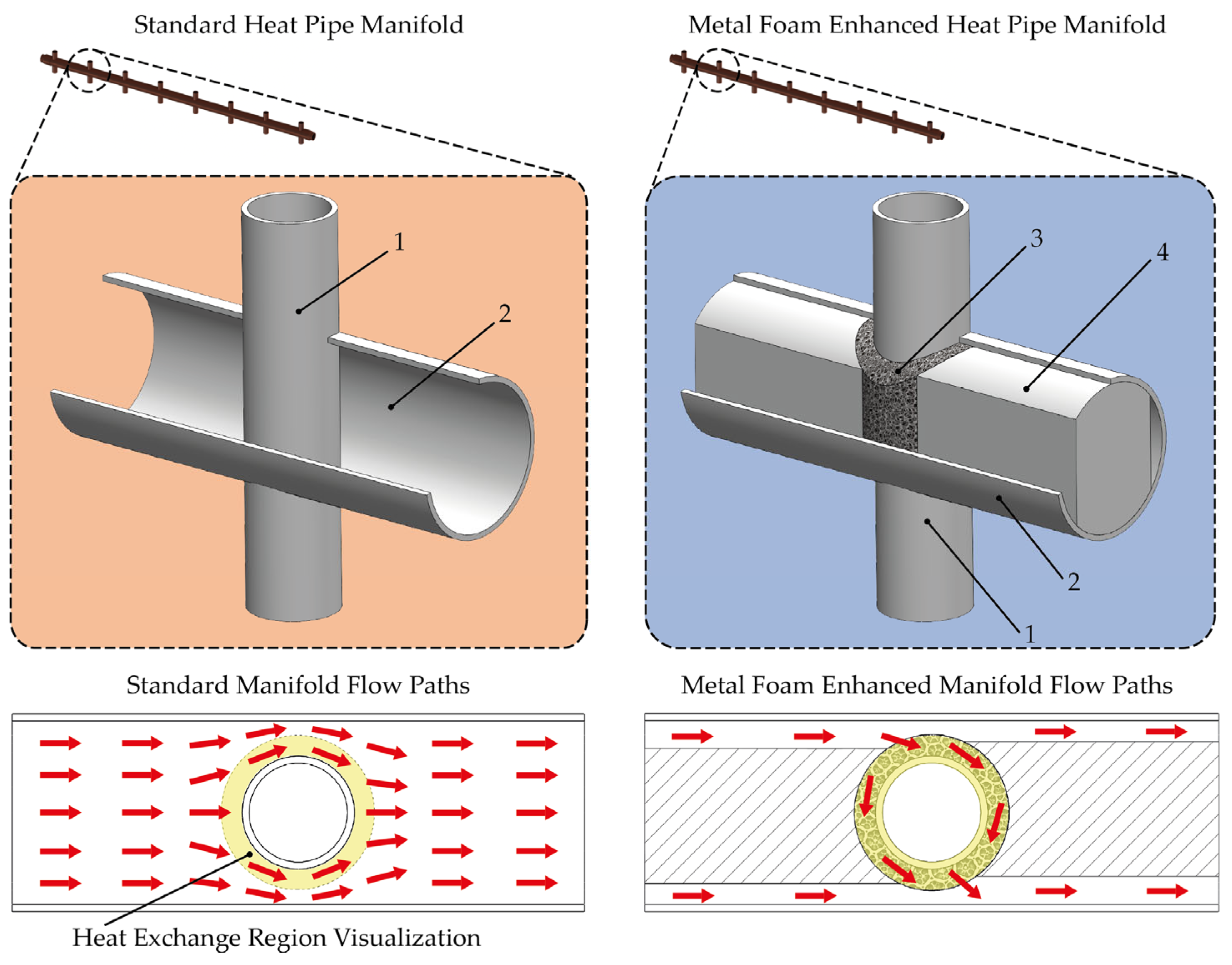 Figure 1 schematically compares the standard design with the modified design featuring an integrated heat-exchange chamber composed of metal foam and foam-glass blocks. The proposed design preserves the same external dimensions of the manifold as well as an identical geometric volume of the heat-exchange region, while fundamentally altering its internal architecture.
