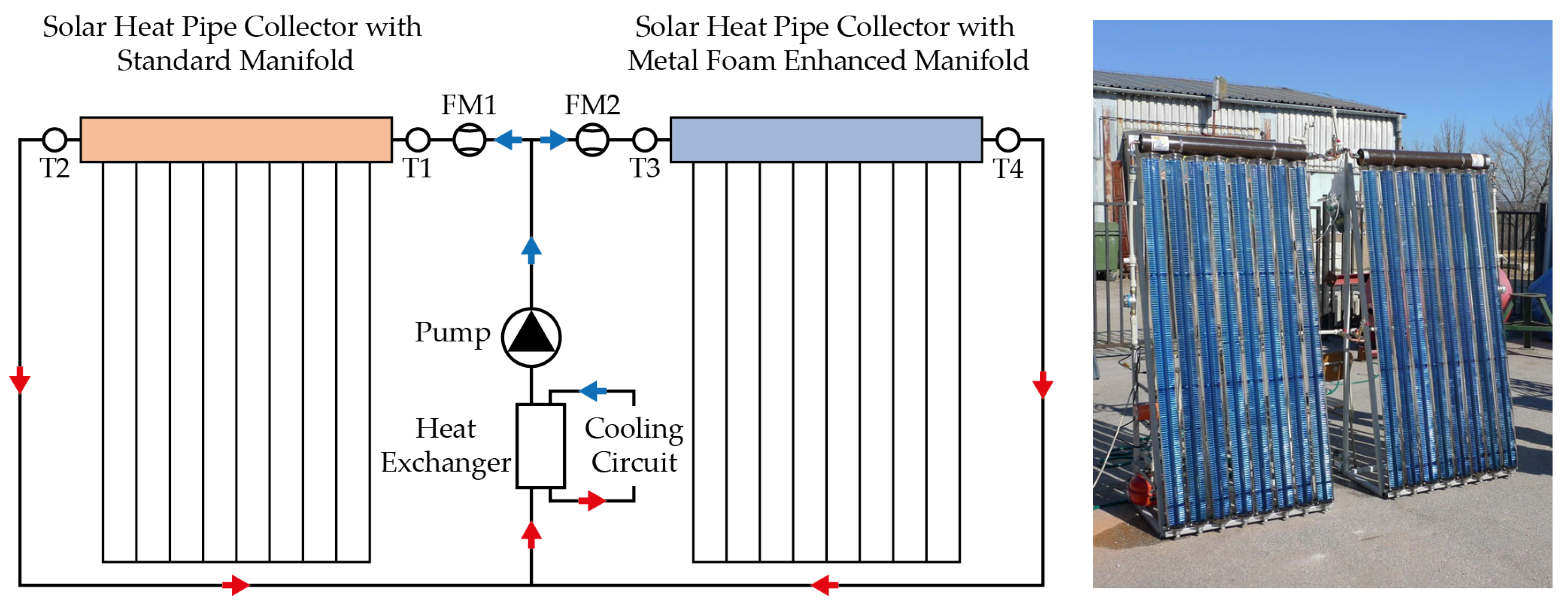 Although the modified exotic materials or manufacturing techniques, the metal foam inserts and foam-glass blocks used in the prototype are commercially available products, while the manifold body itself can be manufactured using standard forming and joining processes commonly employed in solar collector production. Importantly, the proposed modification is confined to the manifold region and does not require changes to the evacuated tubes, absorbers, or external collector geometry. This modularity supports reproducibility and scalability, as the metal foam elements can be pre-fabricated and assembled using established production workflows. Although a detailed cost analysis was not within the scope of the present study, the limited increase in component complexity suggests that the proposed design is compatible with industrial-scale manufacturing and warrants further techno-economic evaluation.