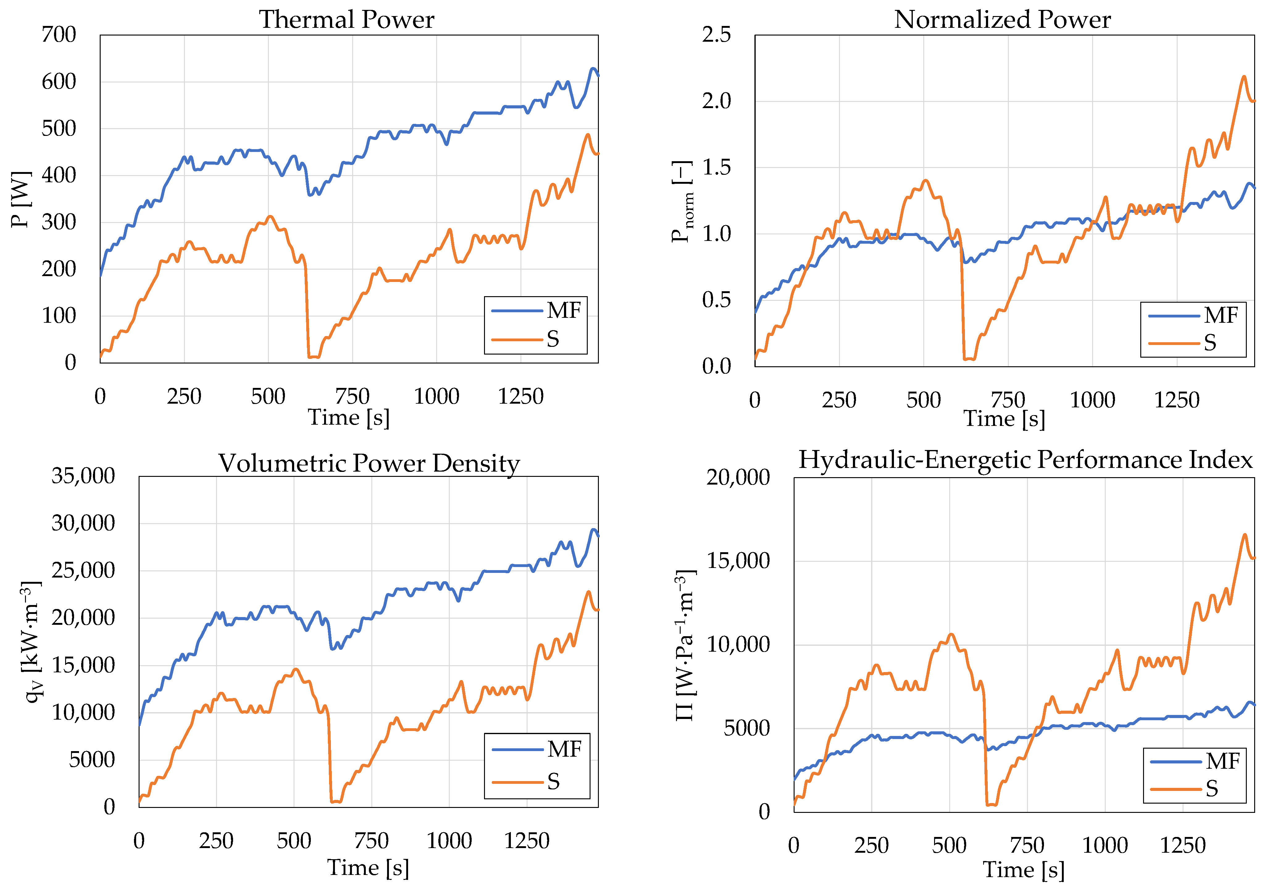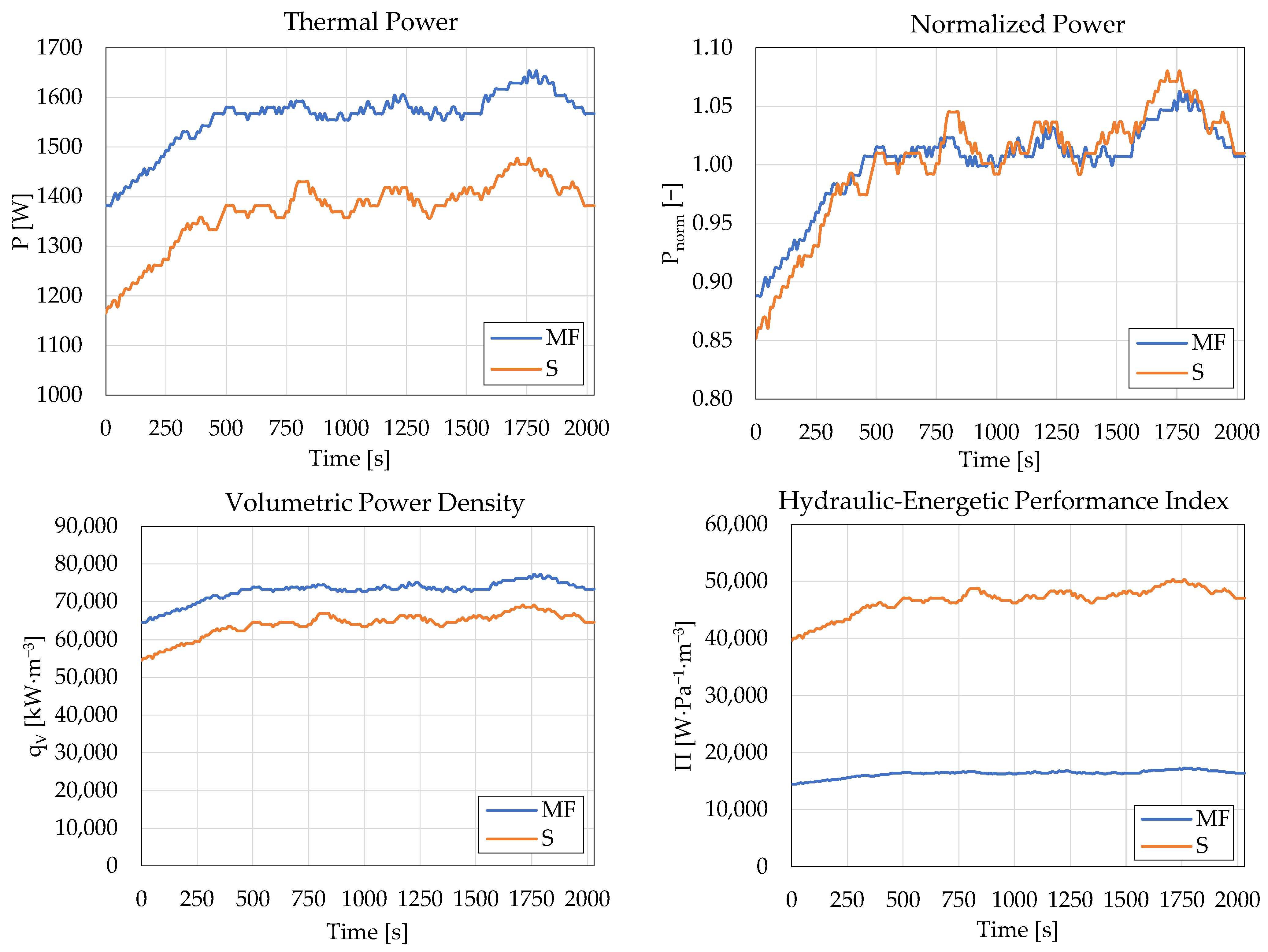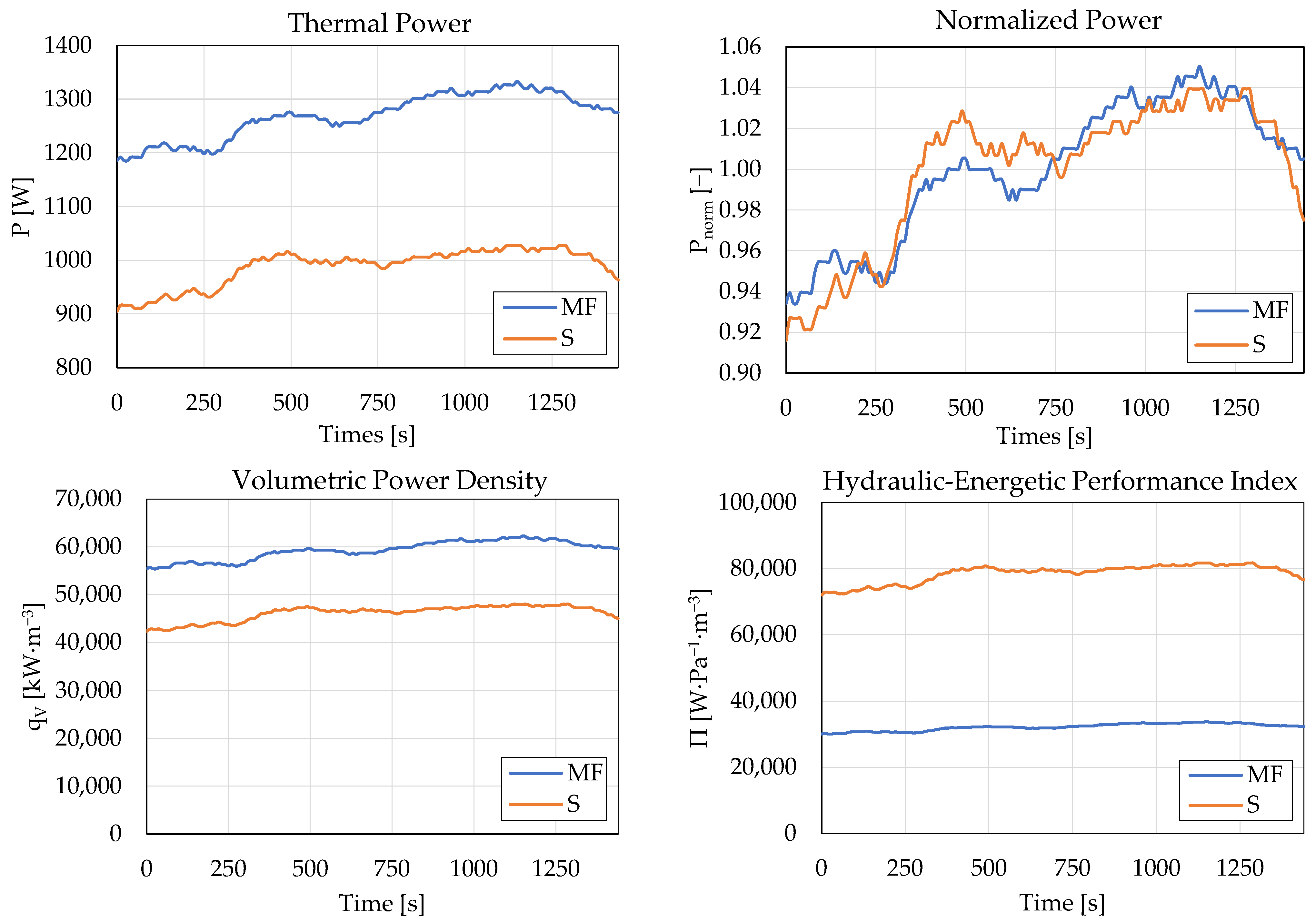 For each experiment, the following time-dependent parameters were evaluated from the measured data: Thermal Power P(t) [W], Normalized Power Pnorm(t) [–], Volumetric Power Density qV(t) [kW·m−3], Hydraulic–Energetic Performance Index Π(t) [W·Pa−1·m−3] and Time derivative of thermal power dP/dt(t) [W·s−1].