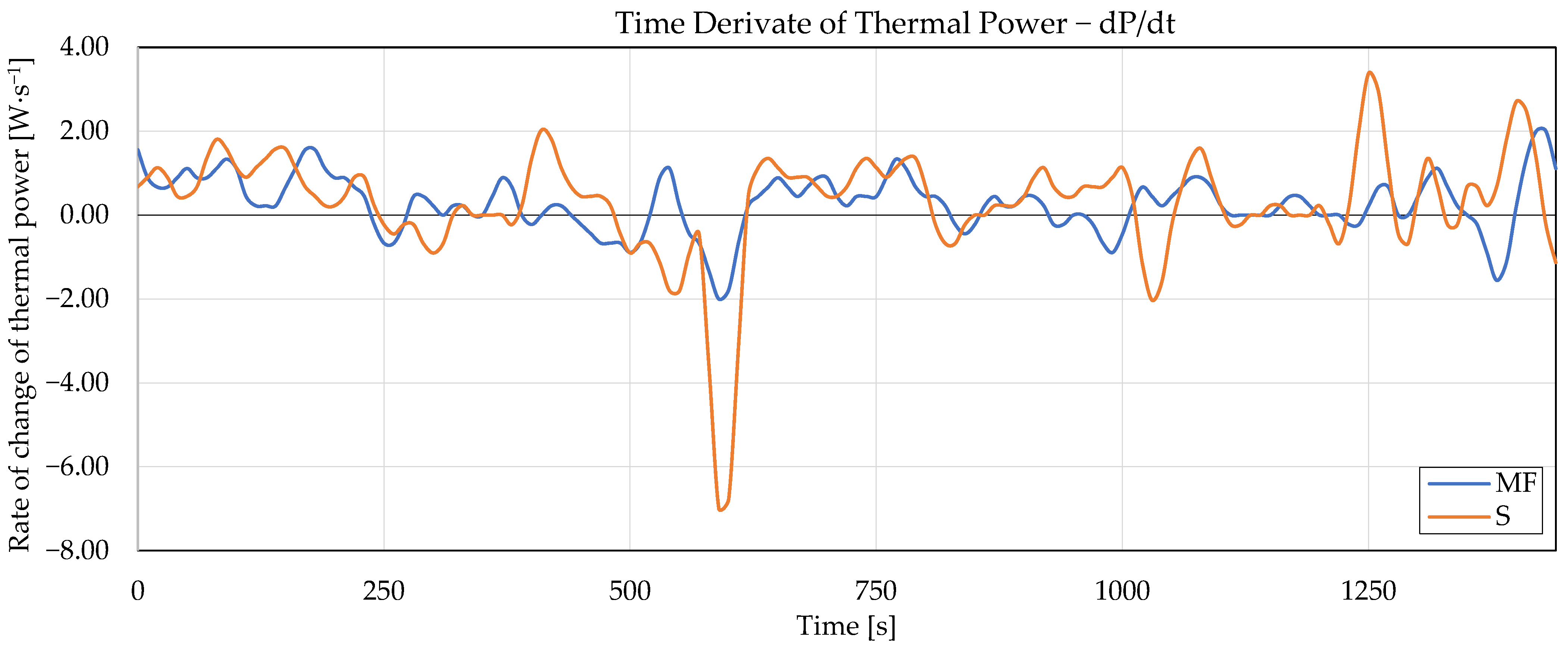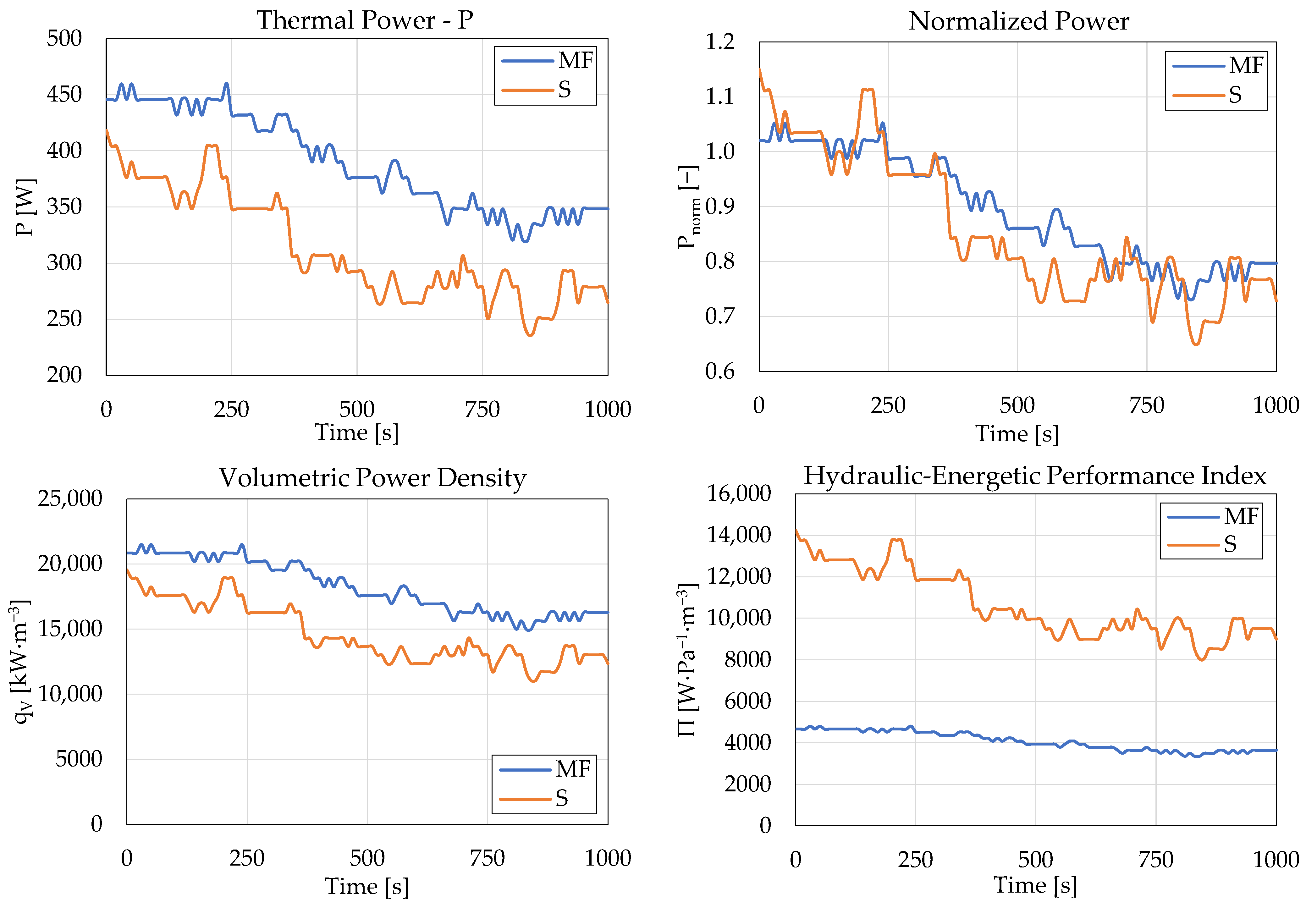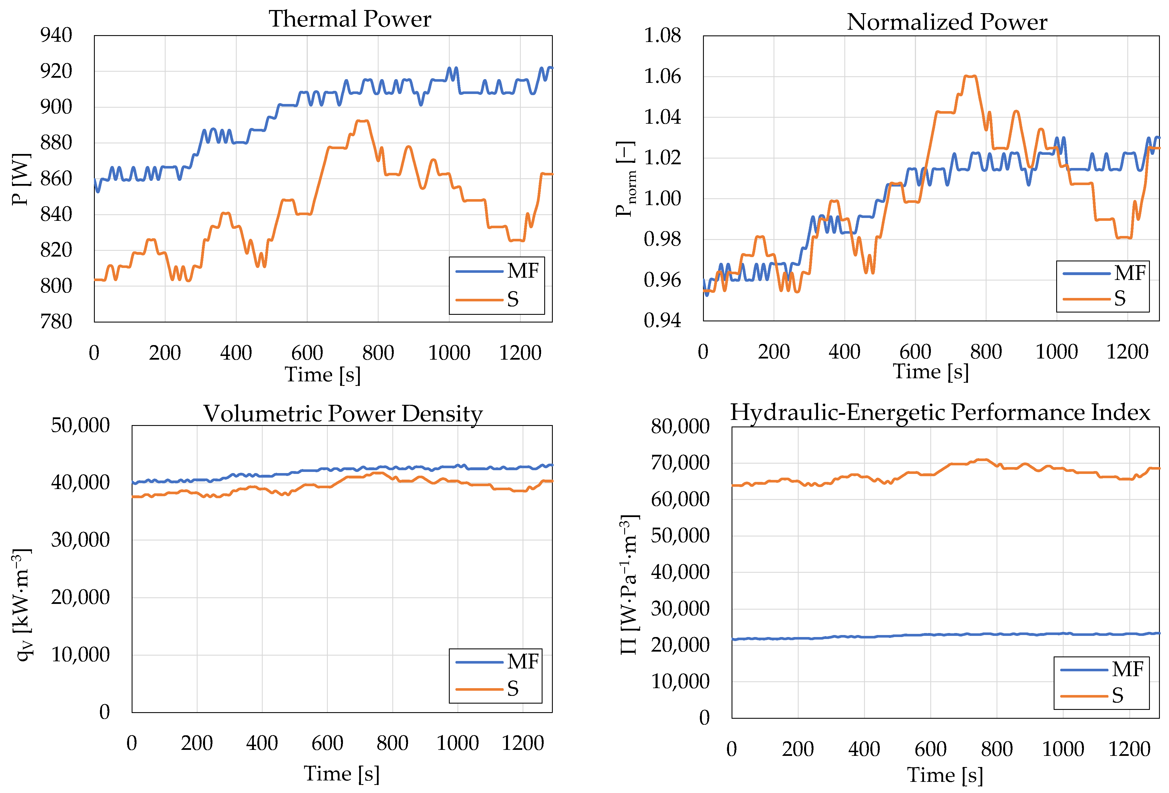 For each experiment, the following time-dependent parameters were evaluated from the measured data: Thermal Power P(t) [W], Normalized Power Pnorm(t) [–], Volumetric Power Density qV(t) [kW·m−3], Hydraulic–Energetic Performance Index Π(t) [W·Pa−1·m−3] and Time derivative of thermal power dP/dt(t) [W·s−1].