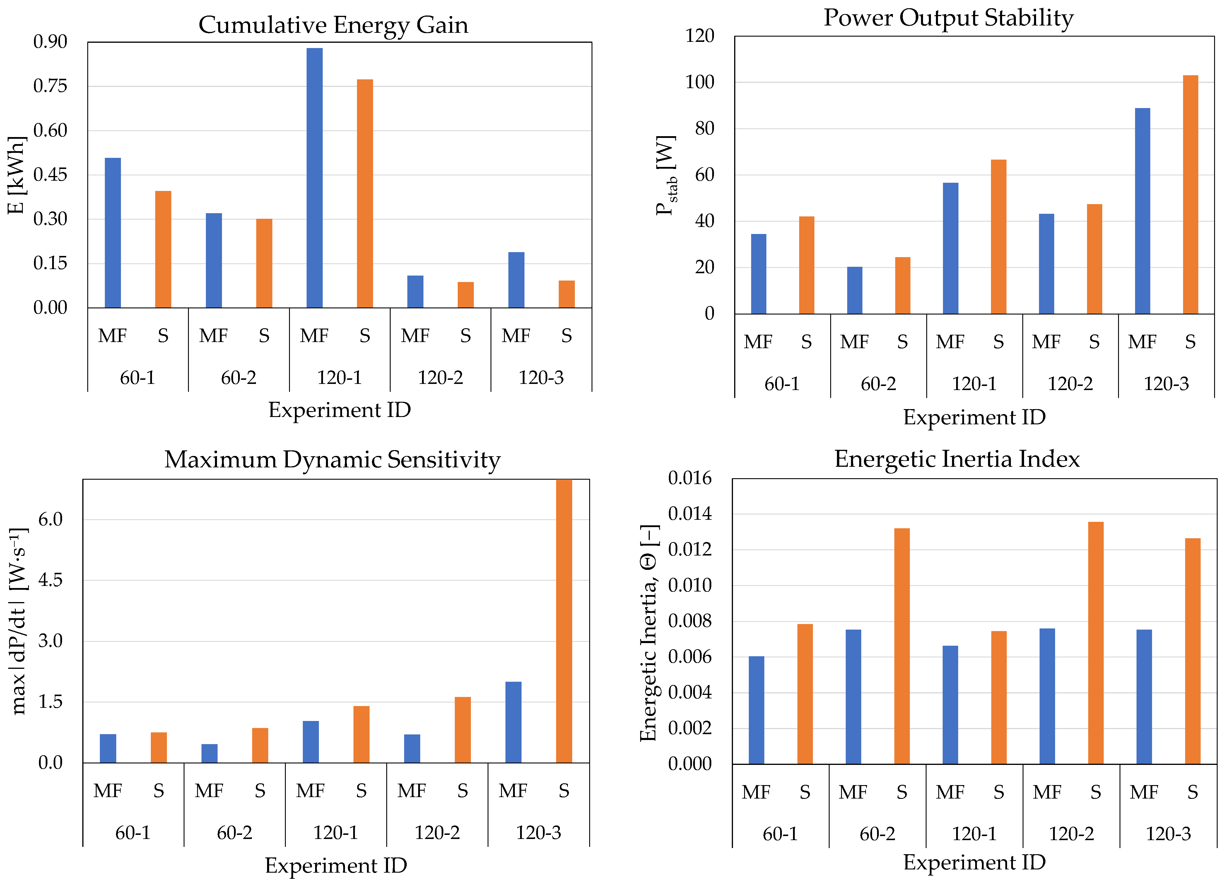 Figure 11). In experiment 120-3, occasional intervals can be observed where the hydraulic–energetic performance index of the standard collector locally drops below that of the MF collector. This behavior is a direct consequence of the strongly transient operating conditions and the definition of the index as a ratio between instantaneous thermal power and pressure drop. During abrupt irradiance fluctuations, the standard collector exhibits pronounced short-term power excursions and rapid power decay, which temporarily reduces the index. In contrast, the MF collector maintains a smoother power response and non-zero output, resulting in a more stable index evolution. These short-term crossings are therefore transient in nature and do not alter the overall performance trend.