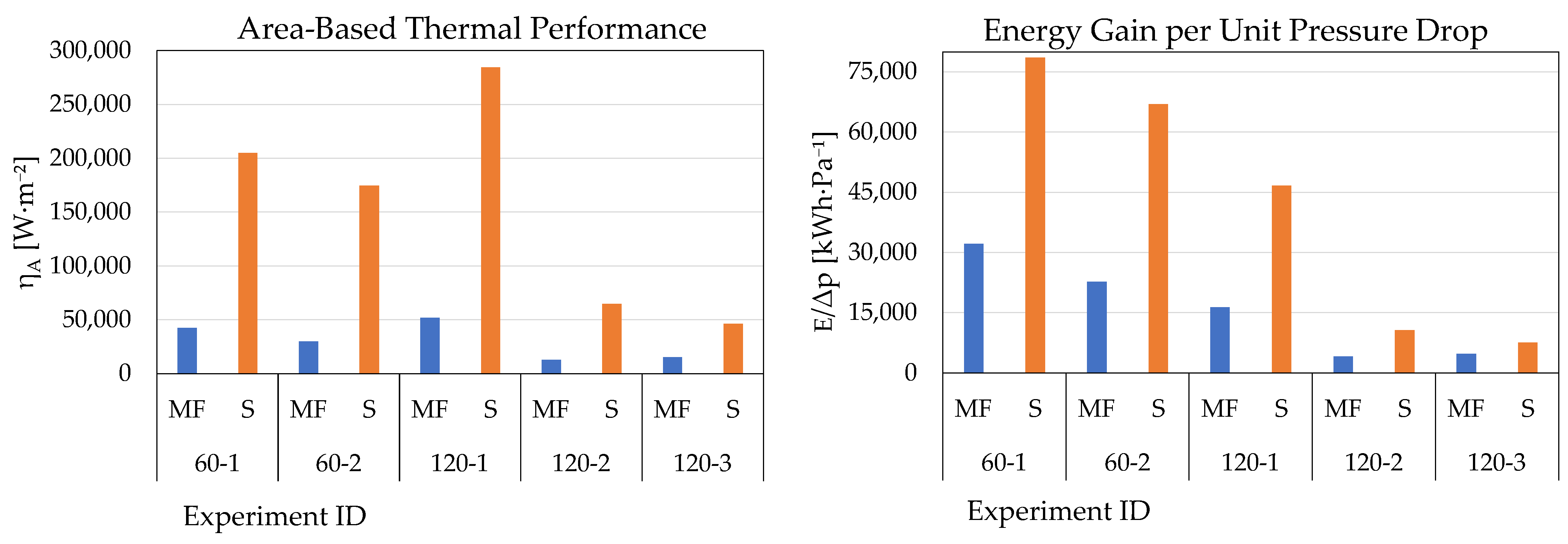 Figure 14 clearly show that the modified collector exhibits poorer values of indicators related to pressure loss, specifically the area-based thermal performance η