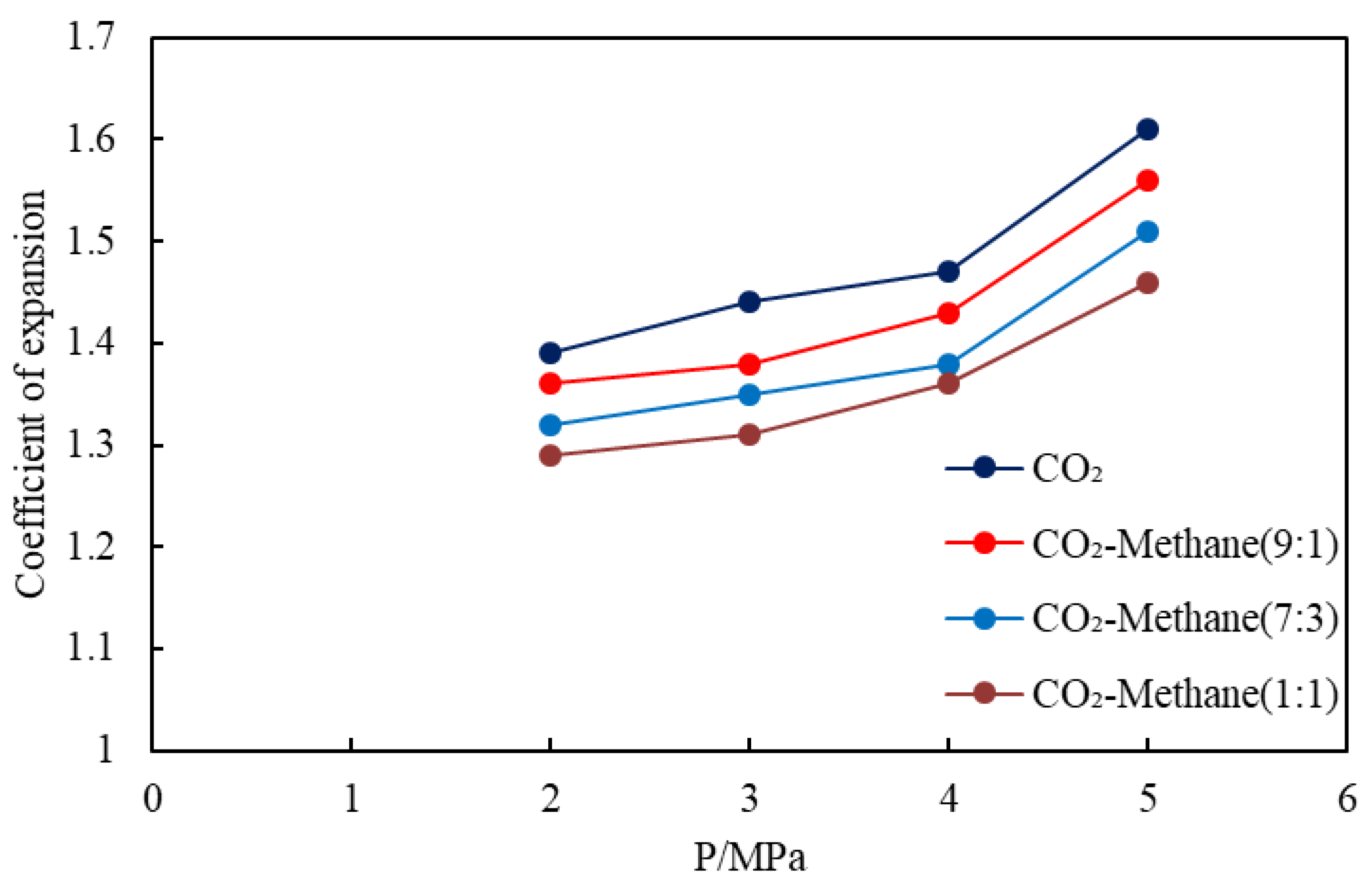 - Under the same pressure conditions, CO2 can enhance the expansion coefficient of CO2 in the simulation system. As the CO2 content increases, the expansion capacity of CO2 gradually rises. Compared with the expansion coefficient of CO2 when the CO2-CH4 ratio is 1:1, pure CO2 can increase the expansion coefficient by 0.15.