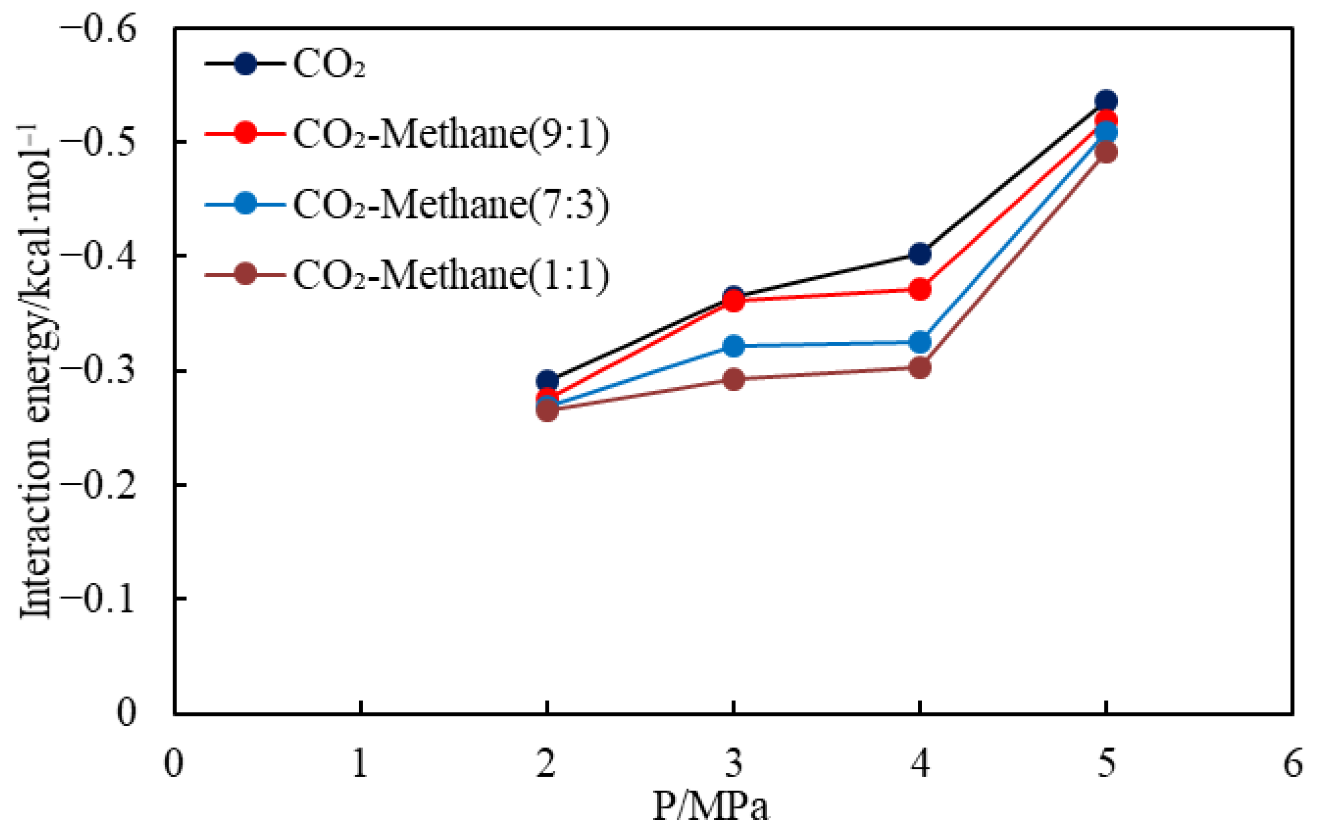 - The interaction energy between the injected fluid and CO2 is positively related to system pressure. CO2 can enhance gas–oil molecular interactions between injected fluid molecules and CO2 molecules and increase the interaction energy between oil and gas molecules, thereby enhancing the expansion coefficient of CO2 and improving its flow capacity.