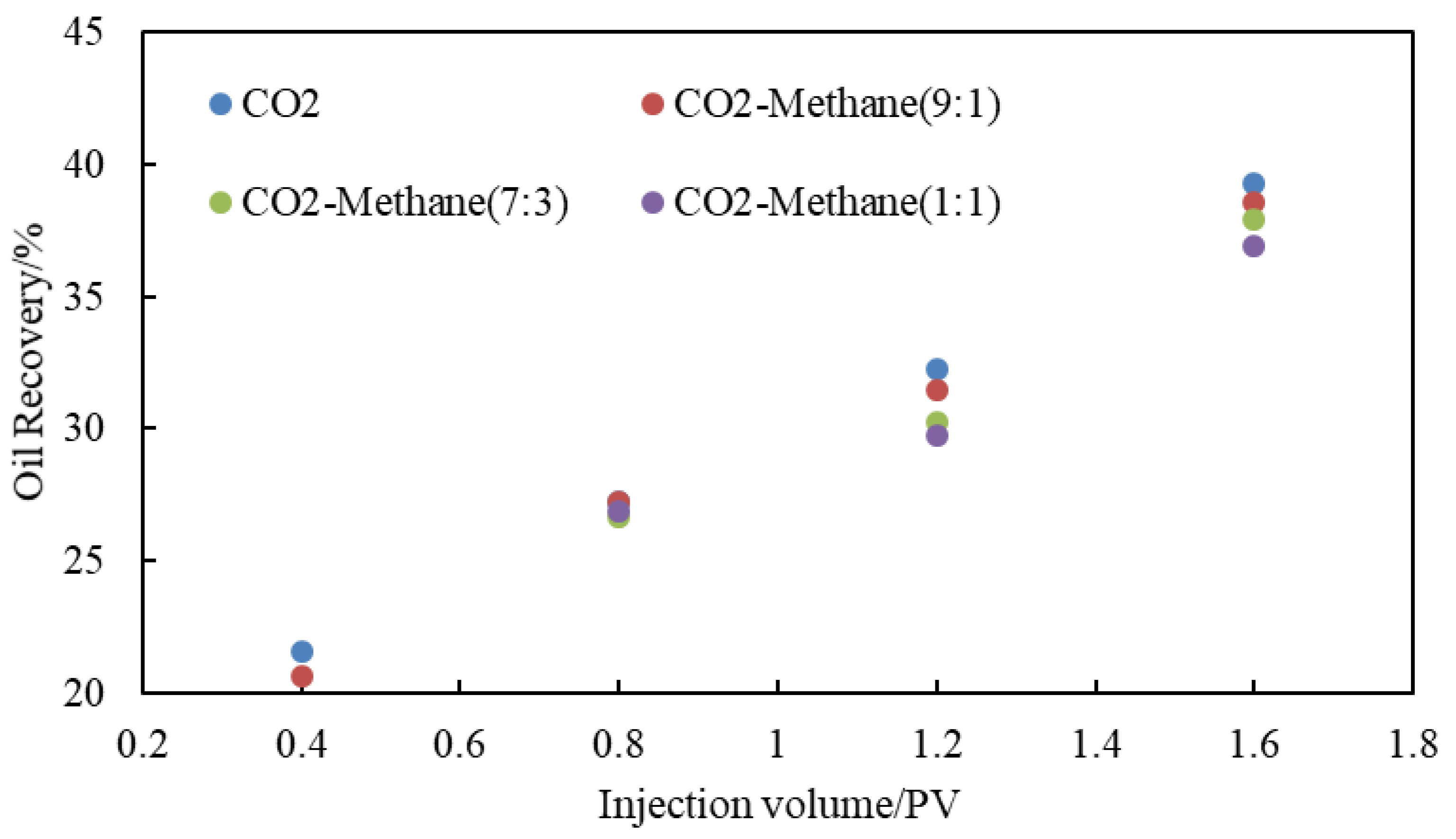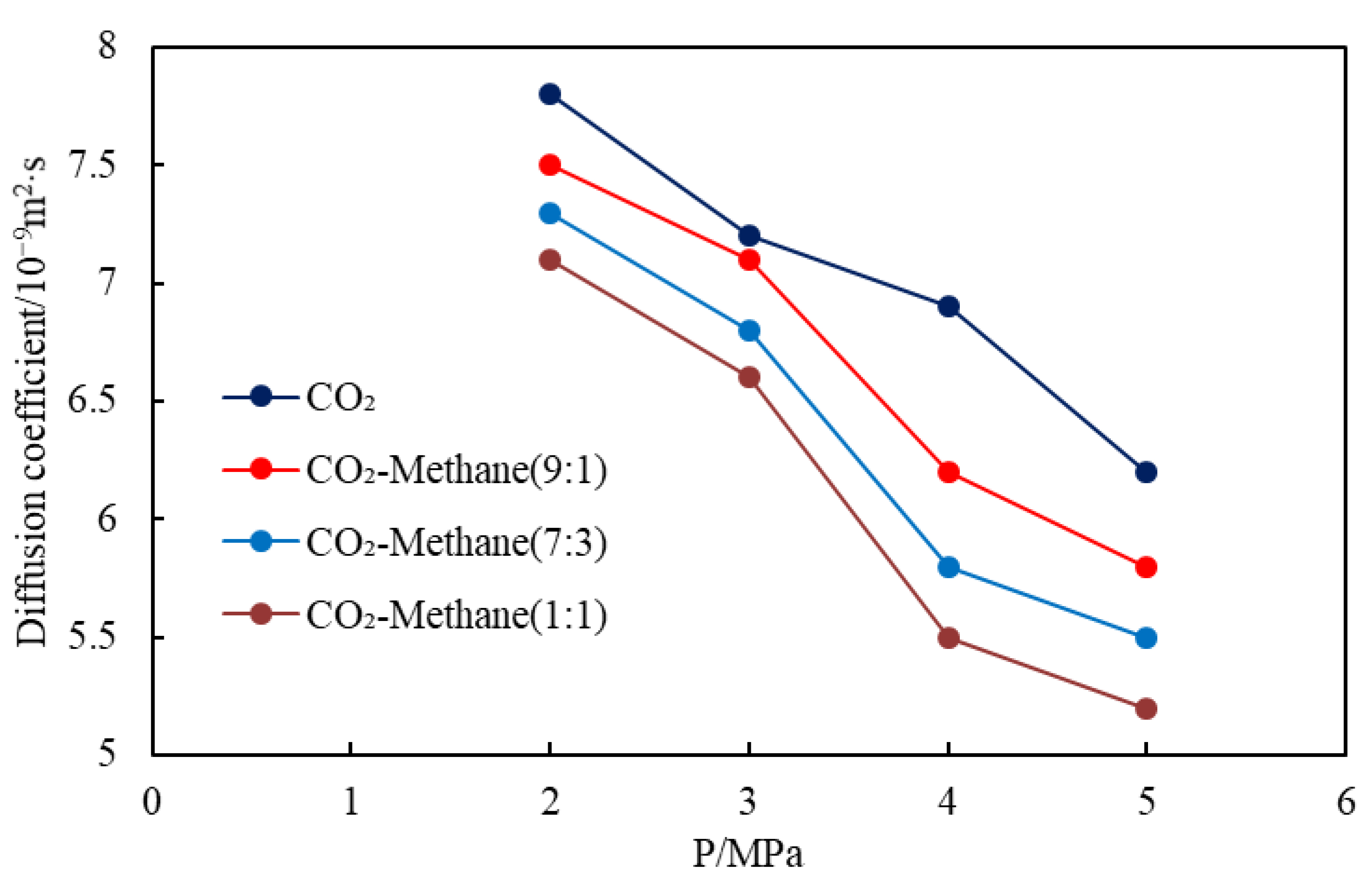 - CO2 can accelerate the solubility of mixed fluids in CO2. Compared with the CO2-CH4 system, the pure CO2 crude oil system has a larger gas diffusion coefficient, which can more effectively improve CO2 utilization.