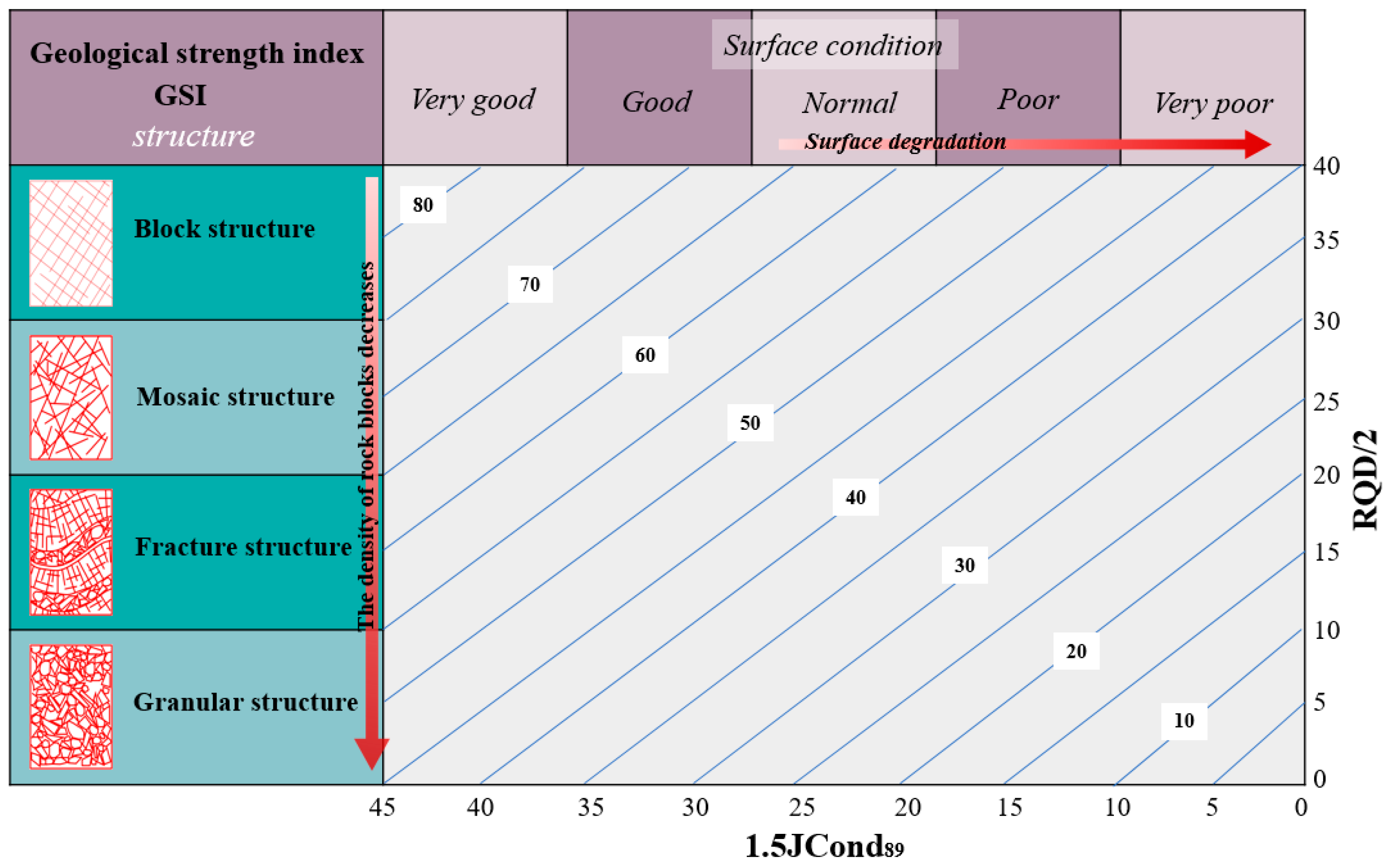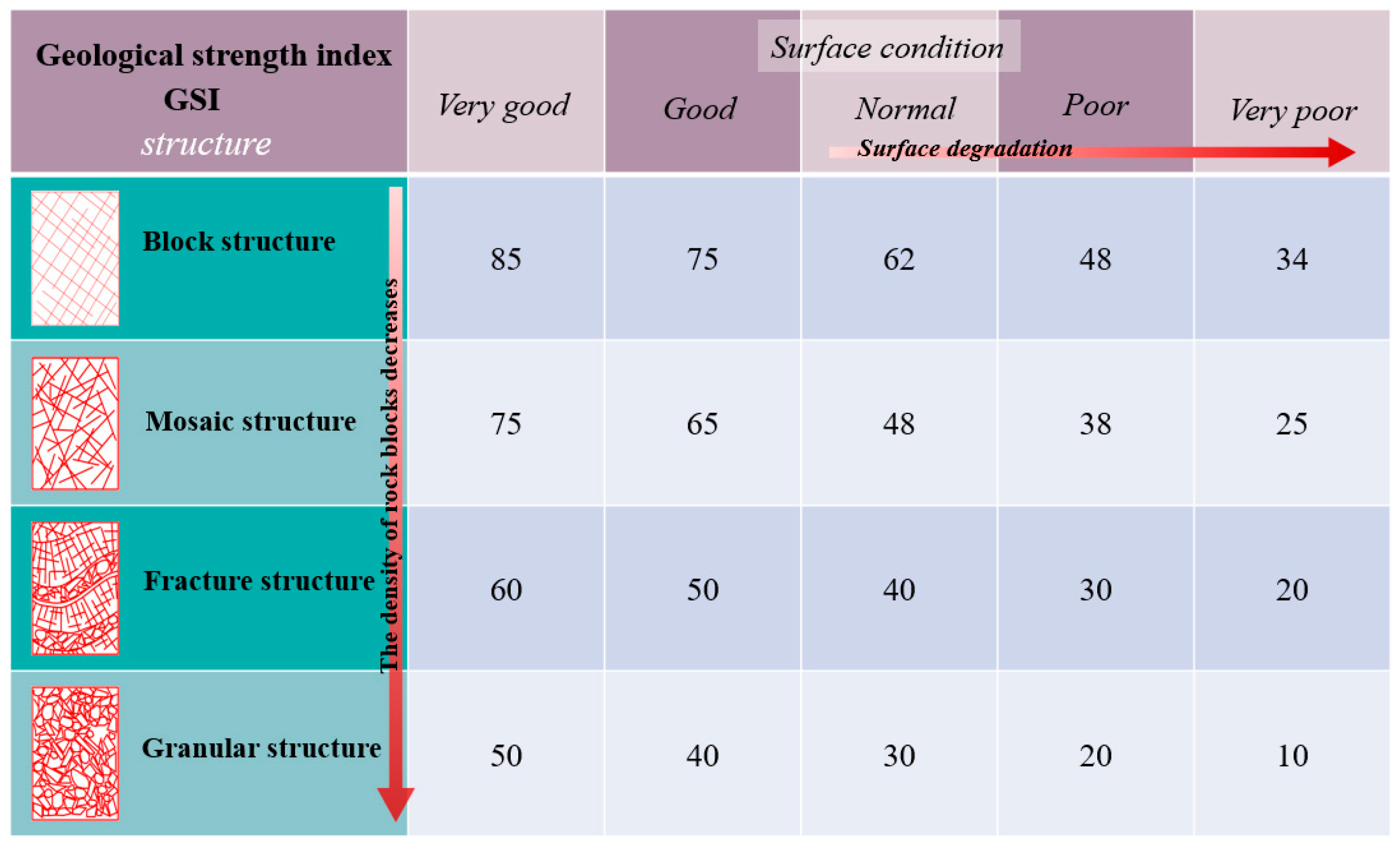 and the GSI quantification chart for classifying rock mass structures. The values for