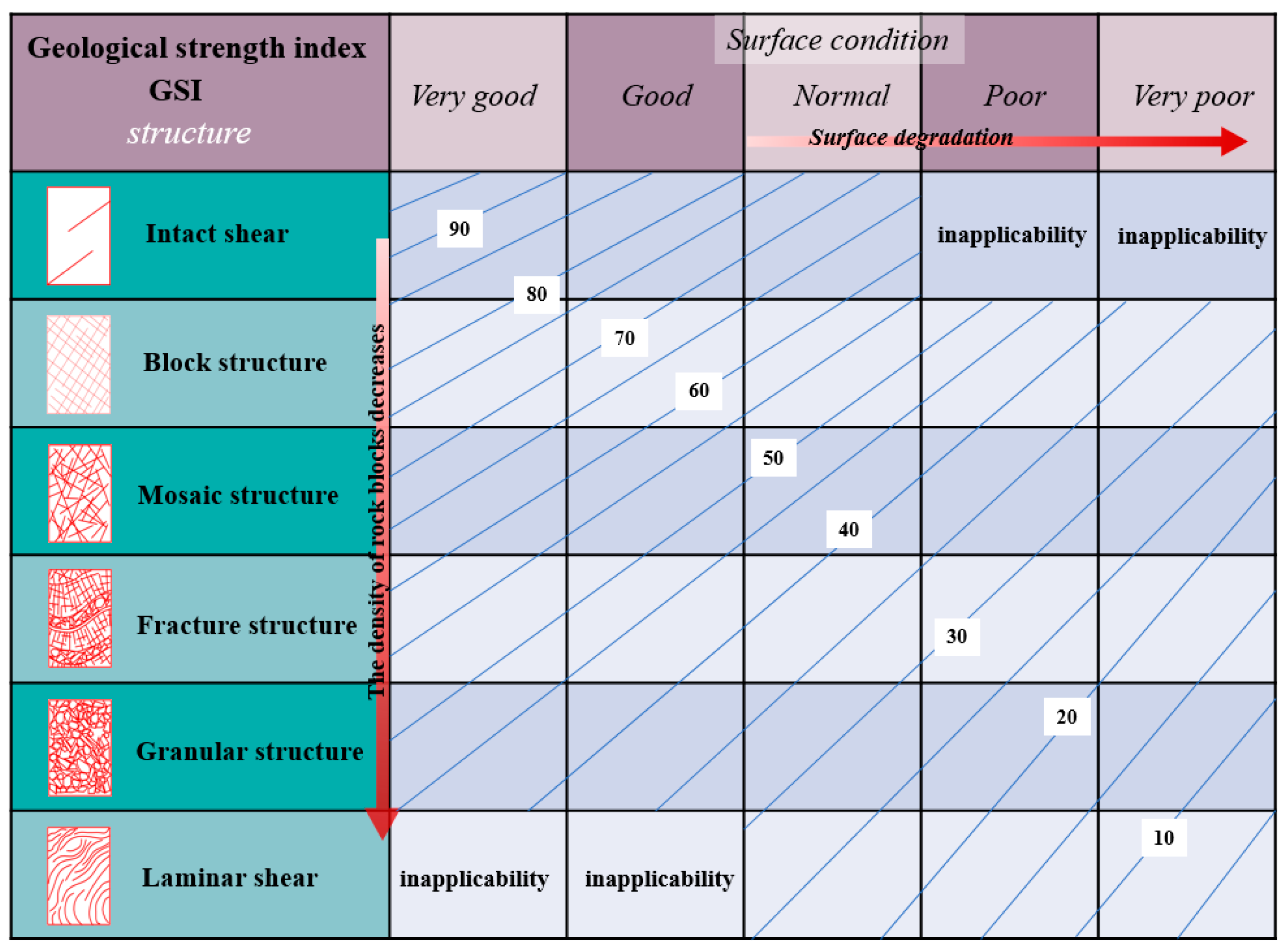 More importantly, intact or massive rock bodies, as well as those previously altered significantly by shearing, transport, or other disturbances, fall outside the application scope of the Hoek–Brown criterion. Therefore, the top and bottom rows of the extended GSI chart (