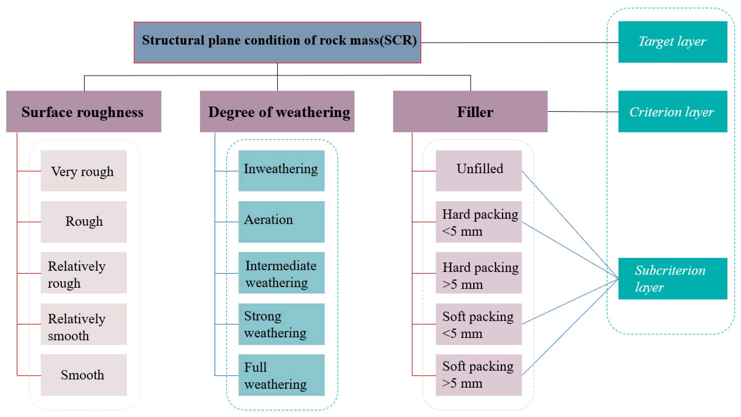 (1) Define the Objective: Clearly identify the ultimate goal of the decision-making problem; which, in this study, is to determine the weighting coefficients for rock surface conditions. The objective is to use the AHP to establish the relative importance of roughness, filling, and the degree of weathering on the rock surface conditions and allocate corresponding weight coefficients for each factor at different levels. This helps to better understand the influencing factors on rock surface conditions and their relative contributions.