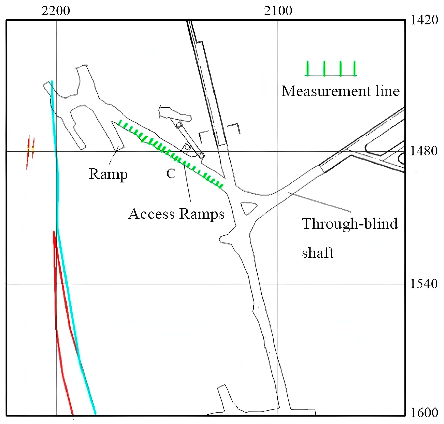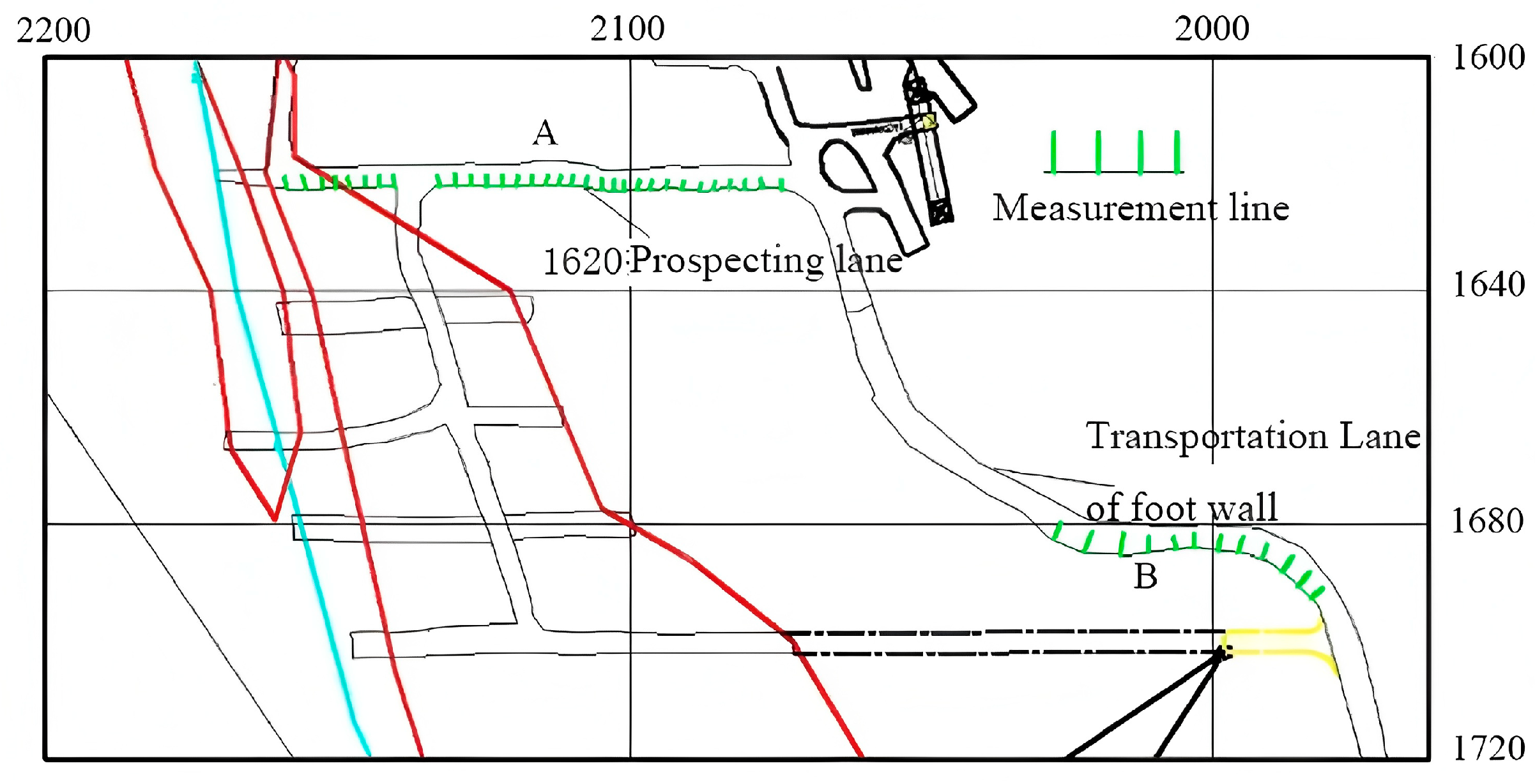 To investigate the structural characteristics of the rock masses in the mining area, geological surveys were conducted in the representative −915 m section—including in exploration and transport tunnels—and the sloped section at −960 m. Tools such as a geological compass, tape measure, drawing ruler, geological hammer, geological knife, and camera were used for the survey. The measurement points are shown in