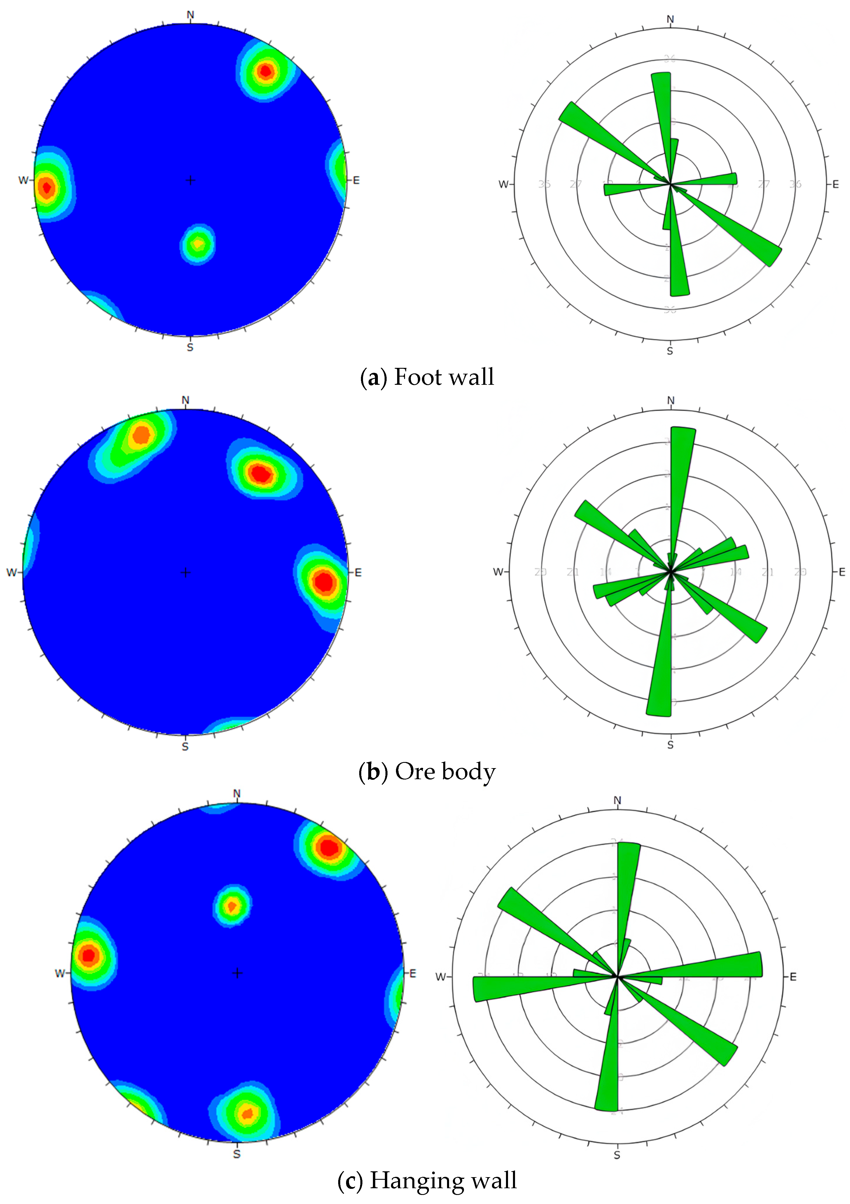 The surveyed joints were analyzed using the DIPS 5.1 software, which outputs the number of joint sets, their orientations, and development characteristics at each level in the form of strike or dip rose diagrams. Additionally, equal-area stereonet projections were used to represent the orientation of joint planes, and density maps of joint poles were created. These maps quantitatively reflect the density and predominant orientations of the development of joints and fractures. The density maps and dip rose diagrams for the joints and fractures in the hanging wall, the ore body, and the foot wall are shown in