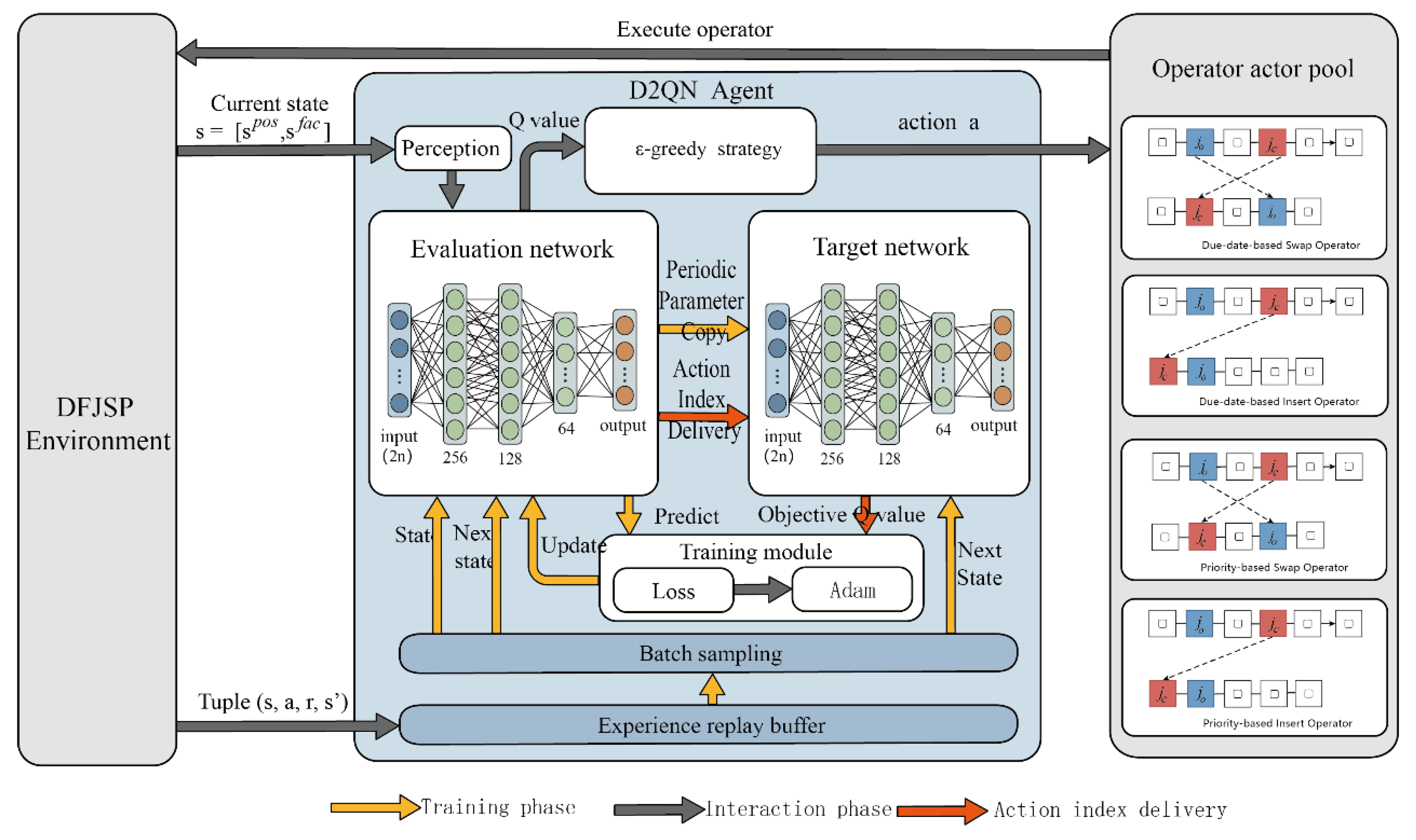 In the D2QN-COEA framework, the D2QN serves as the decision-making module that adaptively selects the most effective local search operator according to the current state of the solution. The D2QN is trained under a reinforcement learning framework, continuously interacting with the optimization environment to learn which operator yields the greatest improvement under varying scheduling conditions.