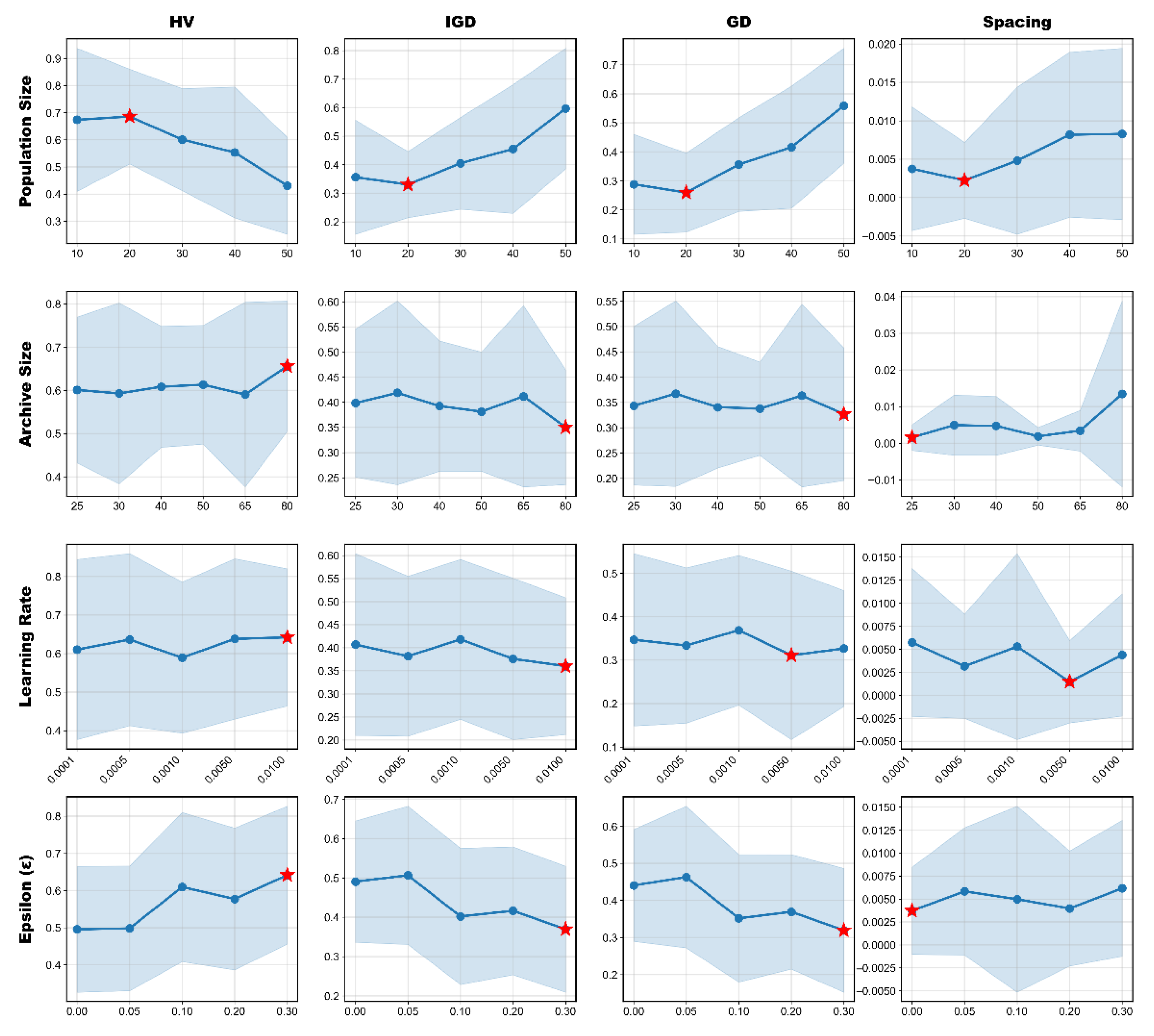 Figure 4, the star symbols denote the optimal parameter values for each metric, while the shaded areas represent the standard deviation of the results across five independent runs, reflecting the stability of the algorithm under different parameter settings.