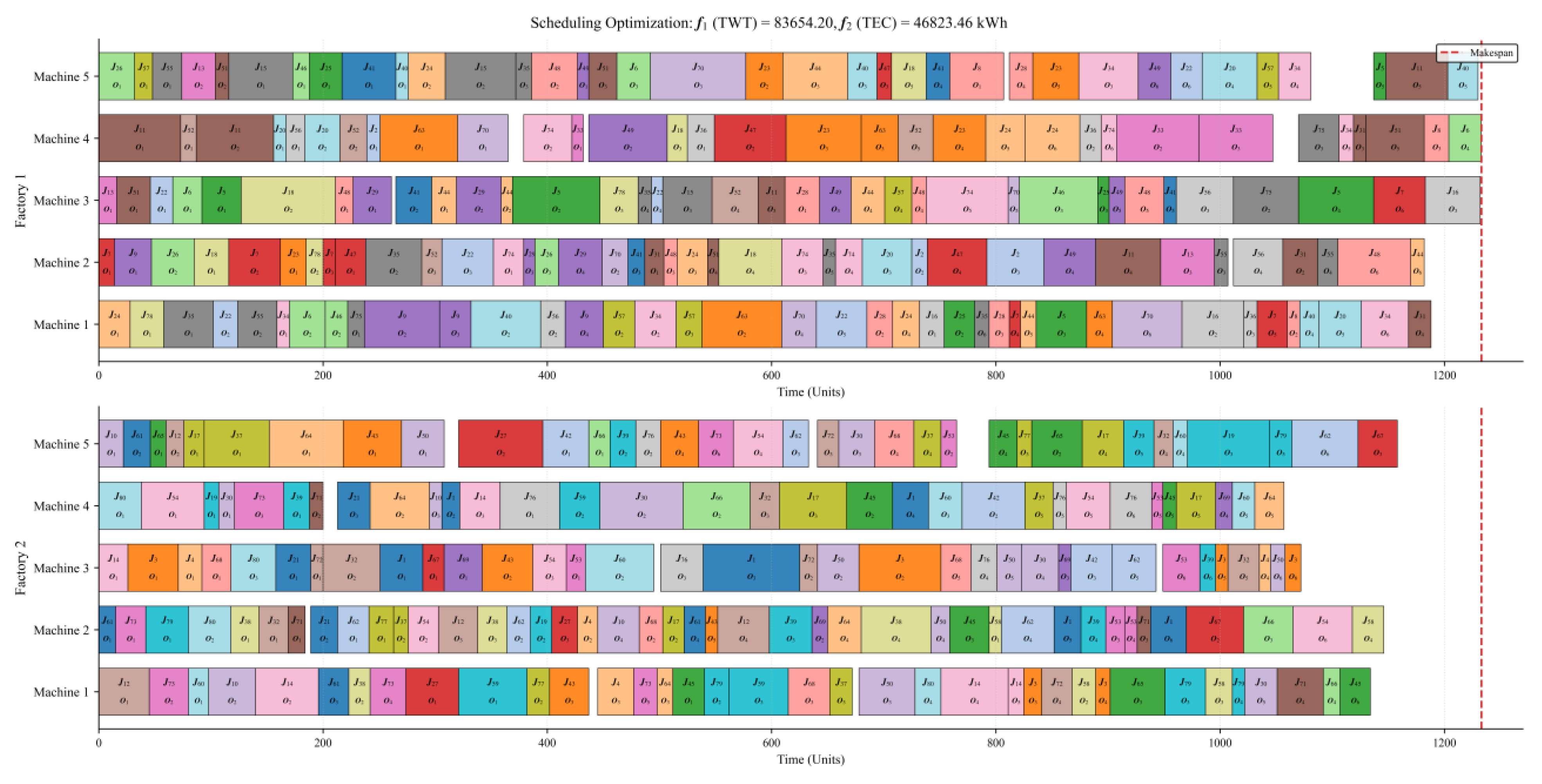 Figure 6, which shows the Gantt chart of one typical solution. The selected solution achieves a well-balanced trade-off between total weighted tardiness and total energy consumption. As observed from the Gantt chart, production loads are evenly distributed between the two factories, and machine utilization is compact and well-organized, ensuring that all precedence and resource constraints are satisfied. These results demonstrate that D2QN-COEA can effectively generate high-quality scheduling solutions in complex distributed manufacturing environments, confirming its practicality and superiority for real-world applications of the EA-DFJSP-JP problem.