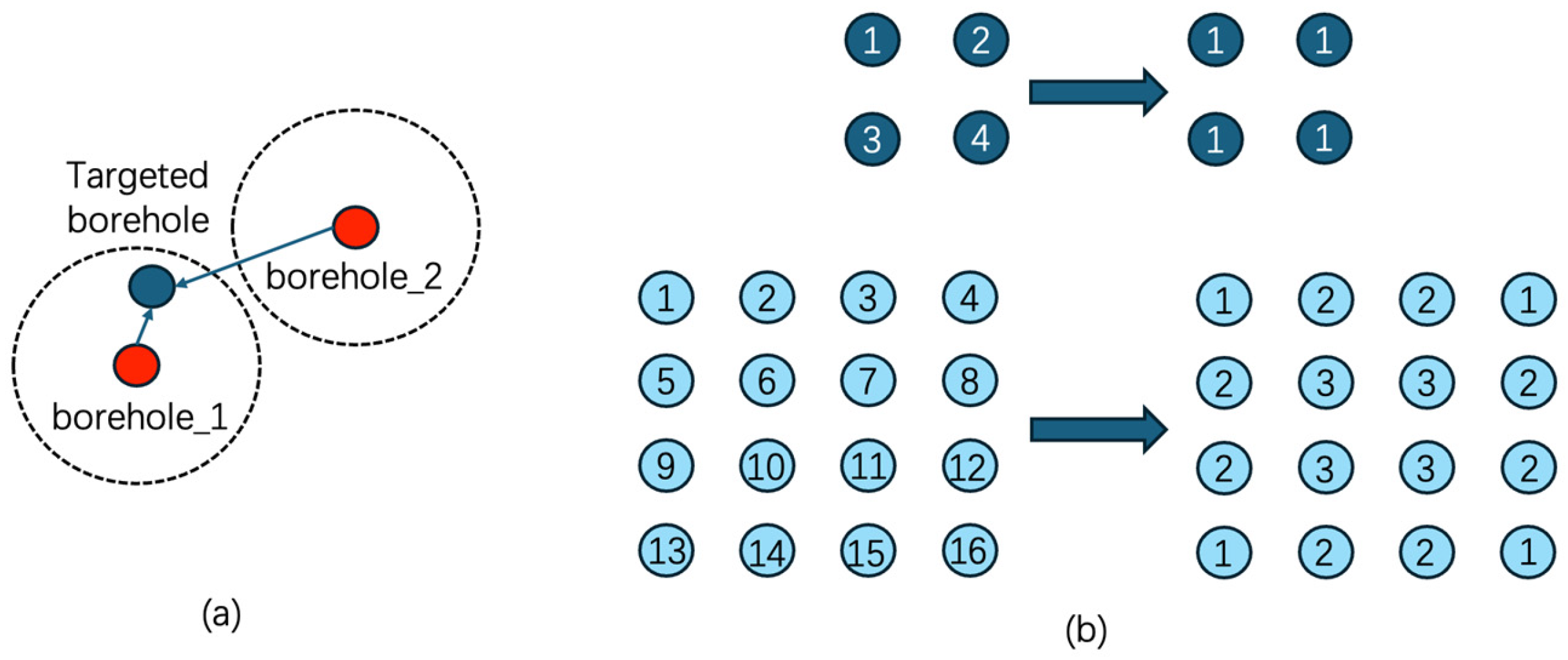 To address the limitations of existing large-scale borehole heat exchanger (BHE) heat-transfer calculations, which either only apply to simplified calculations for regular arrangements or overlook the influence of distant GHEs, this study proposes a method for Large-scale borehole Arrays Dimension Reduction (LADR). The method groups large-scale, irregularly arranged pipe arrays into different clusters based on computational needs. Each cluster’s selected borehole can directly replace the heat transfer calculations of the other boreholes in that cluster.
