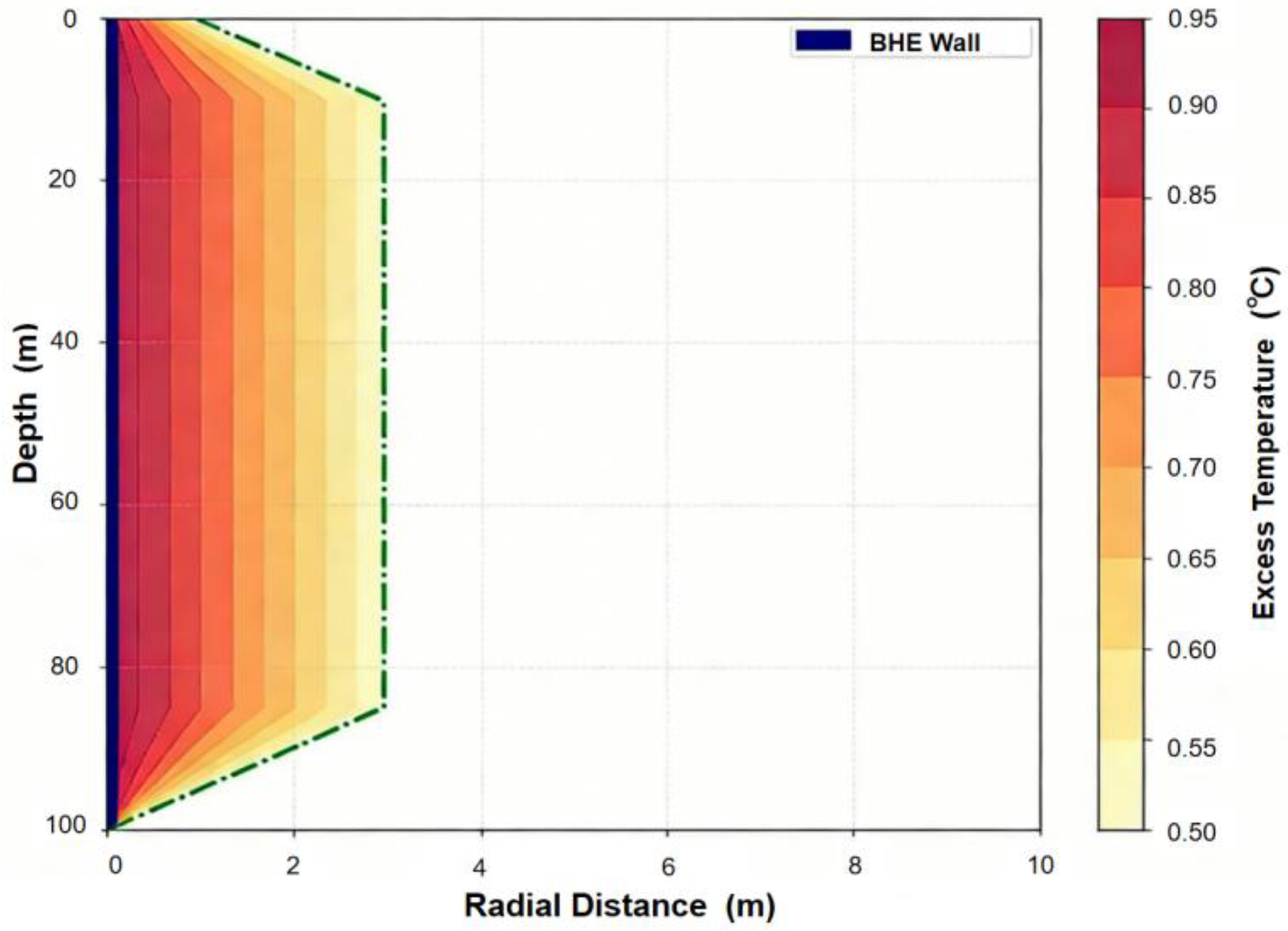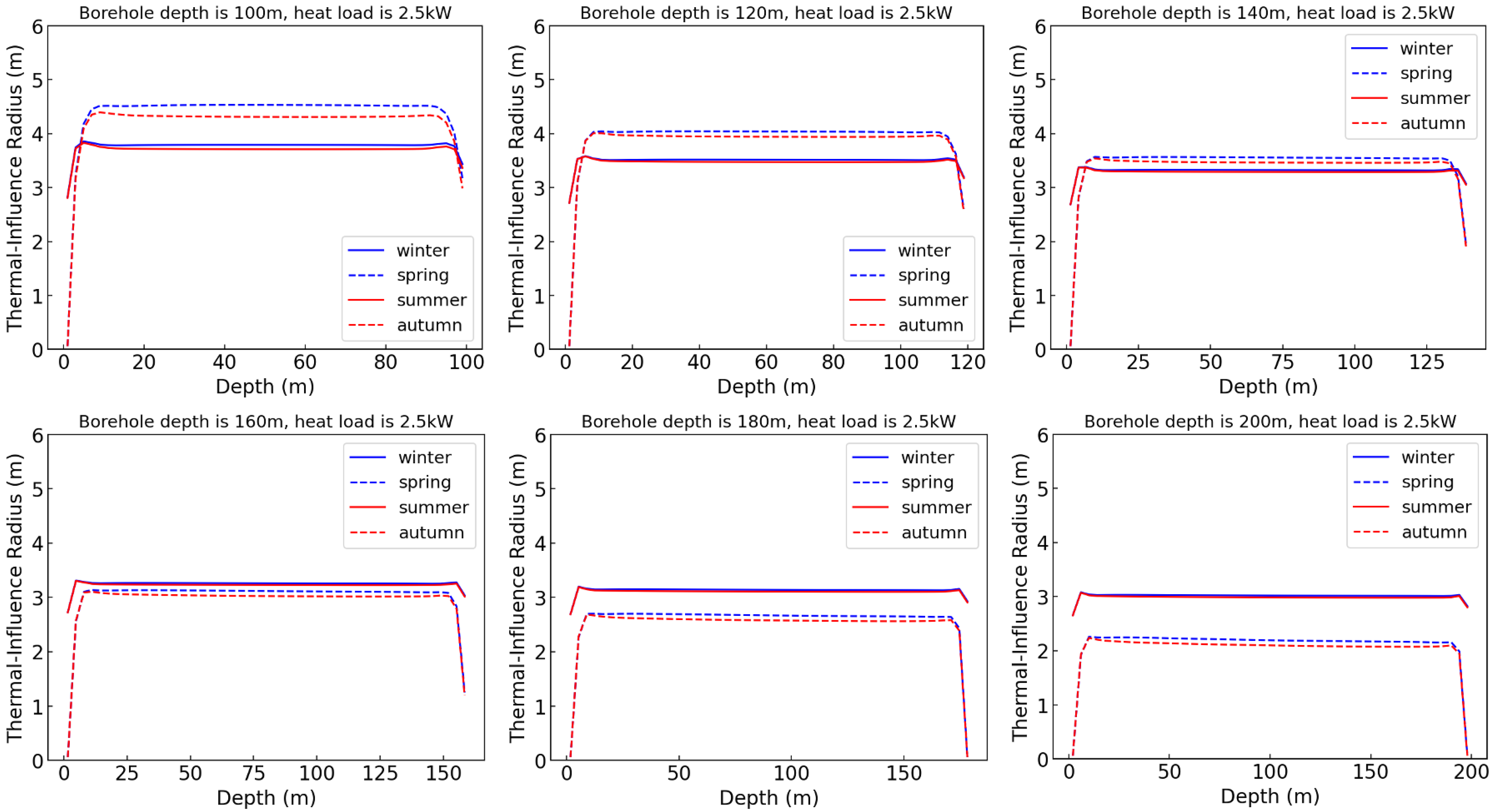 Figure 9. As the borehole depth of the GHE increases, the maximum thermal-effect radius decreases. The main reason for this is that, with a constant heat extraction