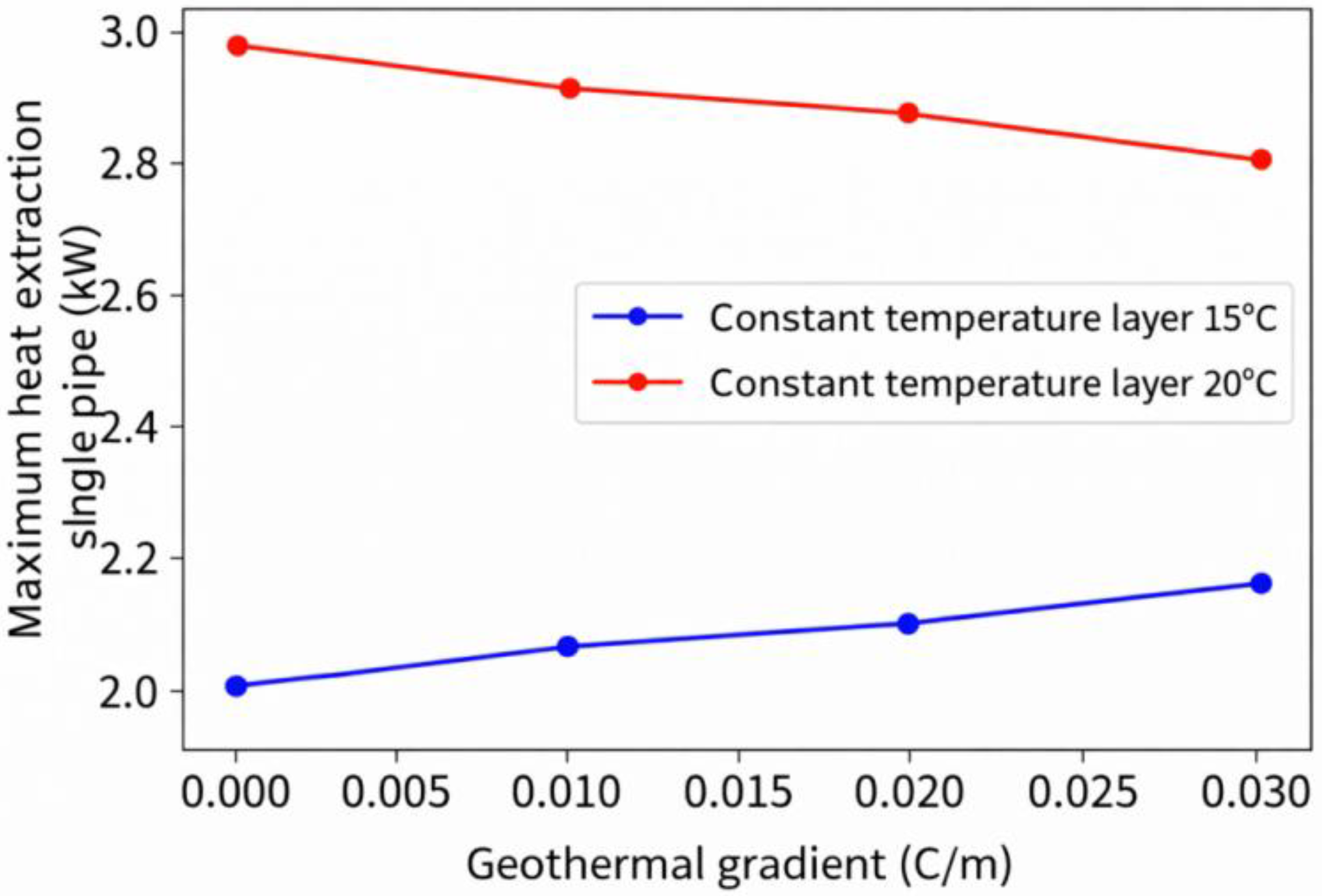 The impact of shallow geothermal gradient on the maximum heat-extraction and thermal-effect radius typically requires repeated transient calculations over the years. However, by utilizing the response-factor method proposed above, rapid comparative calculations can be performed. Therefore, a comparative analysis was conducted to examine the impact of different geothermal gradient settings on the maximum heat extraction and thermal effect radius of shallow GHEs. In the computational analysis using home-made python codes, geothermal gradient values of 0.00, 0.01, 0.02, and 0.03 °C/m were set for case studies, and the maximum heat extraction and thermal effect radius distribution for the single pipe were calculated under the three conditions.