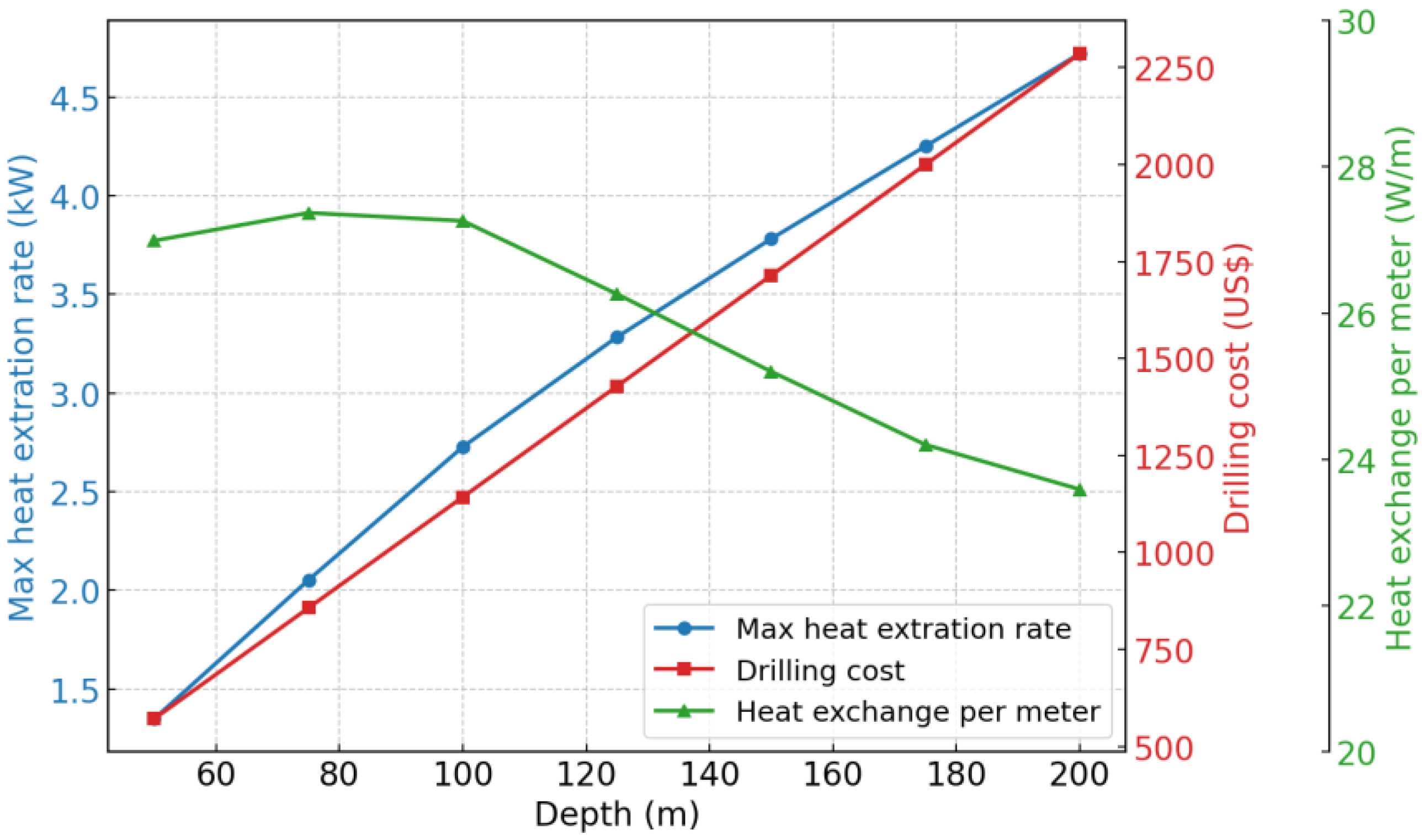Figure 8 indicate that, under the condition of load balance having a cooling load in the summer and an equal but opposite heating load in the winter throughout a 30-year operating period, the maximum heat extraction of a single pipe in shallow GHEs increases approximately linearly with borehole depth. However, the rate of increase slightly slows down as the borehole depth increases. An analysis of drilling costs under different borehole depths reveals that drilling costs are generally linearly related to borehole depth. Therefore, at greater borehole depths, the heat-transfer gain per unit of depth shows diminishing marginal returns. Overall, the heat-exchange capacity per unit depth of shallow GHEs typically ranges from 20 to 30 W/m, which is consistent with existing engineering practice.