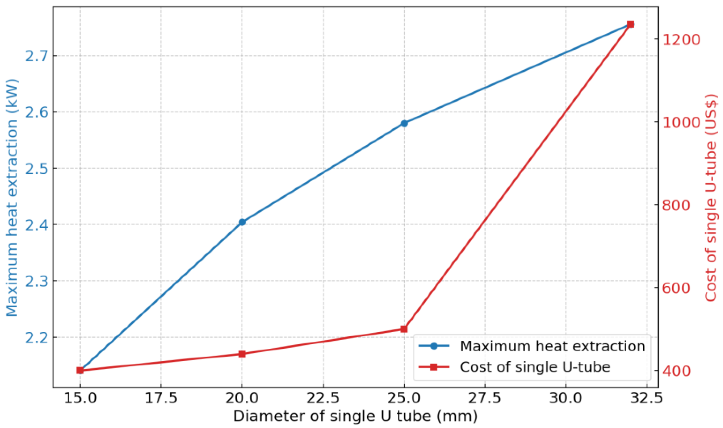 Figure 10 shows that, as the borehole diameter increases, the cost slightly increases, while the maximum heat extraction of the single pipe also increases. The impact of pipe diameter on heat-extraction capacity is consistent with the findings of previous studies, further validating the accuracy of the response factor method.