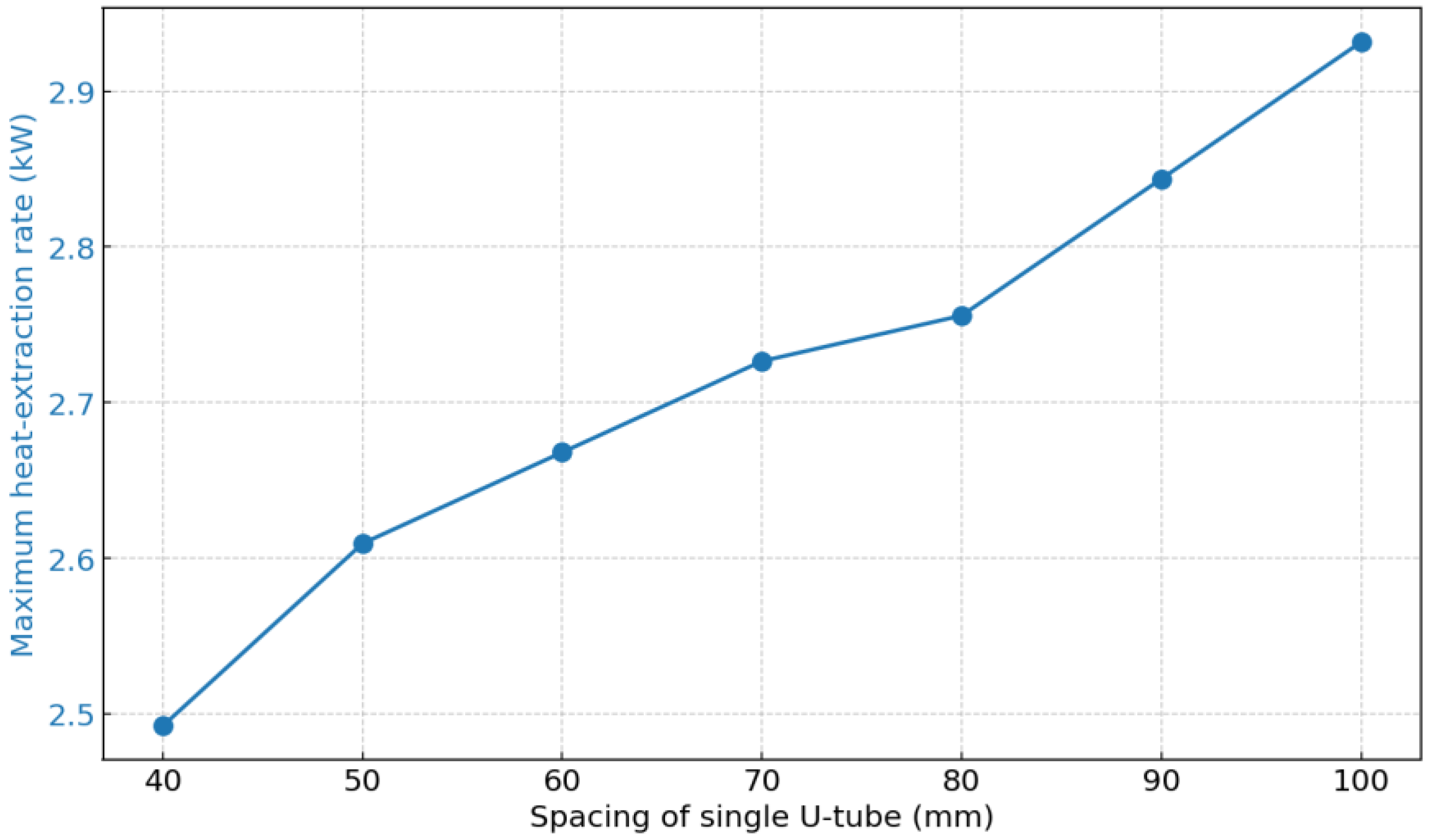 An analysis was conducted on the relationship between the spacing of single U-tubes and the maximum heat extraction of a single pipe. In the calculations, the shallow GHE was assumed to simultaneously provide heating and cooling over a one-year period, with equal loads in both the winter and summer seasons. The calculation results, shown in