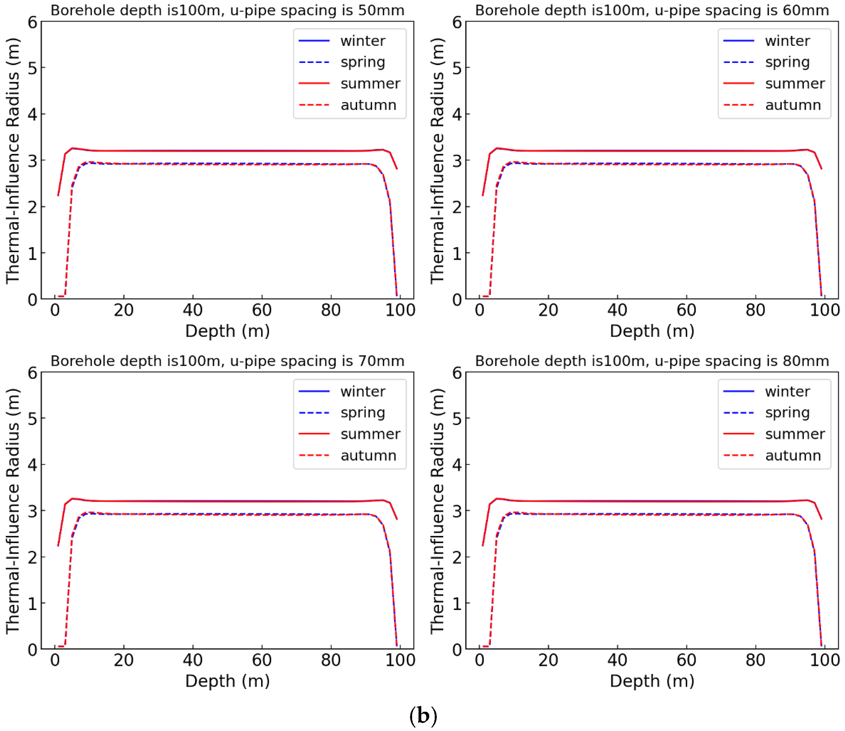 Further analysis was conducted on the relationship between the spacing of single U-tubes and the thermal effect radius. Under the default settings for the system’s other parameters, a shallow GHE at a depth of 100 m was selected, with pipe spacing set to 50, 60, 70, and 80 mm in four calculation cases. For all cases, heat-extraction loads of 2.0 kW and 1.5 kW were chosen. A temperature threshold of 0.3 °C was used to calculate the thermal effect radius, which was examined over a 30-year period at various depth placements of the GHE. The results are shown in