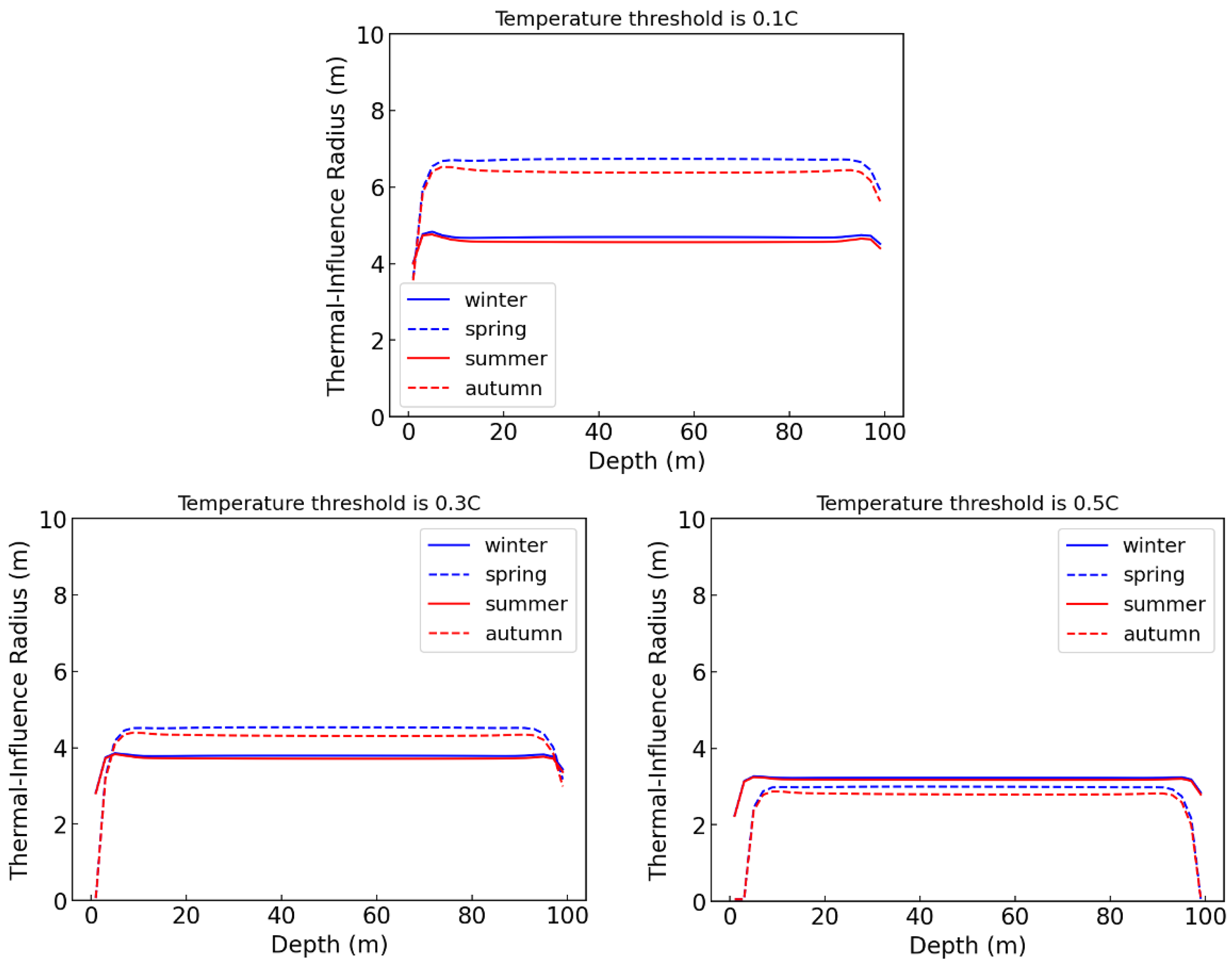 Figure 14 show that the smaller temperature threshold results in larger thermal-influence radius. But it is found that the value of radius in transition seasons behaves with higher sensitivity.