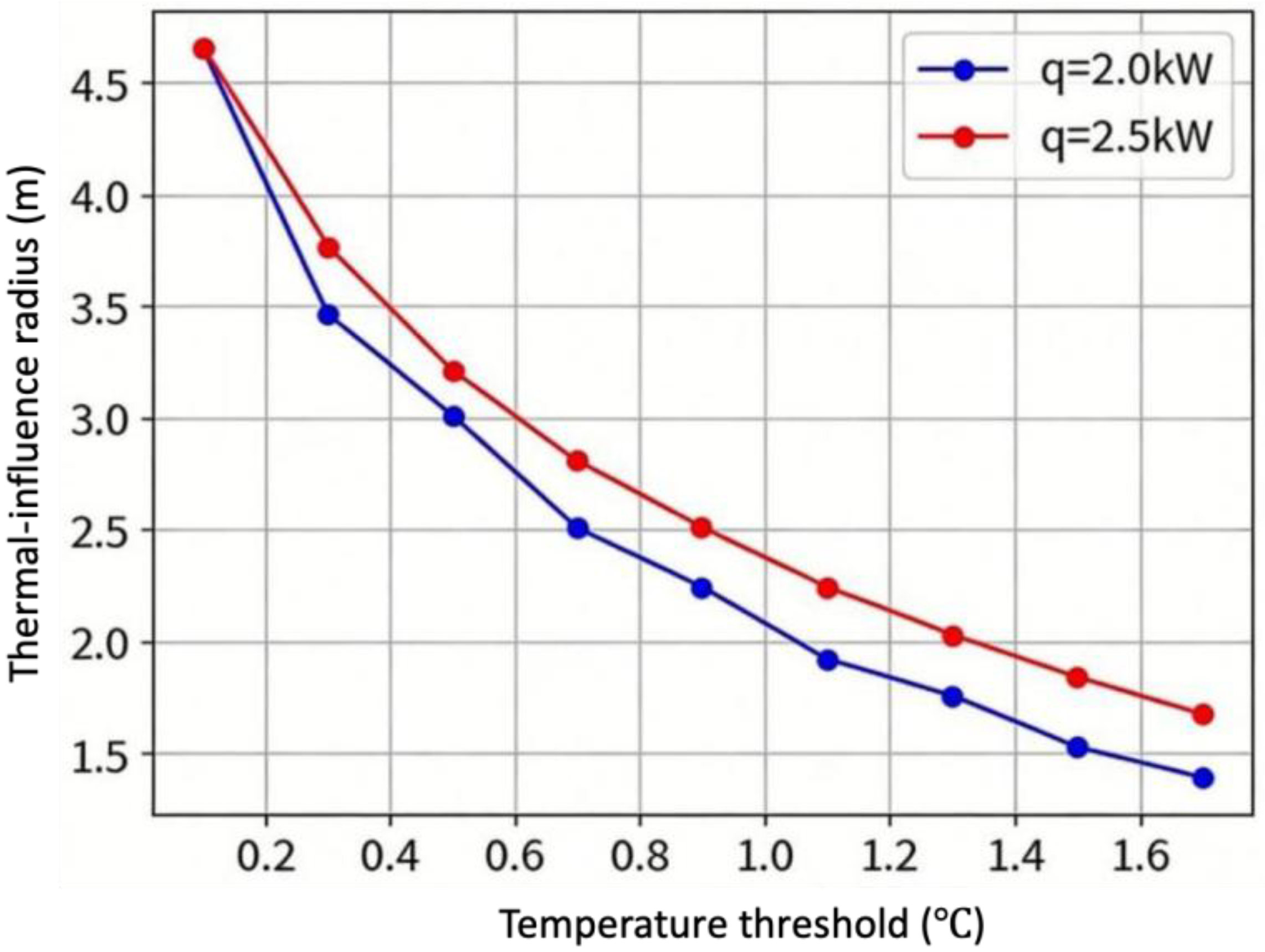 To obtain the thermal-effect radius under different temperature-threshold settings, further calculations were performed with temperature thresholds of 0.7, 0.9, 1.1, 1.3, 1.5, and 1.7 °C, yielding the corresponding thermal-influence radii. This results in a function curve for the single pipe’s thermal-effect radius as a function of temperature threshold. Furthermore, to evaluate how various load amounts affect the outcomes, a set of calculations with a load of 2.5 kW was added, as shown in
