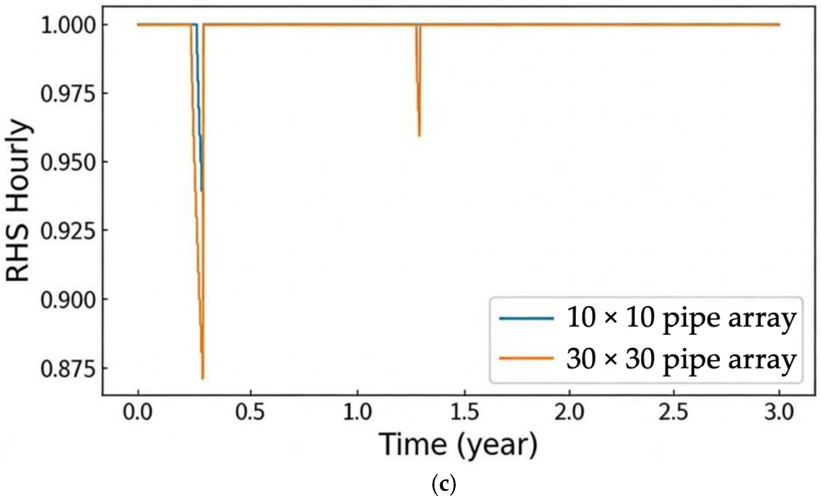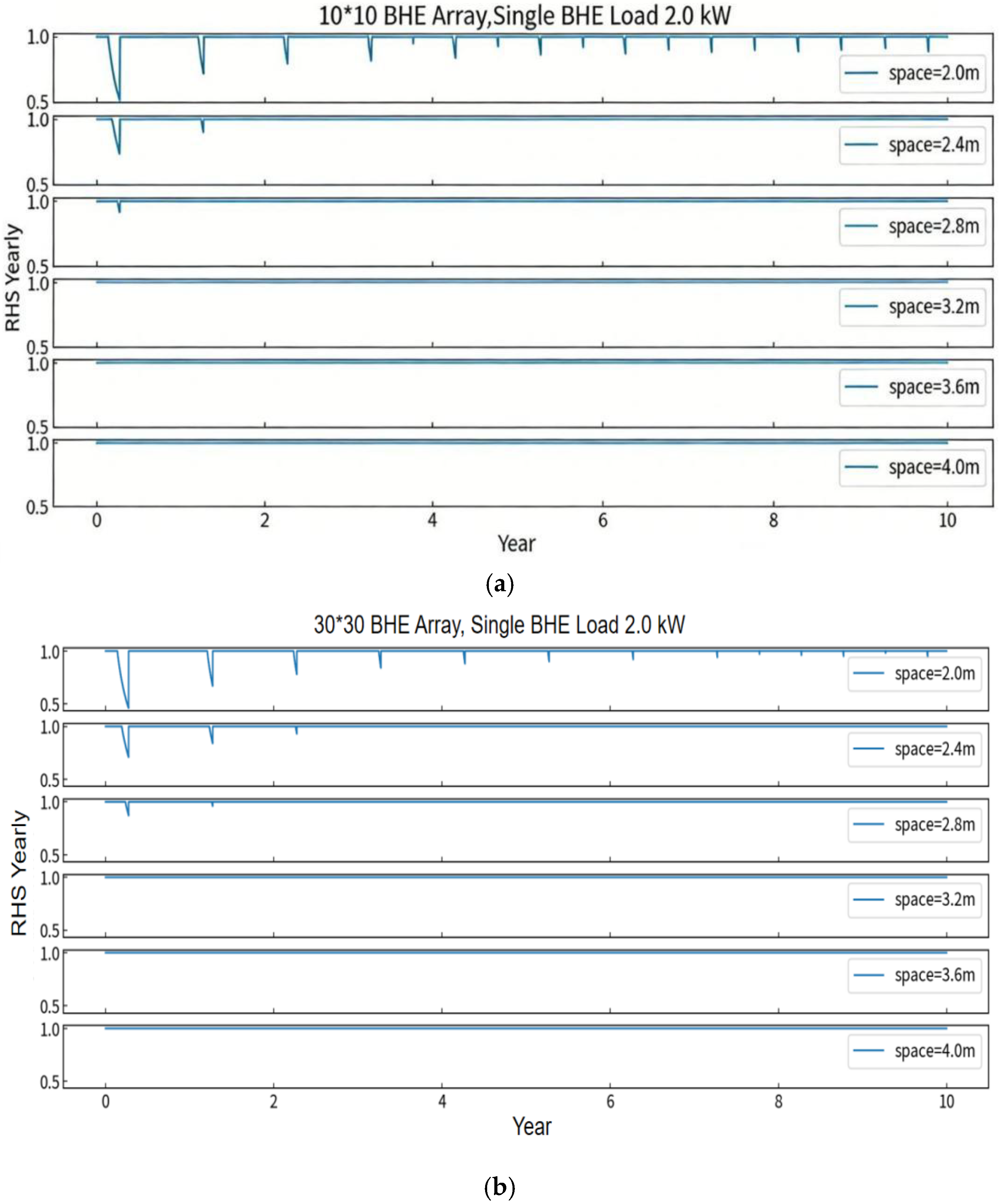 A study was carried out utilizing a 10 × 10 pipe array with a single pipe load of 2.0 kW in order to better understand the process underlying the system’s annual rise in the minimum RHS under balanced ground-source loads. The analysis was performed for well spacings of 2.0 m and 2.8 m, with a calculation period of the first 10 years of system operation. The results are illustrated in