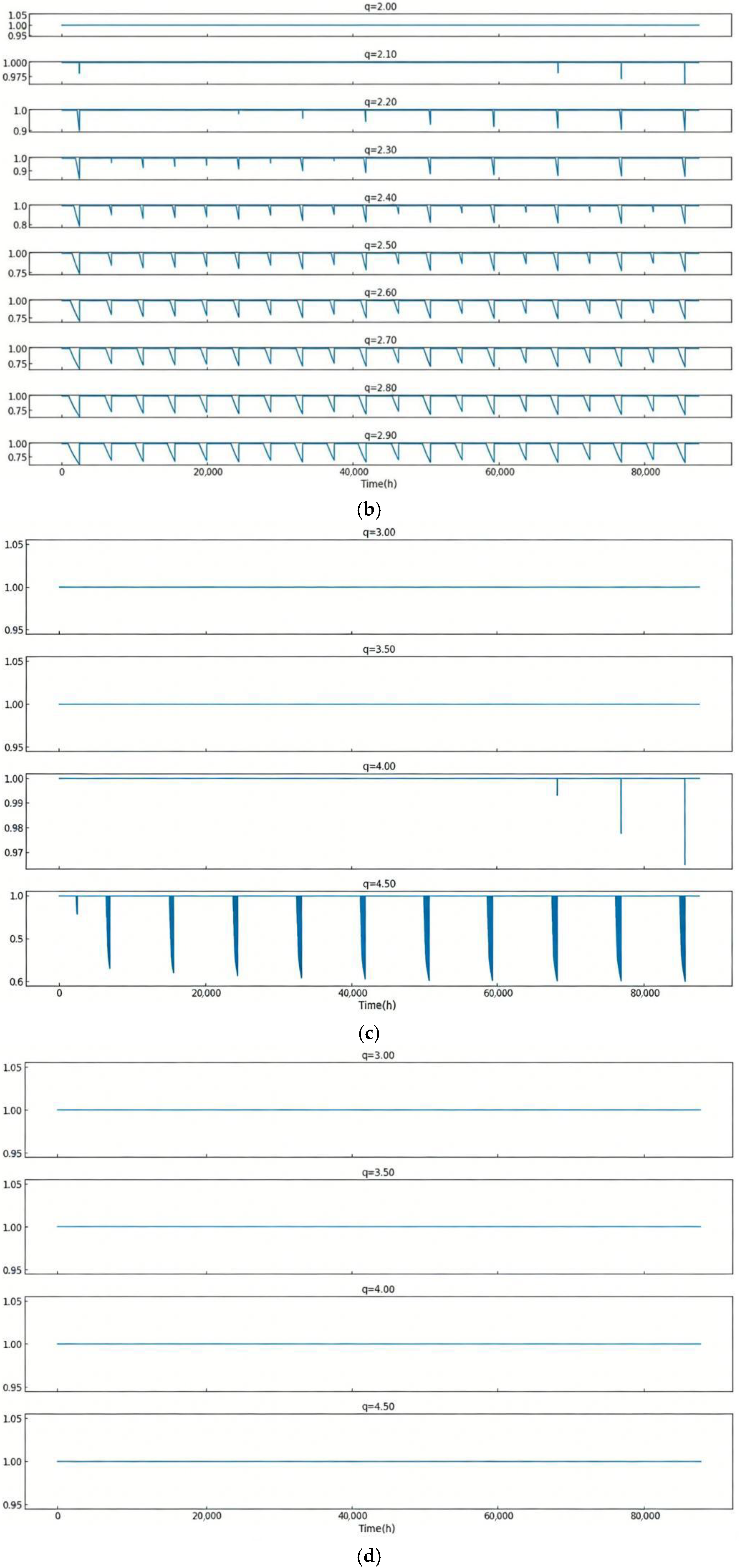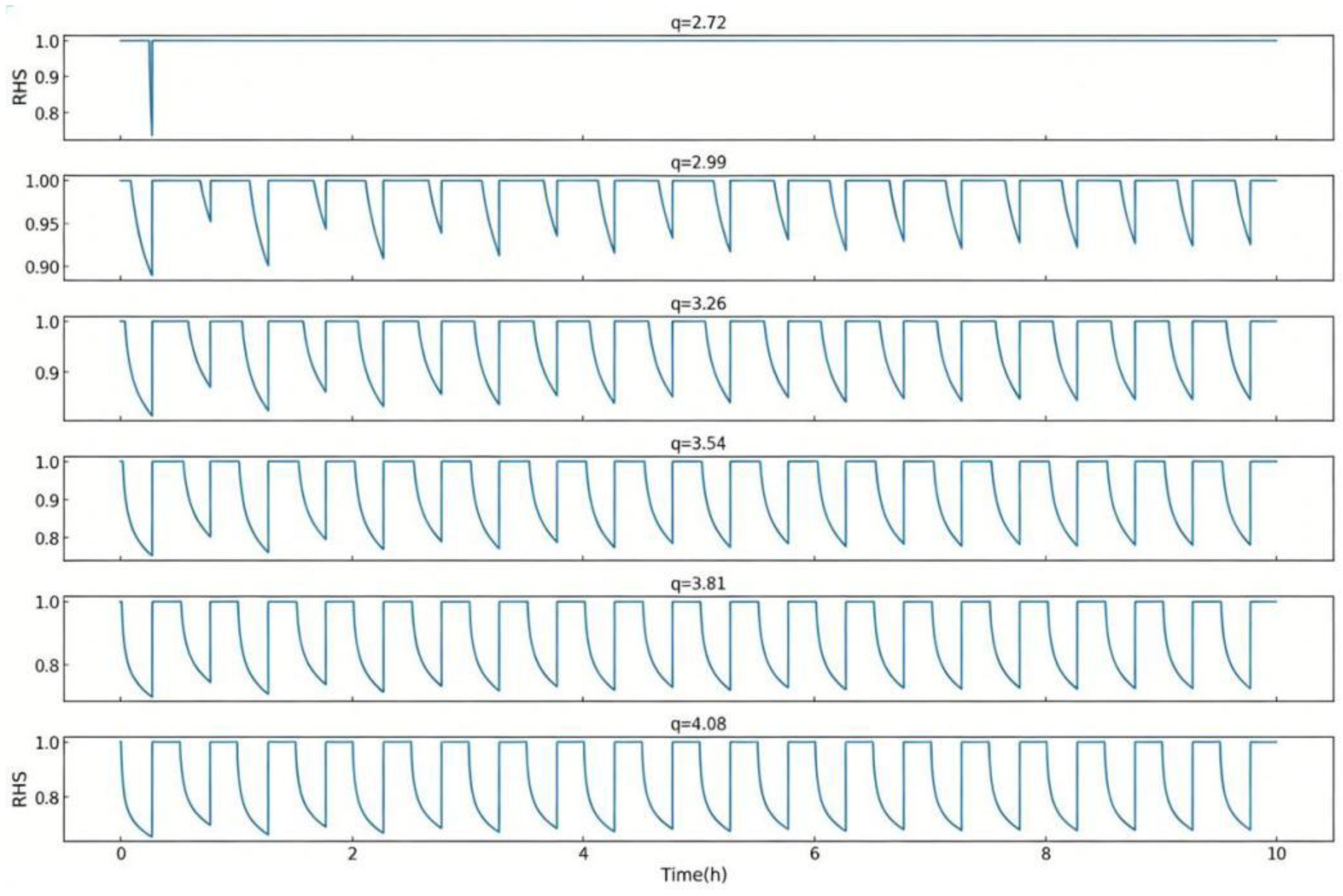 To investigate the variation in maximum heat extraction of shallow GHEs under different operating modes, the system’s running hours per day were set to 12, 16, 20, and 24 h, with equal heating and cooling loads over the course of a year. For a 10 × 10 pipe array with a well spacing of 2.8 m and balanced heating and cooling load design, the load of the single pipe in the array was set to different values: 3.0 kW, 3.5 kW, 4.0 kW, and 4.5 kW. The variation in RHS of the shallow GHE array under different intermittent operating conditions was examined. The calculation results, as shown in