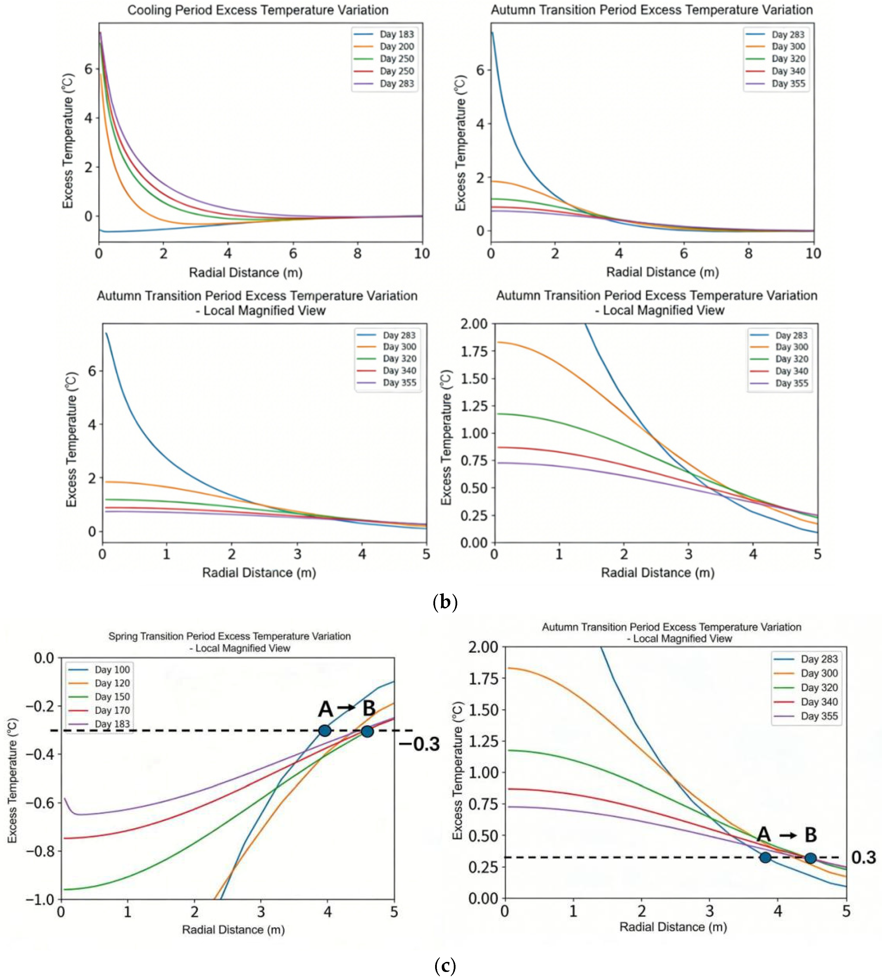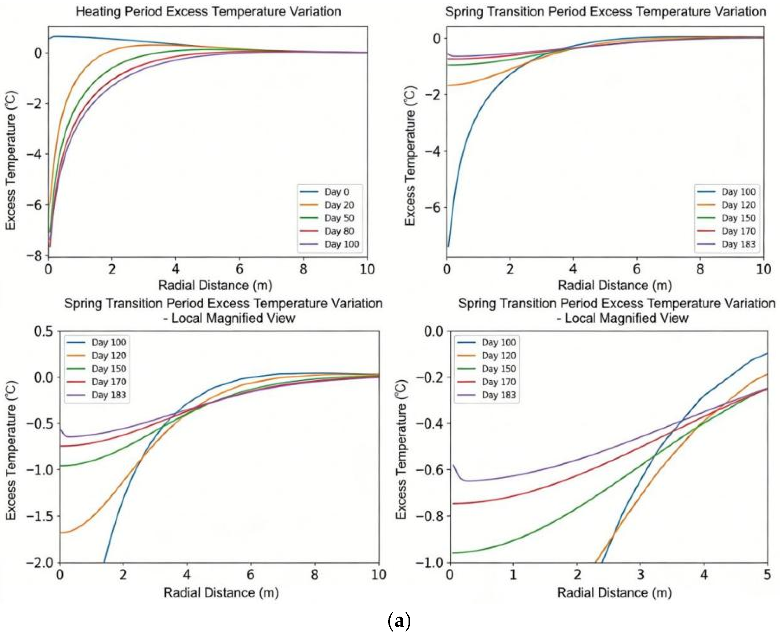 Figure 19a that during the heating period (Day 0 to Day 100), as the GHE continues to extract heat, the temperature within a 10 m radius of the pipe keeps decreasing. The excess temperature decreases more significantly the closer it is to the GHE. From Day 100 to Day 183, during the spring transitional period, the soil temperature around the GHE gradually recovers. The winter heat-withdrawal power in this calculating instance is 2.5 kW, which is nearly equal to the single pipe’s maximum heat-withdrawal capability. After the heating period, this causes the soil temperature close to the pipe to significantly drop. Therefore, during the spring transitional period, there is a great temperature difference between the soil near the well and the soil farther away. As time progresses, due to soil thermal conduction, the temperature of the soil at other positions also gradually decreases, which causes the thermal-effect radius during the spring transitional period to be larger than that at the termination of the heating period. Similarly, the soil temperature close to the pipe considerably rises following the cooling phase, as seen in