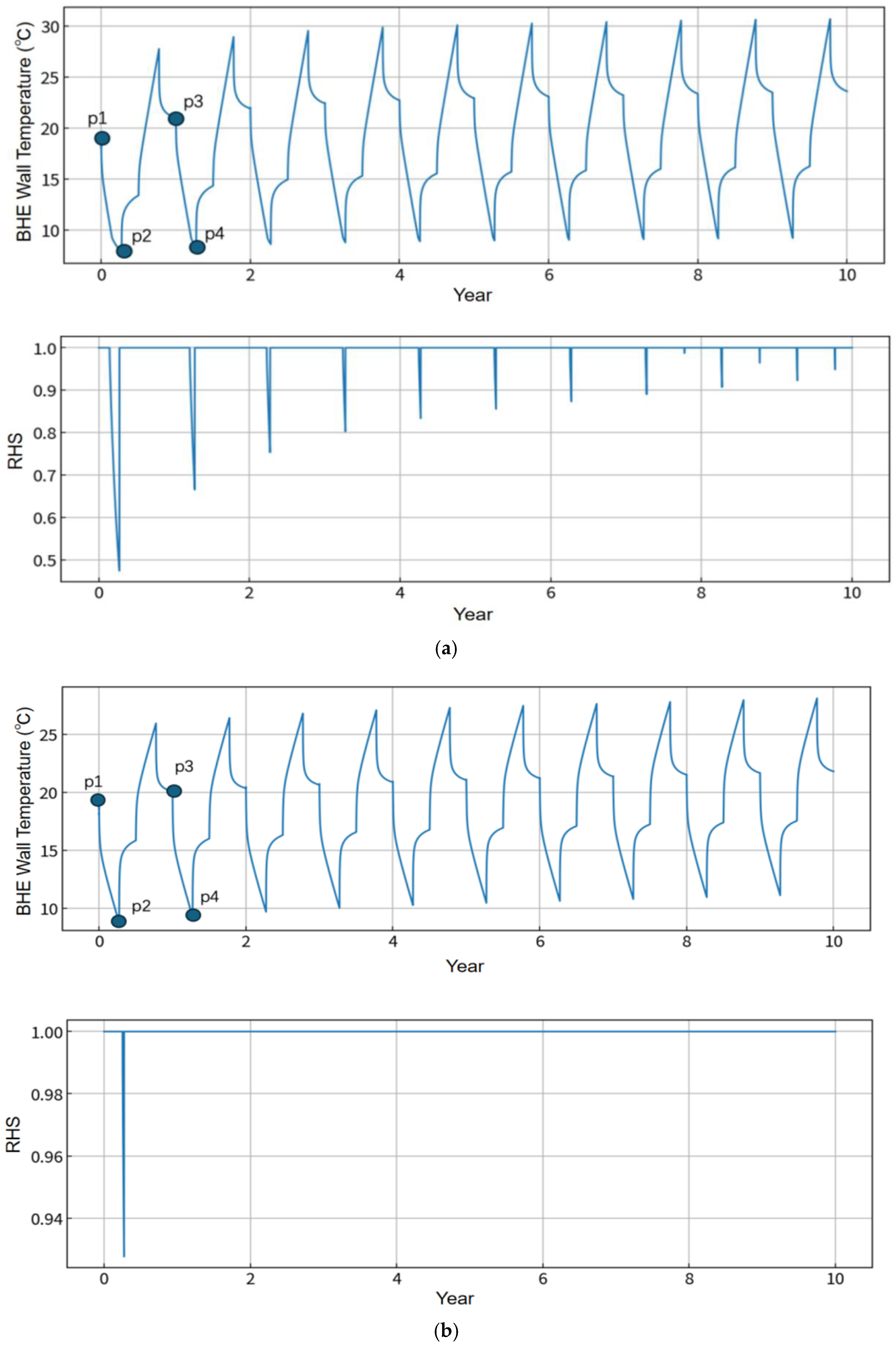 Based on the gradually heat-accumulated ground in a thermally balanced system, the temperature increase is not a linear trend but an ascending trend with slower speed when approaching 10 years’ time. Actually, it does not fully depend on the initial temperature but depends on both initial ground state and the ground-side heating/cooling load. We added 4 points as p1–p4 for illustration. In a thermally balanced designed geothermal system, the heat extraction in winter and heat injection in summer are equal. But if the initial ground temperature is a bit low, the heat-supplying ratio can be below 1.0 as the figure of RHS shows. However, the ground can undertake the heat injection without any problem, and the heat injection is larger than the heat extraction in a whole-year operation. This makes an increased ground temperature year-on-year.