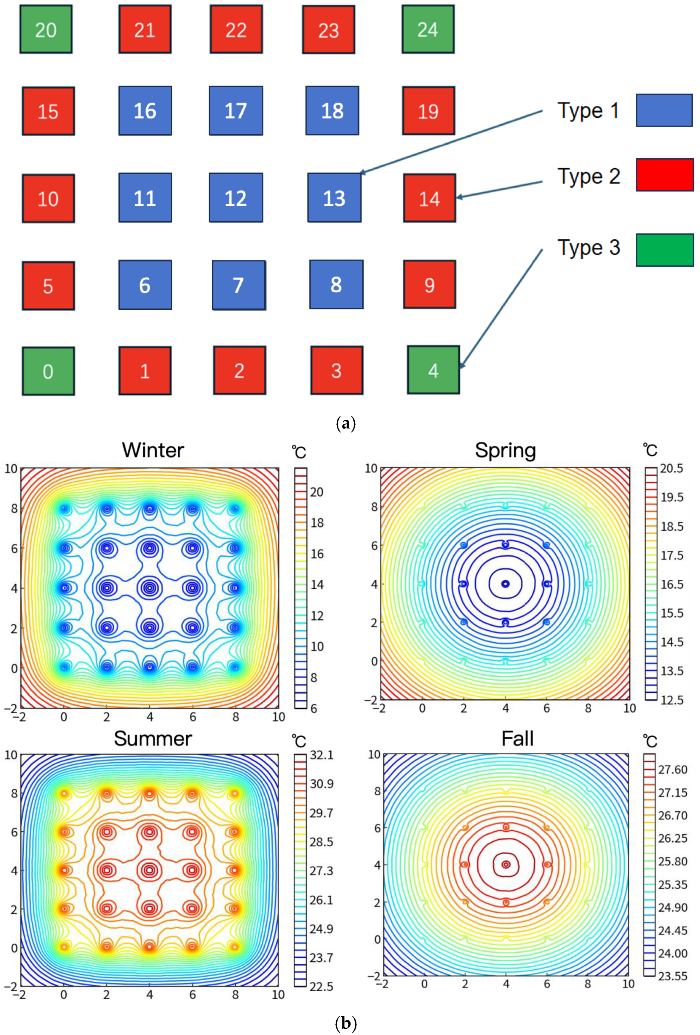 The above analysis treats the entire GHE array as a whole, but in practice, the outlet temperatures of the GHEs at different positions within an array are not the same. Therefore, this section analyzes the differences and distribution of heating and cooling RHS for GHEs at different positions within a shallow pipe array. In this analysis, a soil initial temperature of 20 °C, a 5 × 5 pipe array, a well spacing of 2 m, and a single pipe load of 2 kW were selected. Using the algorithm, the 5 × 5 pipe array can be automatically divided into three types of GHEs, as shown in