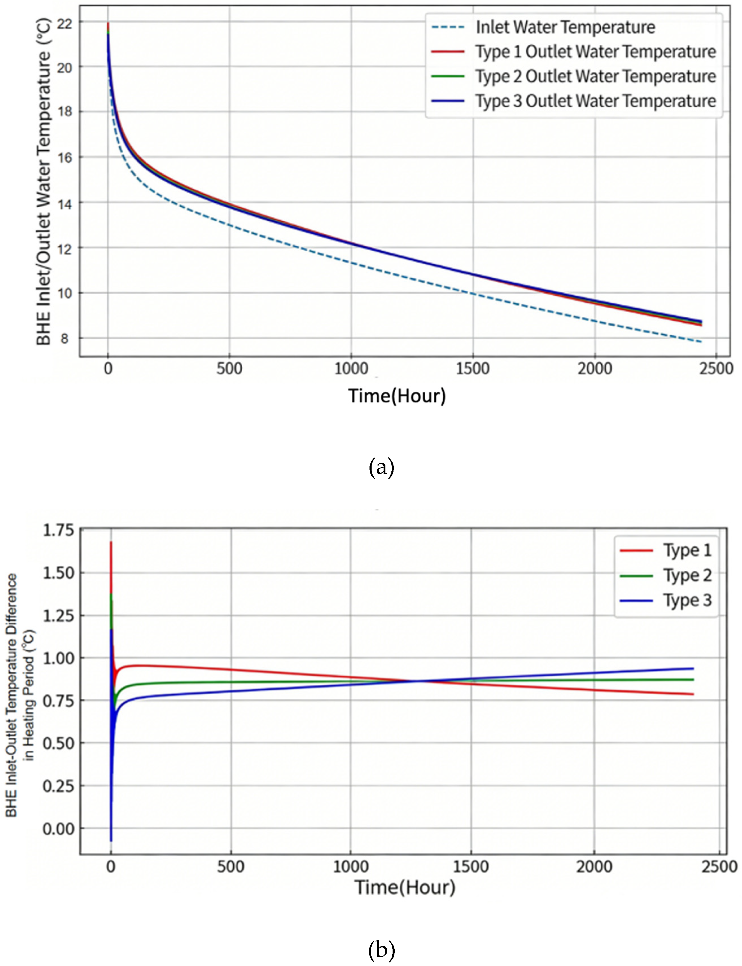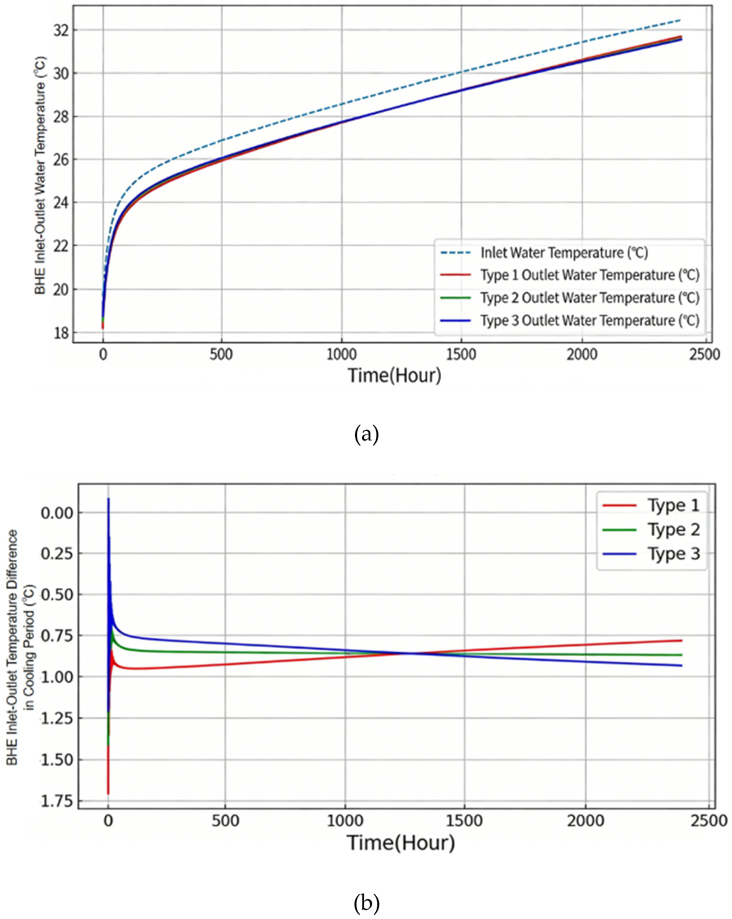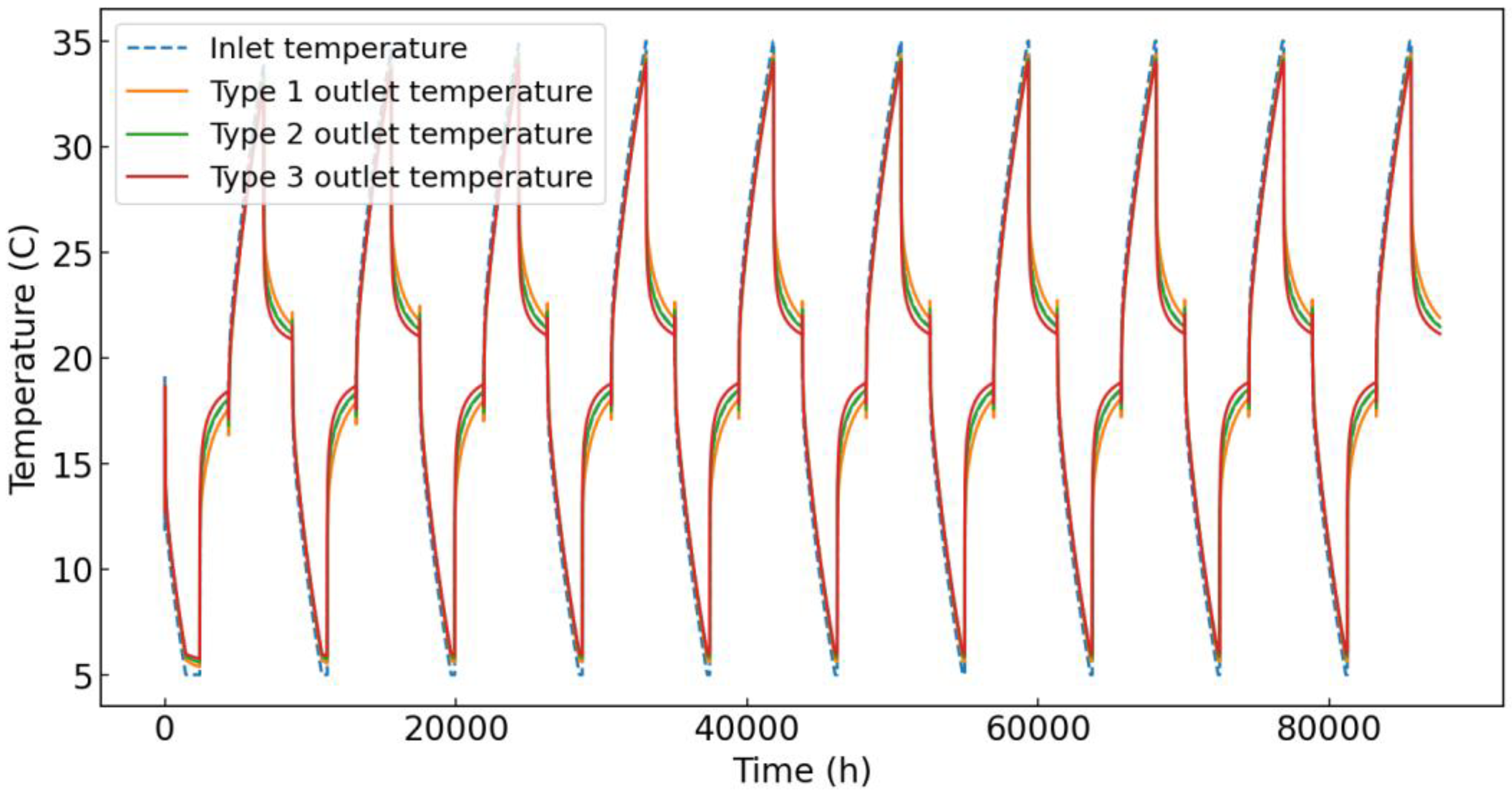 During the heating and cooling phases of the tenth year, the intake and exit water temperatures, temperature variations, and the computed heat exchange values for the single pipe were examined; it is evident that the three kinds’ inlet–outlet temperature differences varied by around 0.1 °C. Among them, Type 3 has the largest difference, while Type 1 has the smallest. The difference in outlet water temperatures for all three types is very small when displayed on the same graph.