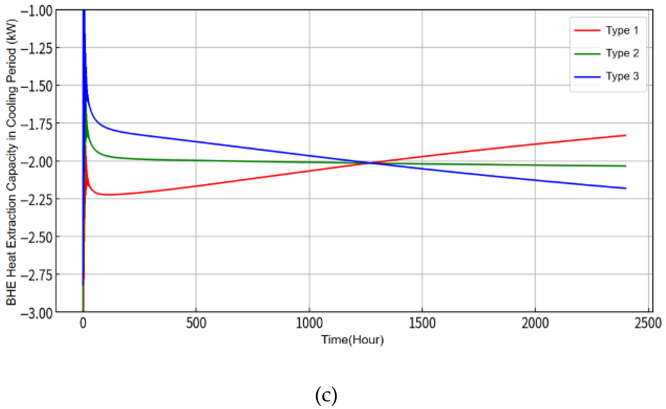 Whether during the heating or cooling period, the heat-withdrawal capacity of Type 3 rises continuously, the heat-withdrawal capacity of Type 1 decreases continuously, and the heat-withdrawal capacity of Type 2 remains roughly constant or changes very little. Consequently, provided that the average heat extraction capacity of each pipe in the pipe array stays at 2 kW, the GHEs of Type 1 are more affected by heat accumulation, which results in a transfer of some of the heat-withdrawal capacity to the Type 3 GHEs.
