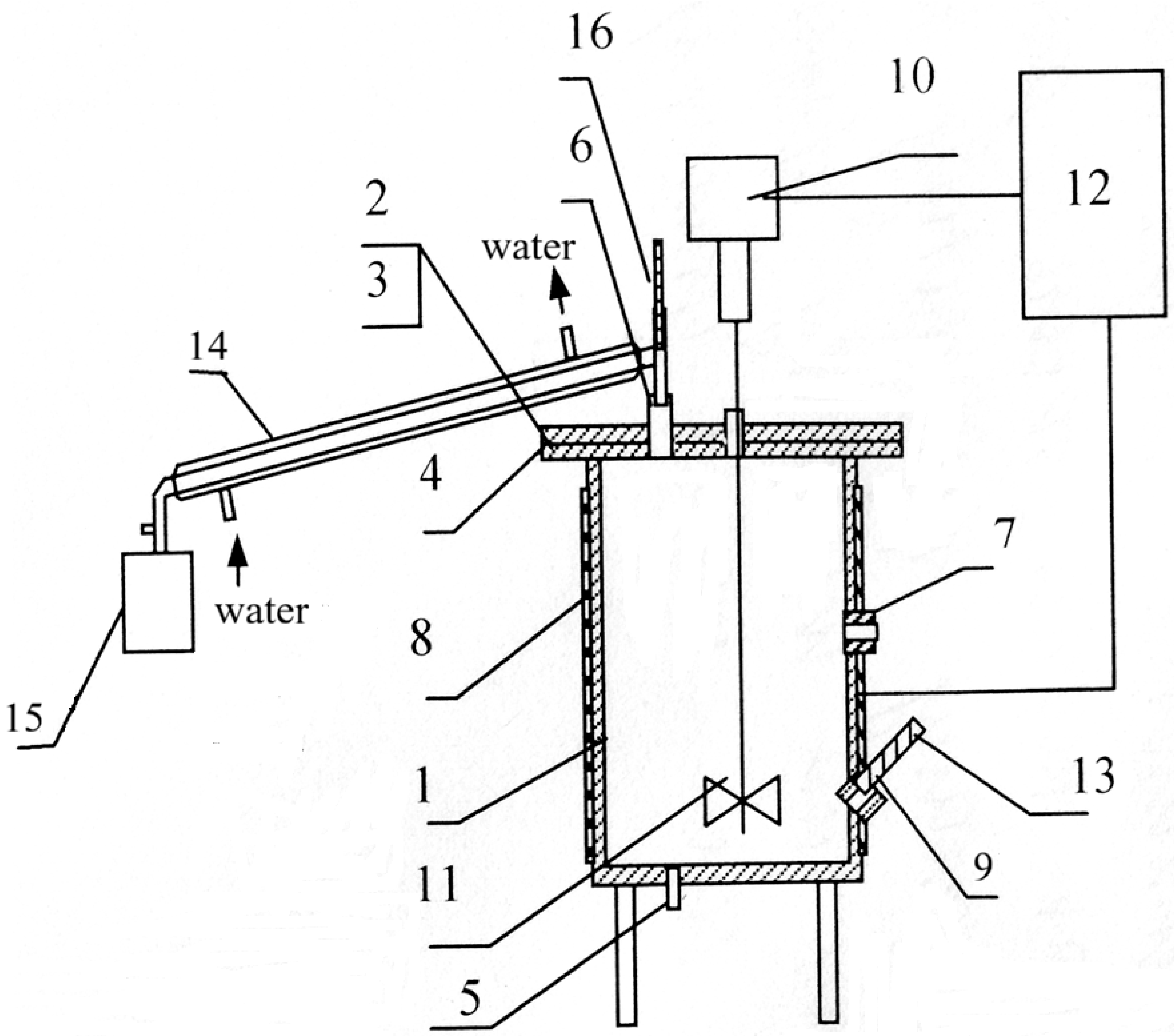 - Pipe 6: measurement of the temperature of the vapor of the distillate hydrocarbon fraction and water, monitored via thermocouple 16.