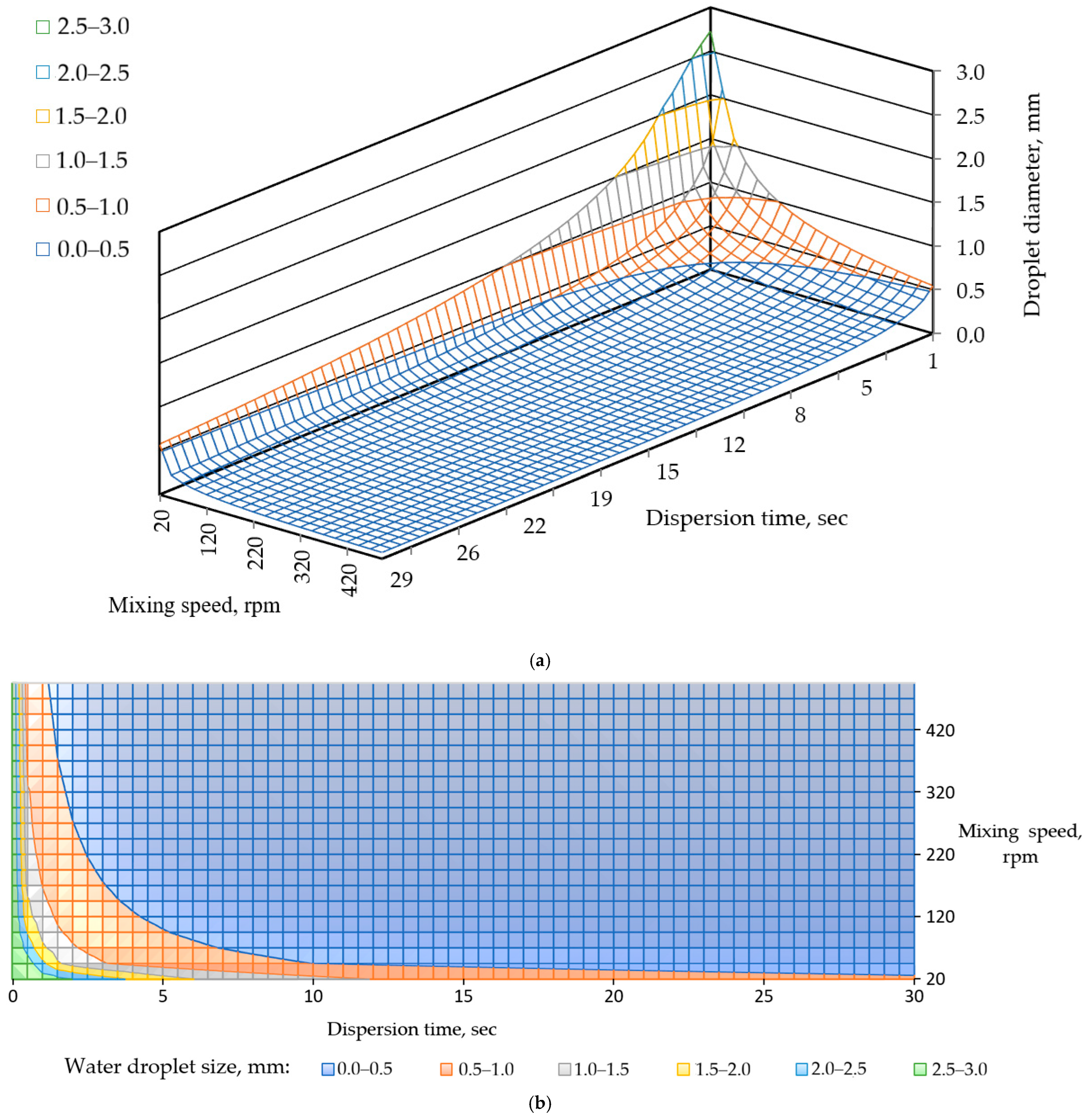 2.2.1. Comparison of Water Globule Dispersion Time with Settling Time