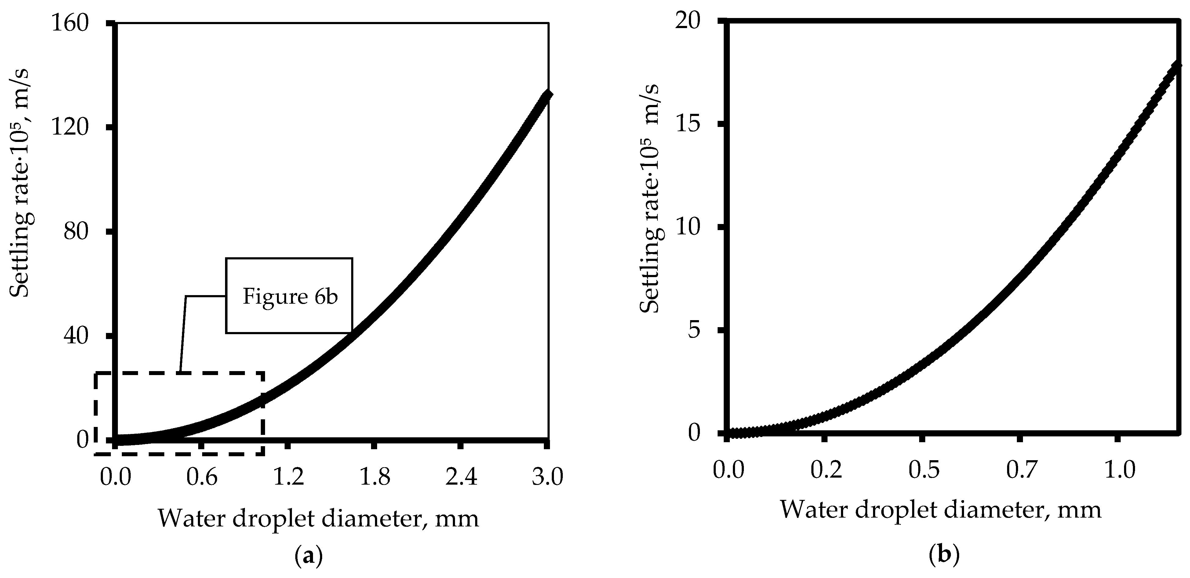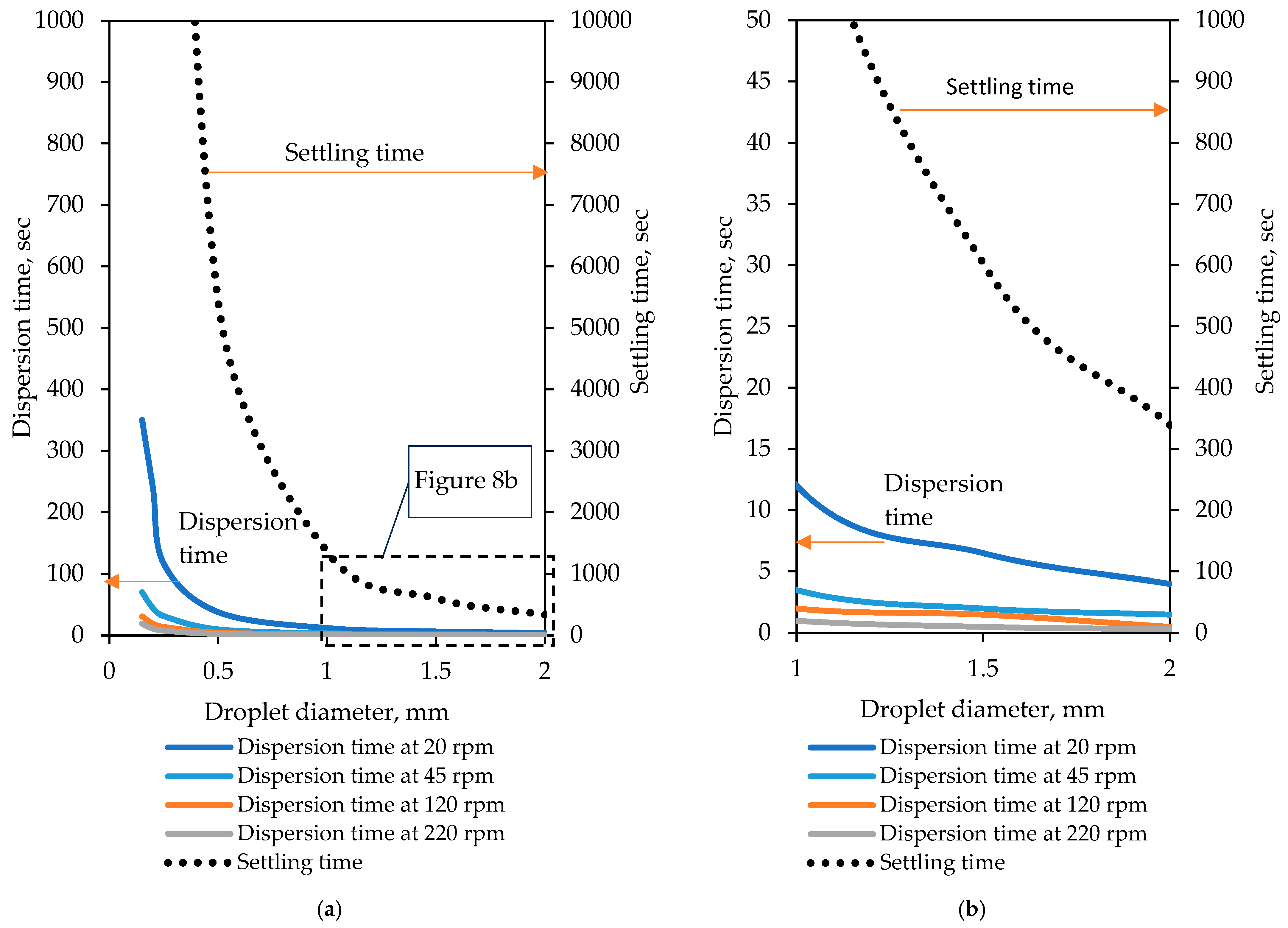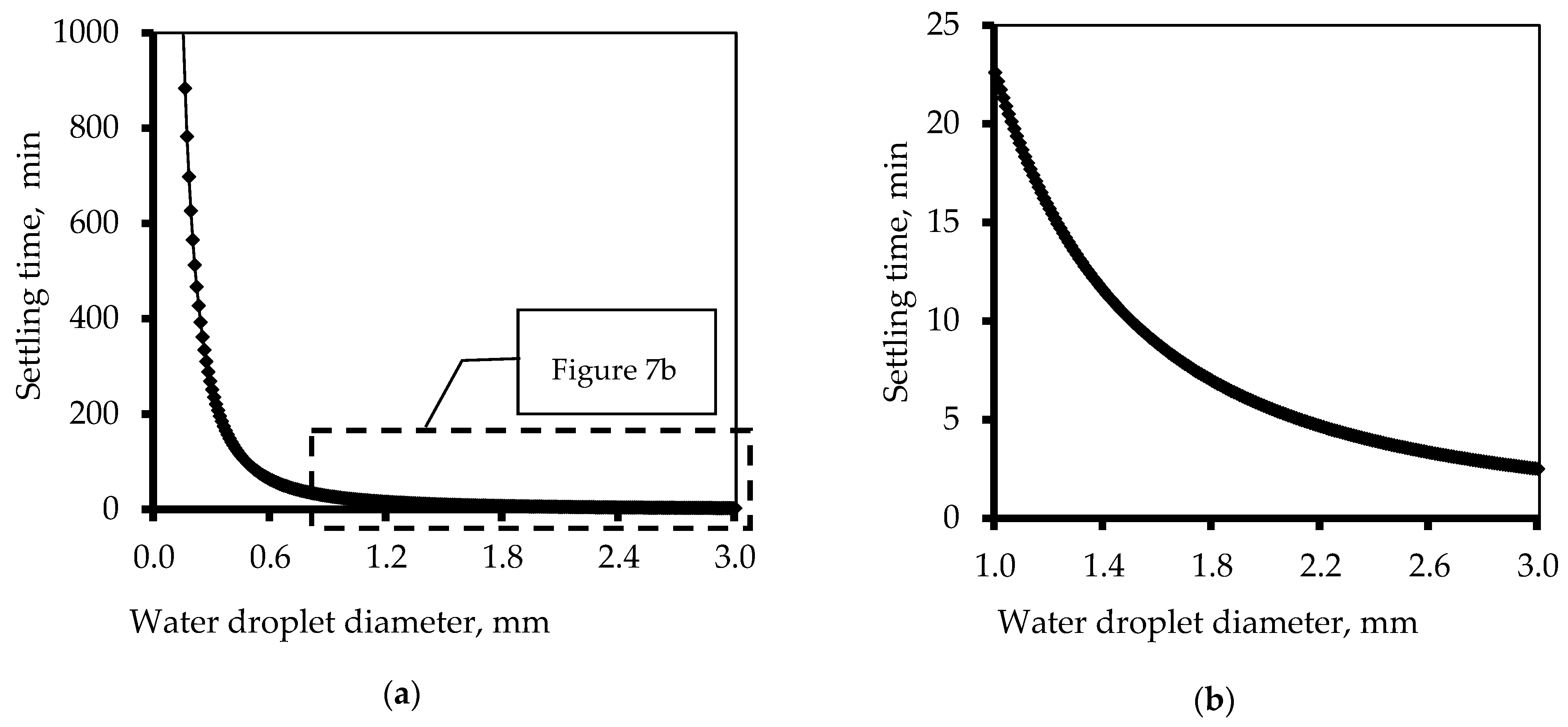 3.1. Comparison of Dispersion Time with the Settling Time of Water Globules