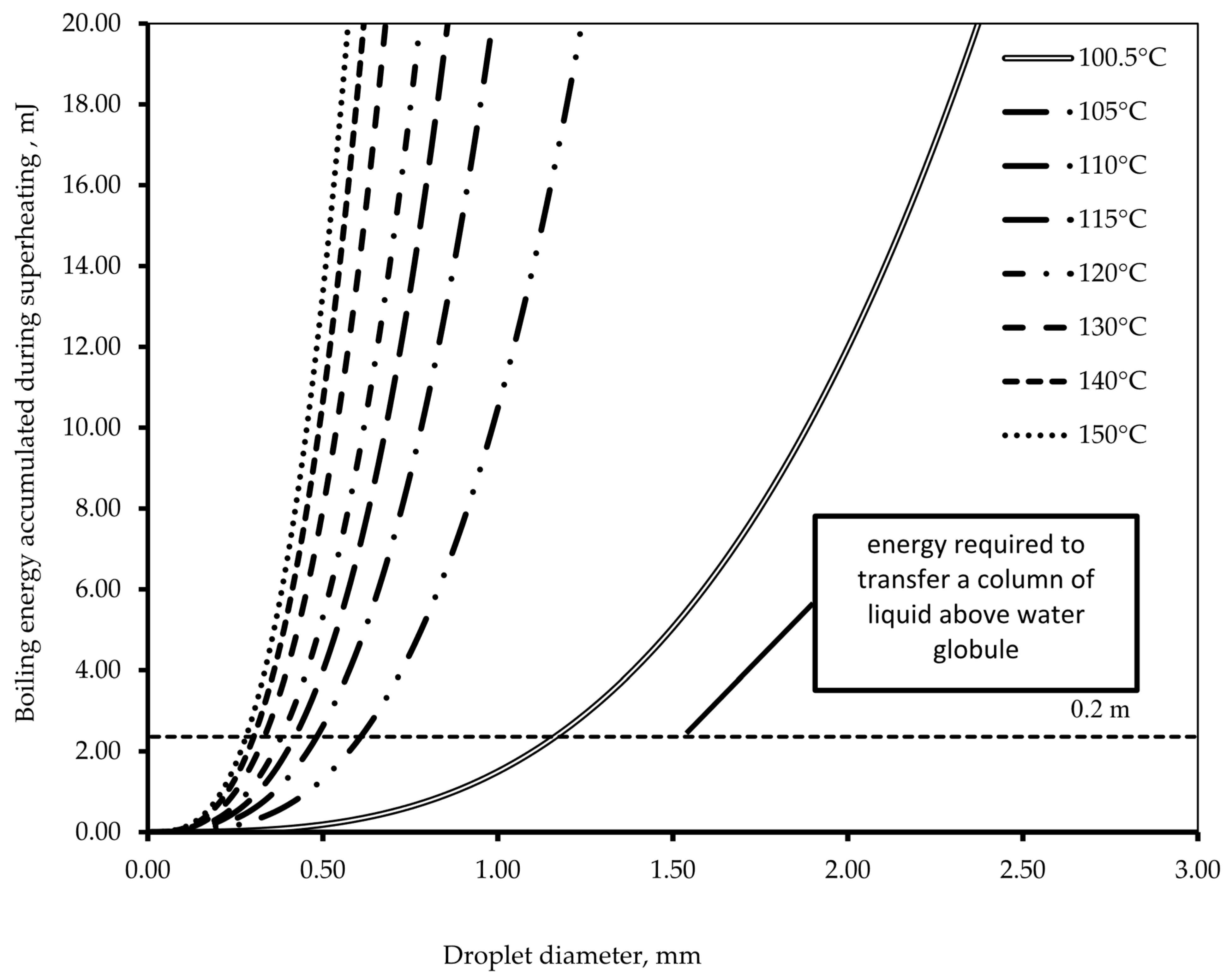 3.2. Comparison of the Energy Accumulated by the Superheated Liquid with the Energy Required to Transfer the Volume of the Emulsion