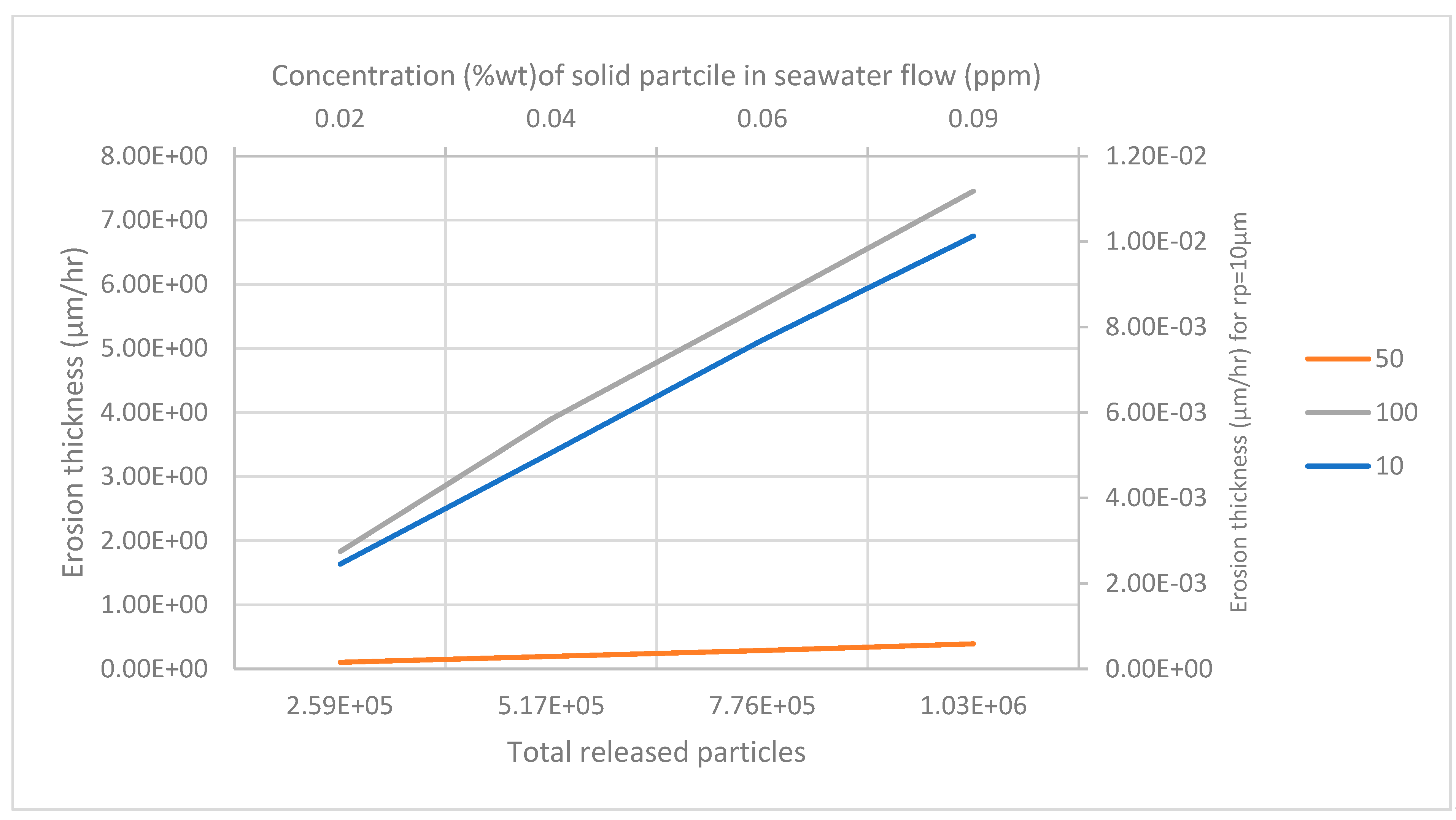 - Scenario 2: The variation in erosion thickness with particle flow rate.