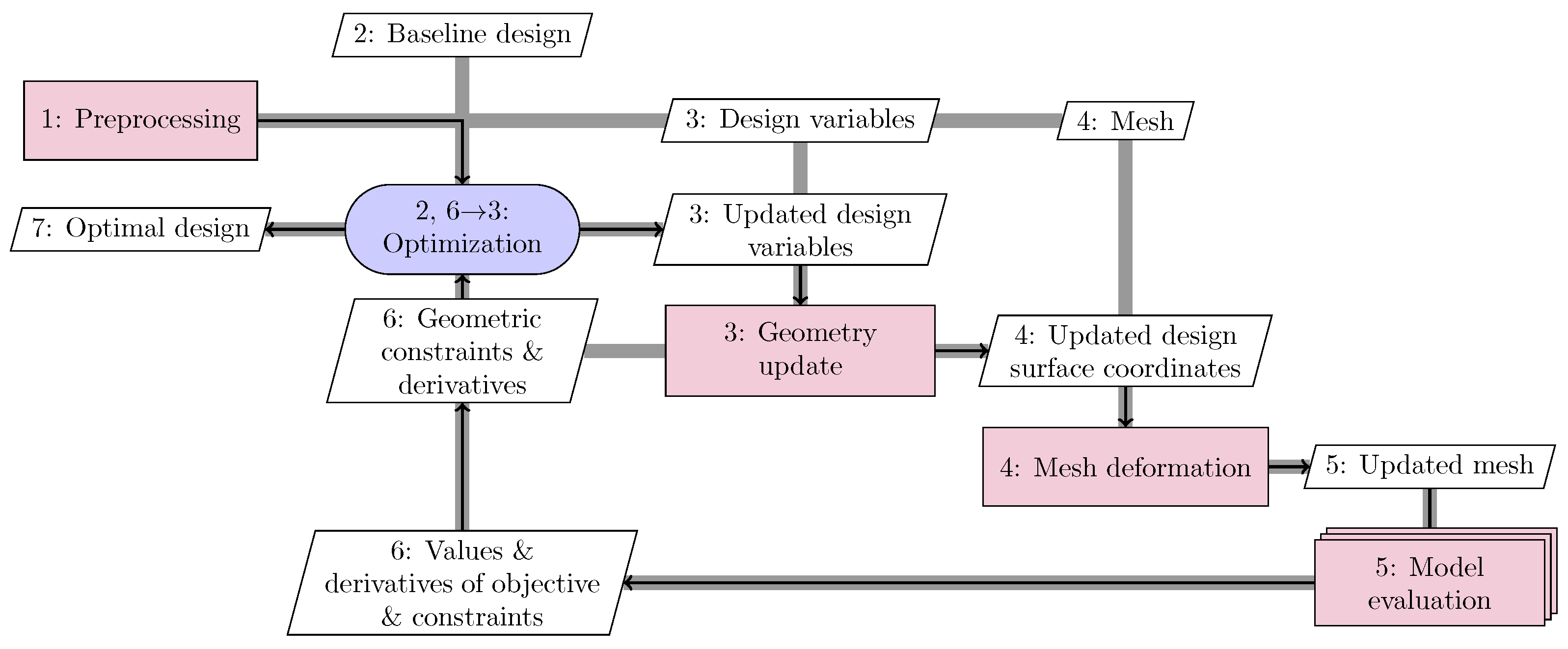 - Model evaluation: The simulation models compute the objective function and constraints at the deformed mesh. Corresponding gradient information is also expected if available and can be computed efficiently (e.g., through an adjoint solver).