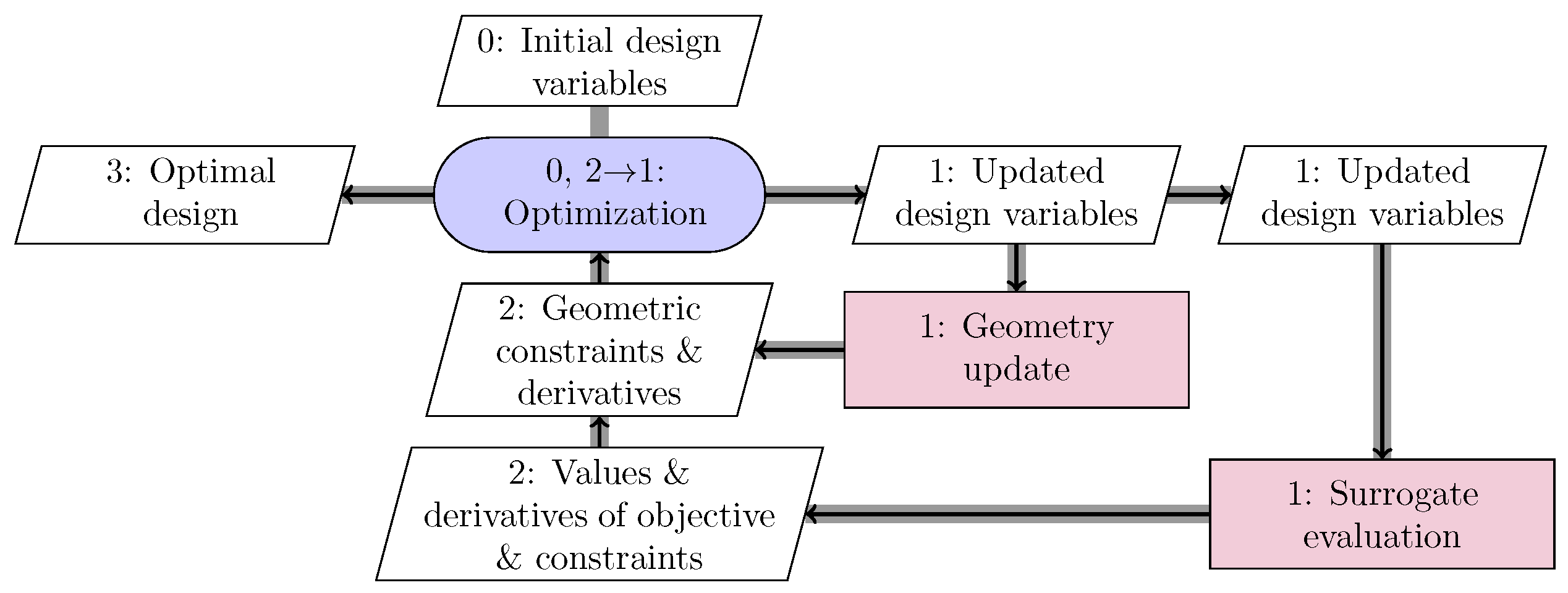 - Geometry update: The geometry parameterization module provides an updated design geometry based on the updated design variables.